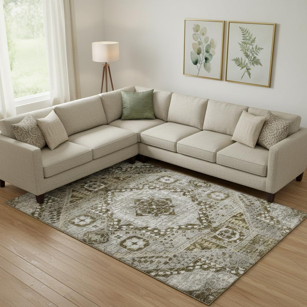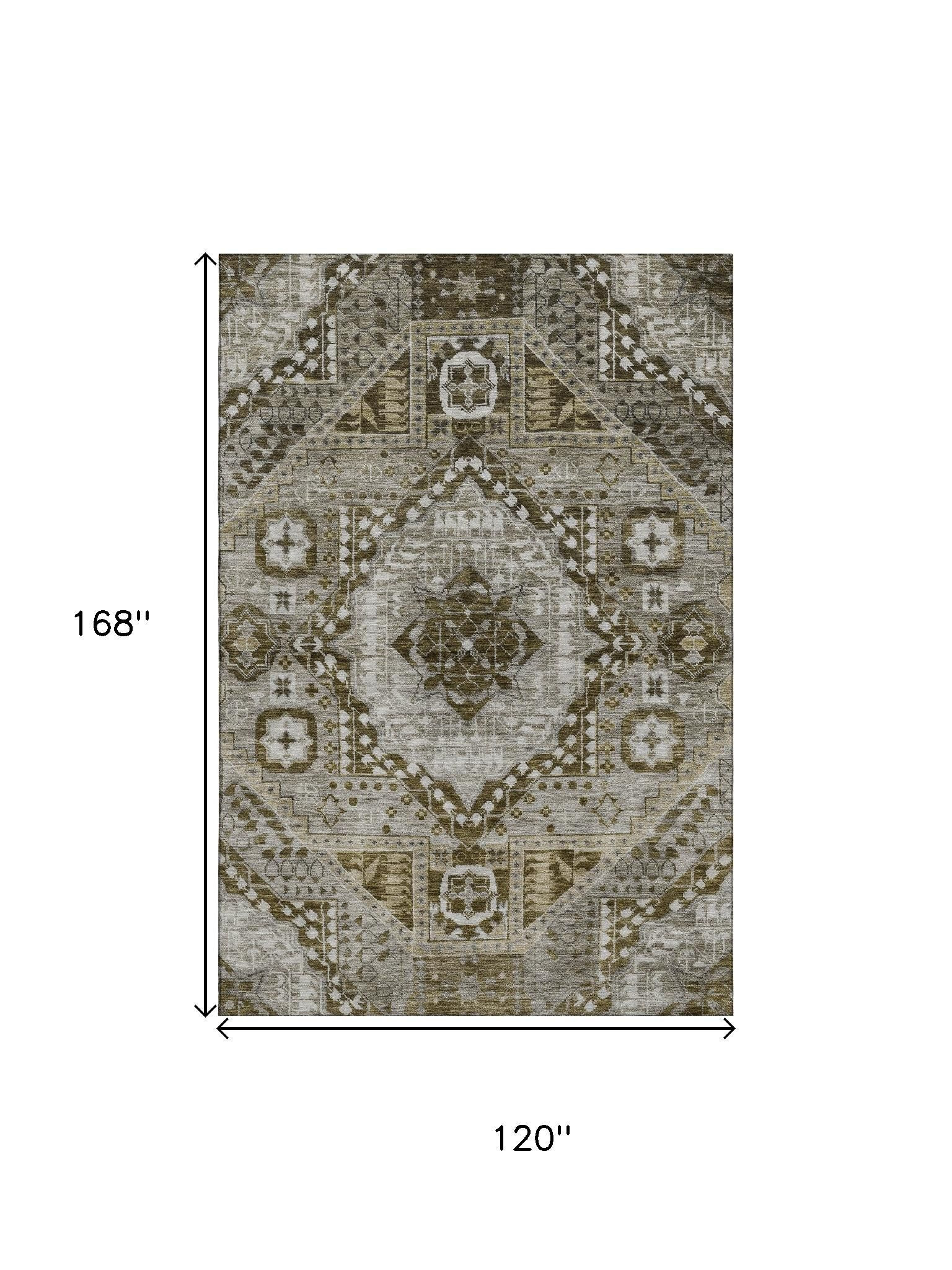 Add some artistry to your room with this 10-foot x 14-foot khaki ivory and brown diamond washable area rug with uv protection. Ideal for spaces with kids and pets, this rug is stain resistant to help repel dirt and spilled liquids. Built to last, this rug crafted from polyester fibers is known for its durability and long lasting appeal. Rugs are a great way to showcase your style, hide imperfections, warm your home and reduce noise. This larger sized, transitional styled rug is ready to create a focal point or statement piece in your room. 120.00-inch h x 168.00-inch w x 0.39-inch d.