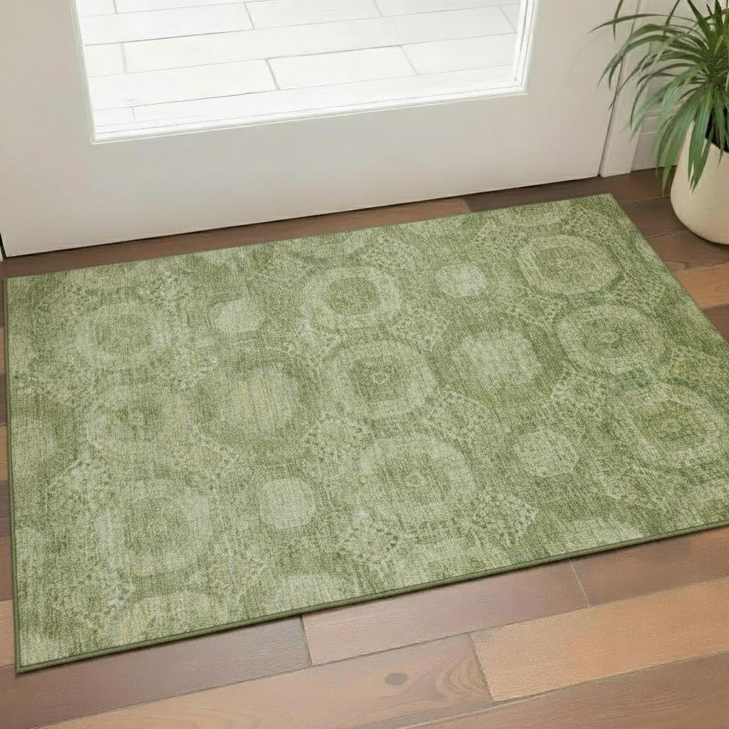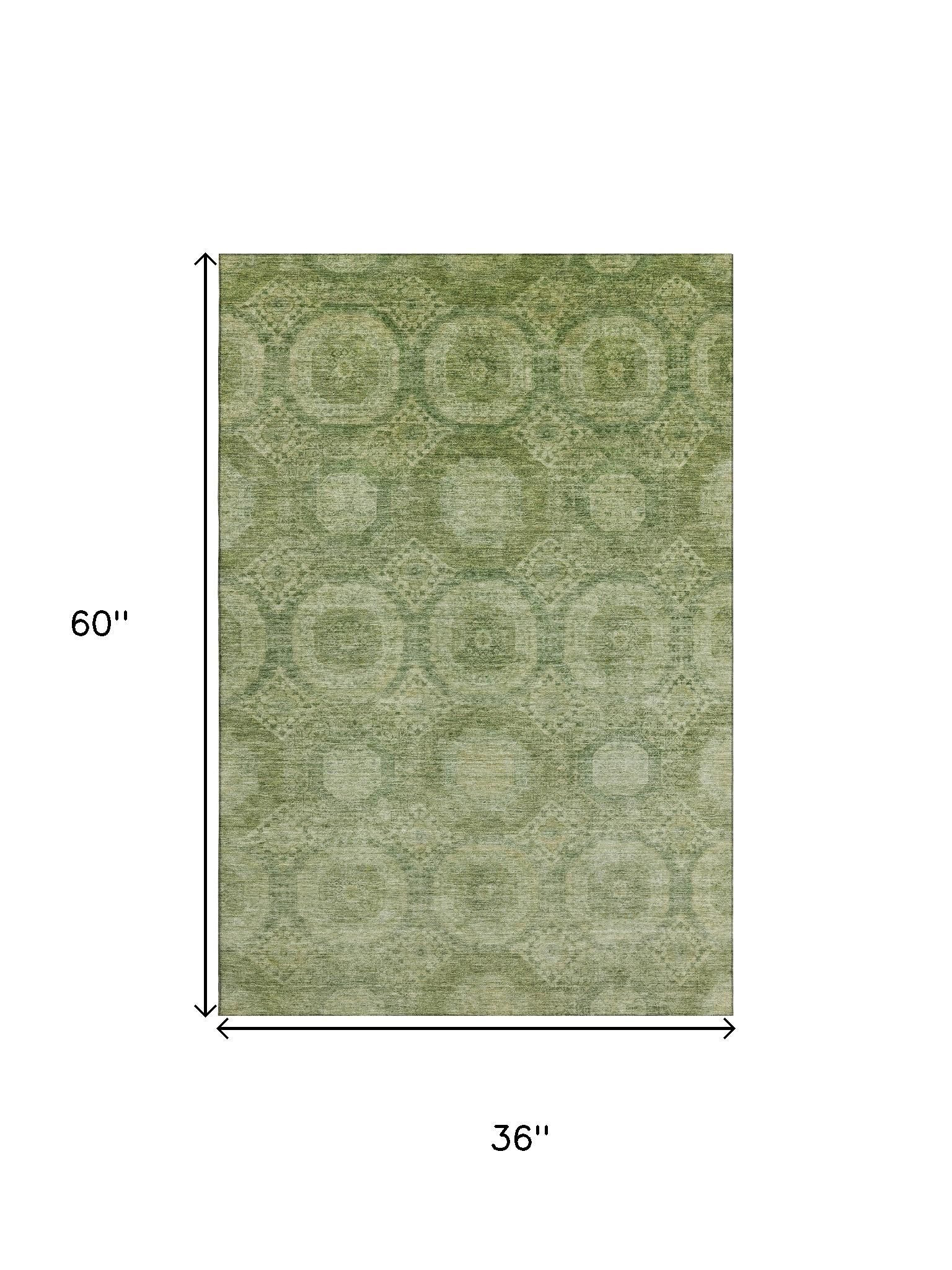 This 3-foot x 5-foot artichoke green and sage abstract geometric washable area rug with uv protection, is a great way to add warmth to a room. Ideal for spaces with kids and pets, this rug is stain resistant to help repel dirt and spilled liquids. Built to last, this rug crafted from polyester fibers is known for its durability and long lasting appeal. Rugs are a great way to showcase your style, hide imperfections, warm your home and reduce noise. This smaller sized, transitional styled rug is just what you need for your walkway, bedside, in front of door, cabinet, refrigerator, or chair. 36.00-inch h x 60.00-inch w x 0.39-inch d.