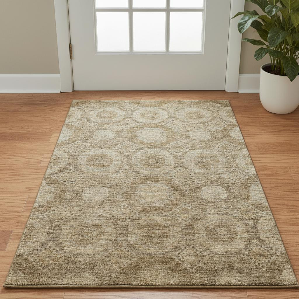 Add great coloration and comfortable texture to your space with this 3-foot x 5-foot brown and beige abstract geometric washable area rug with uv protection. Ideal for spaces with kids and pets, this rug is stain resistant to help repel dirt and spilled liquids. Built to last, this rug crafted from polyester fibers is known for its durability and long lasting appeal. Rugs are a great way to showcase your style, hide imperfections, warm your home and reduce noise. This smaller sized, transitional styled rug is just what you need for your walkway, bedside, in front of door, cabinet, refrigerator, or chair. 36.00-inch h x 60.00-inch w x 0.39-inch d.