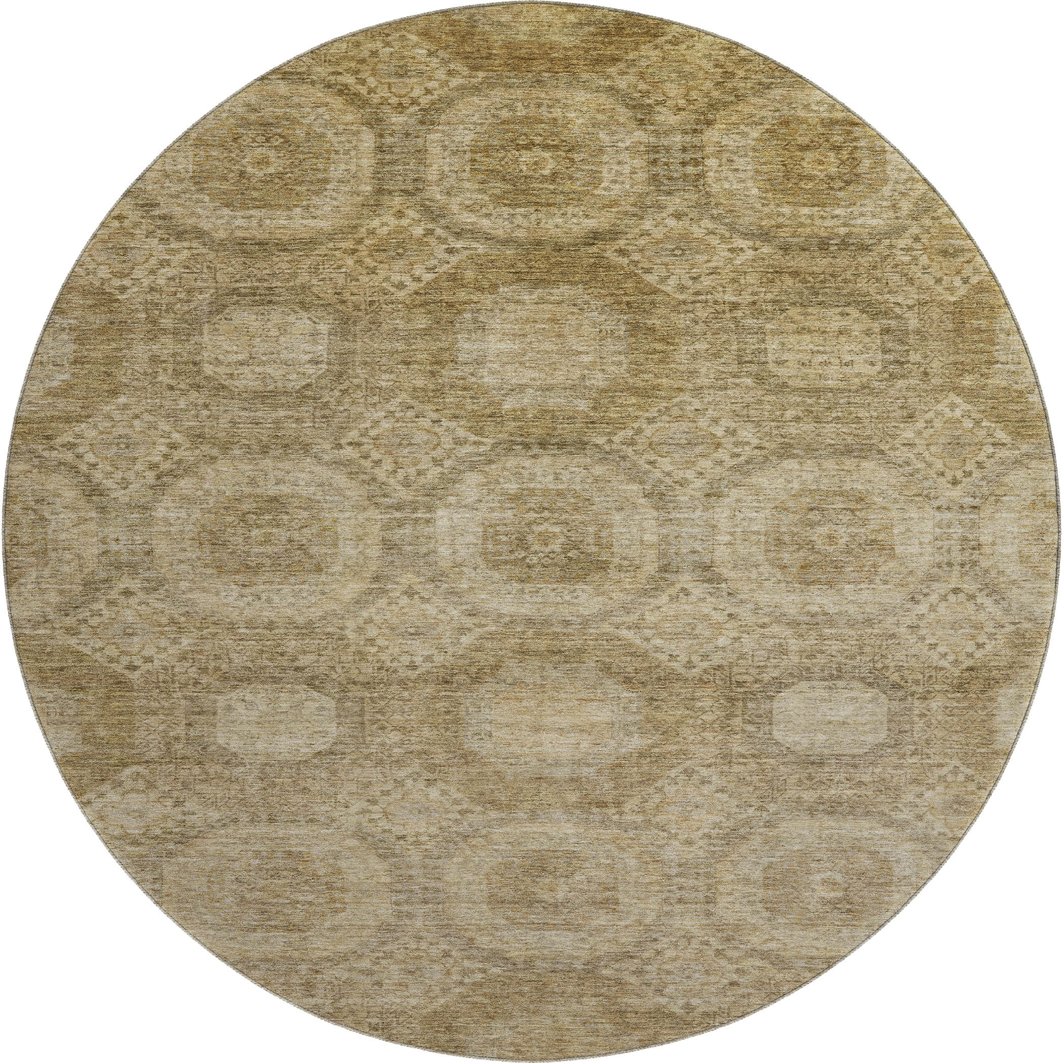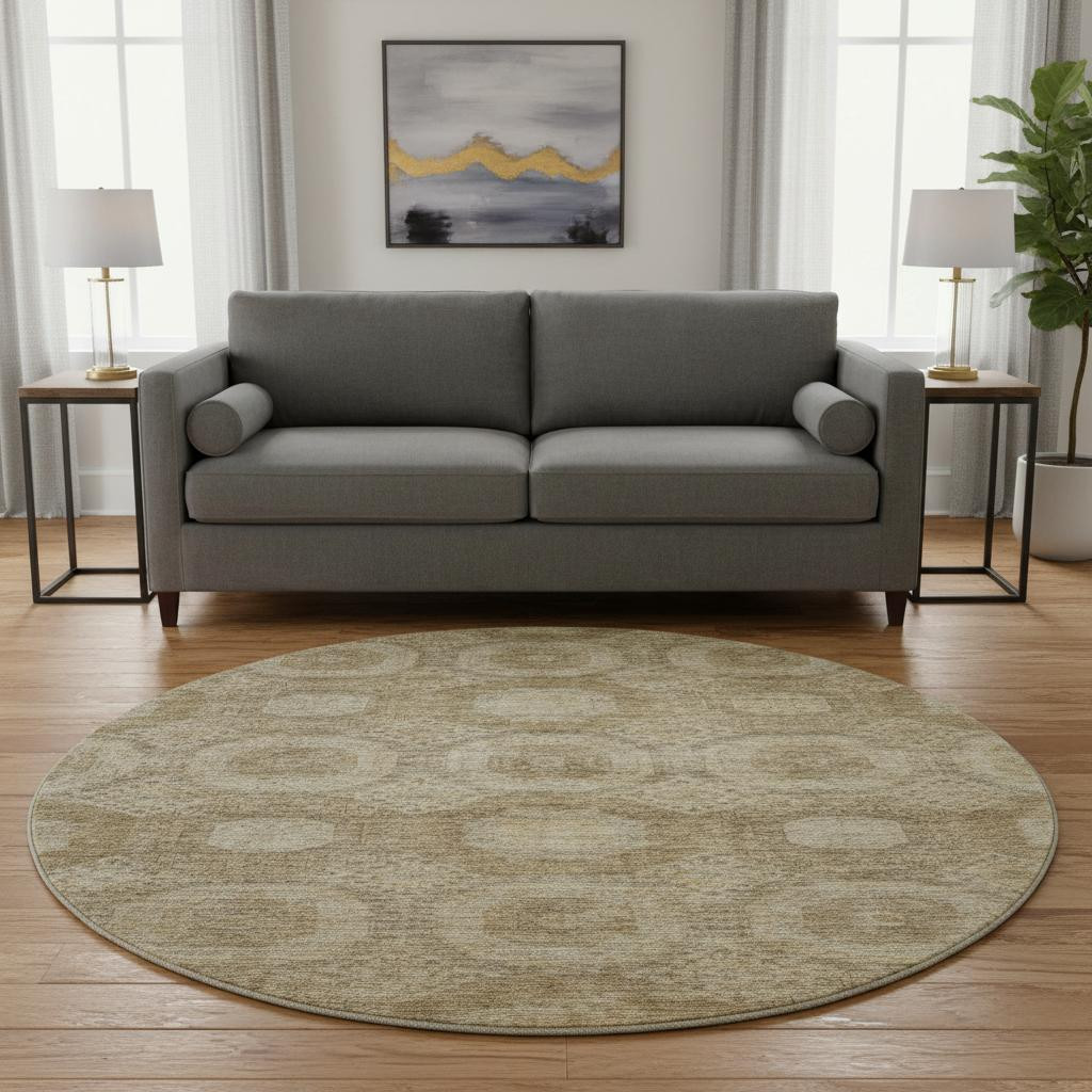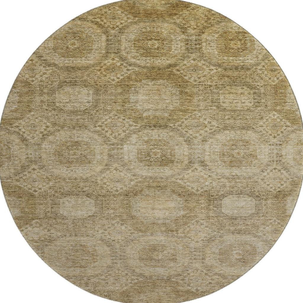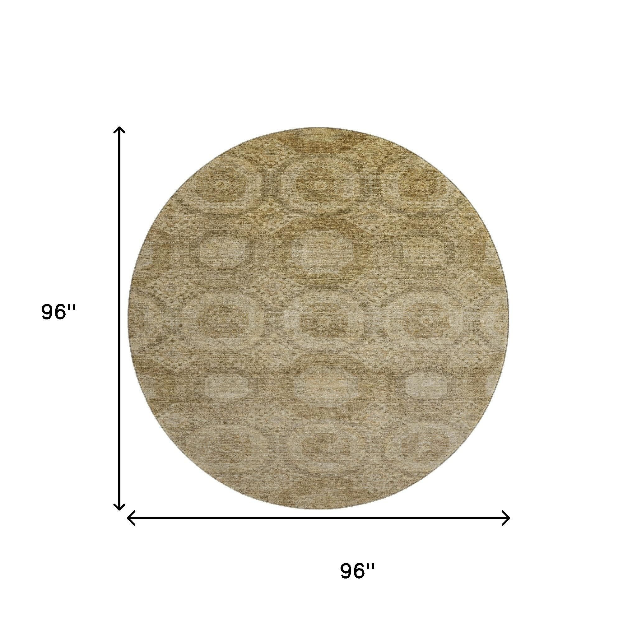 This 8-foot brown and beige abstract geometric washable round rug with uv protection, is a great way to add warmth to a room. Ideal for spaces with kids and pets, this rug is stain resistant to help repel dirt and spilled liquids. Built to last, this rug crafted from polyester fibers is known for its durability and long lasting appeal. Rugs are a great way to showcase your style, hide imperfections, warm your home and reduce noise. This larger sized, transitional styled rug is ready to create a focal point or statement piece in your room. 96.00-inch h x 96.00-inch w x 0.39-inch d.