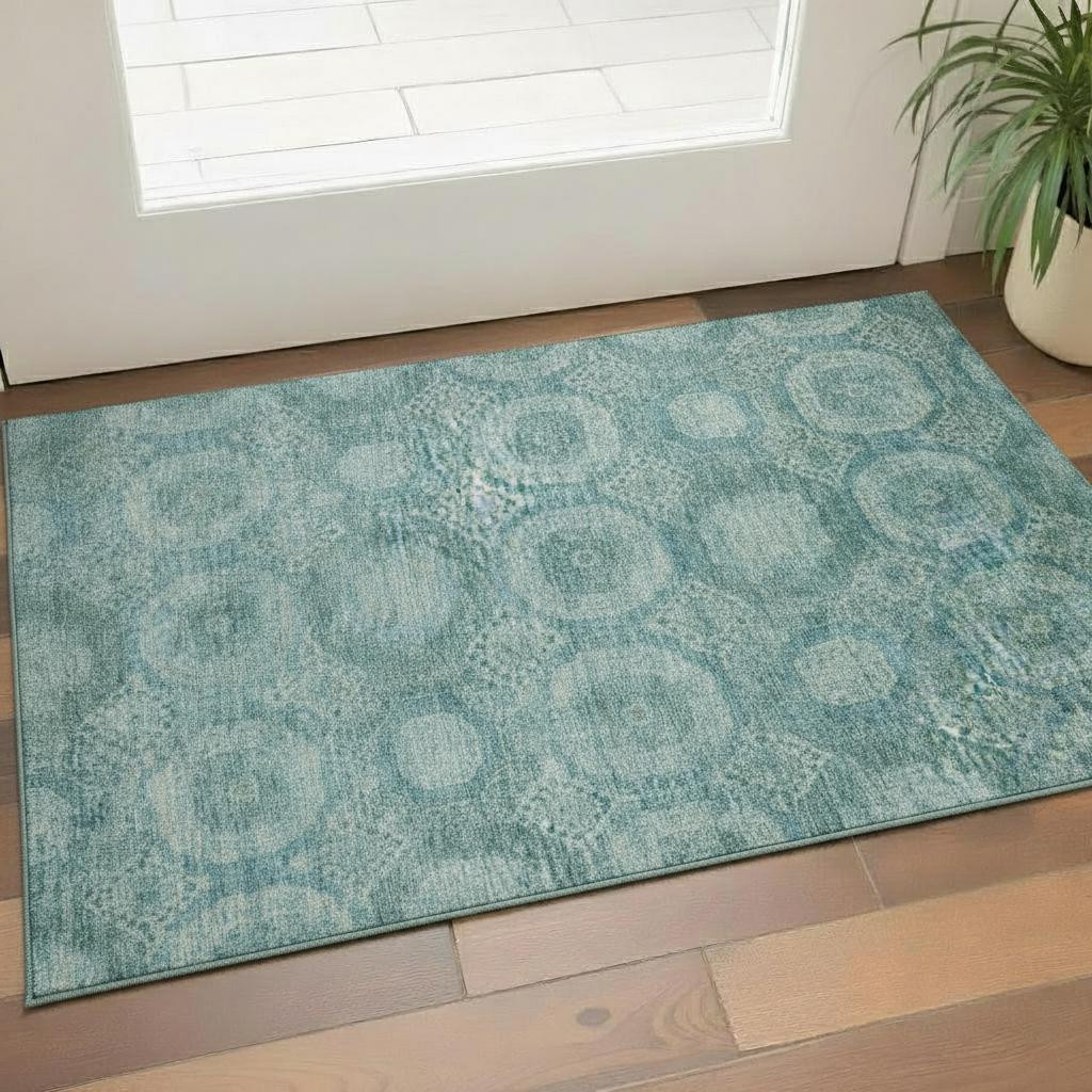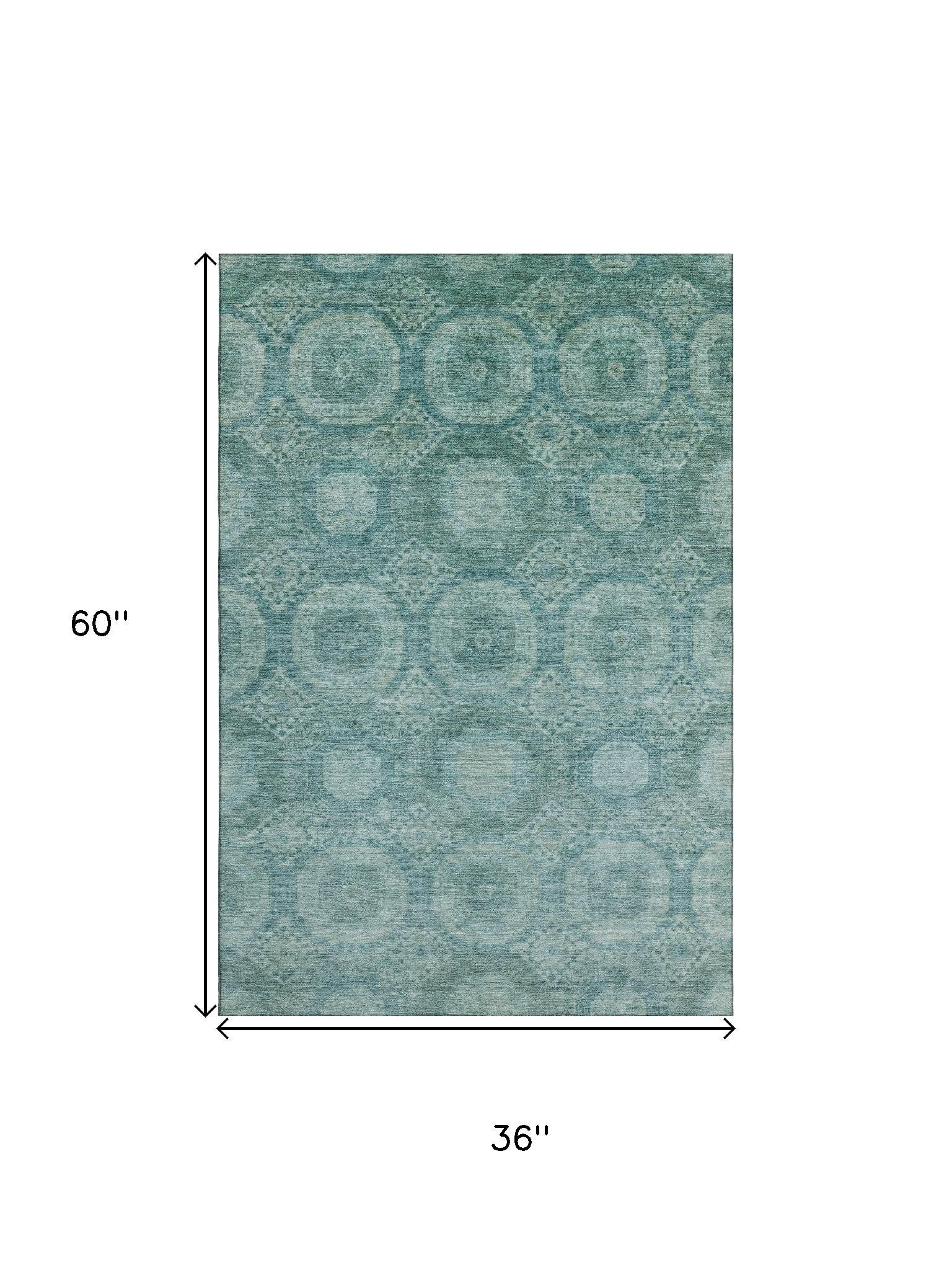 Set an inviting tone in your space with this 3-foot x 5-foot teal and aqua abstract geometric washable area rug with uv protection. Ideal for spaces with kids and pets, this rug is stain resistant to help repel dirt and spilled liquids. Built to last, this rug crafted from polyester fibers is known for its durability and long lasting appeal. Rugs are a great way to showcase your style, hide imperfections, warm your home and reduce noise. This smaller sized, transitional styled rug is just what you need for your walkway, bedside, in front of door, cabinet, refrigerator, or chair. 36.00-inch h x 60.00-inch w x 0.39-inch d.