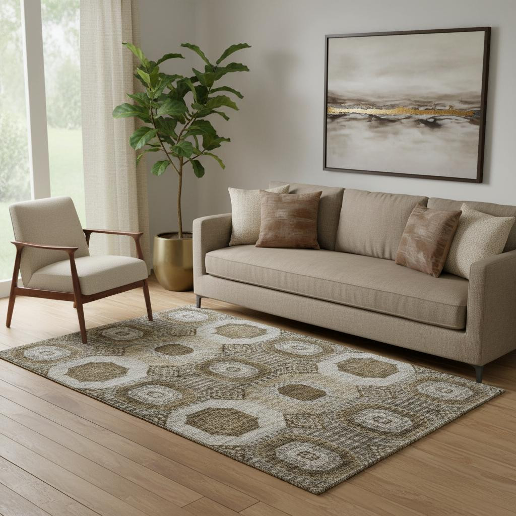 This 5-foot x 8-foot brown beige and taupe abstract geometric washable area rug with uv protection, is a great way to add warmth to a room. Ideal for spaces with kids and pets, this rug is stain resistant to help repel dirt and spilled liquids. Built to last, this rug crafted from polyester fibers is known for its durability and long lasting appeal. Rugs are a great way to showcase your style, hide imperfections, warm your home and reduce noise. This larger sized, transitional styled rug is ready to create a focal point or statement piece in your room. 60.00-inch h x 90.00-inch w x 0.39-inch d.