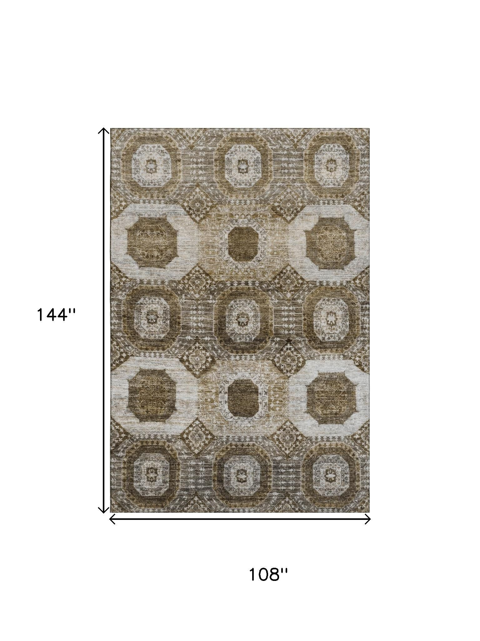 This 9-foot x 12-foot brown beige and taupe abstract geometric washable area rug with uv protection, is a great way to add warmth to a room. Ideal for spaces with kids and pets, this rug is stain resistant to help repel dirt and spilled liquids. Built to last, this rug crafted from polyester fibers is known for its durability and long lasting appeal. Rugs are a great way to showcase your style, hide imperfections, warm your home and reduce noise. This larger sized, transitional styled rug is ready to create a focal point or statement piece in your room. 108.00-inch h x 144.00-inch w x 0.39-inch d.