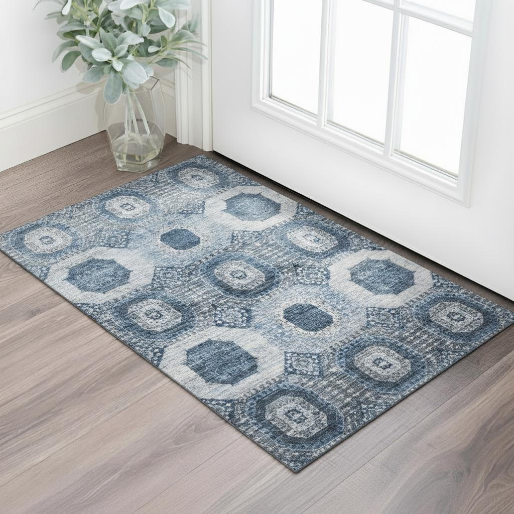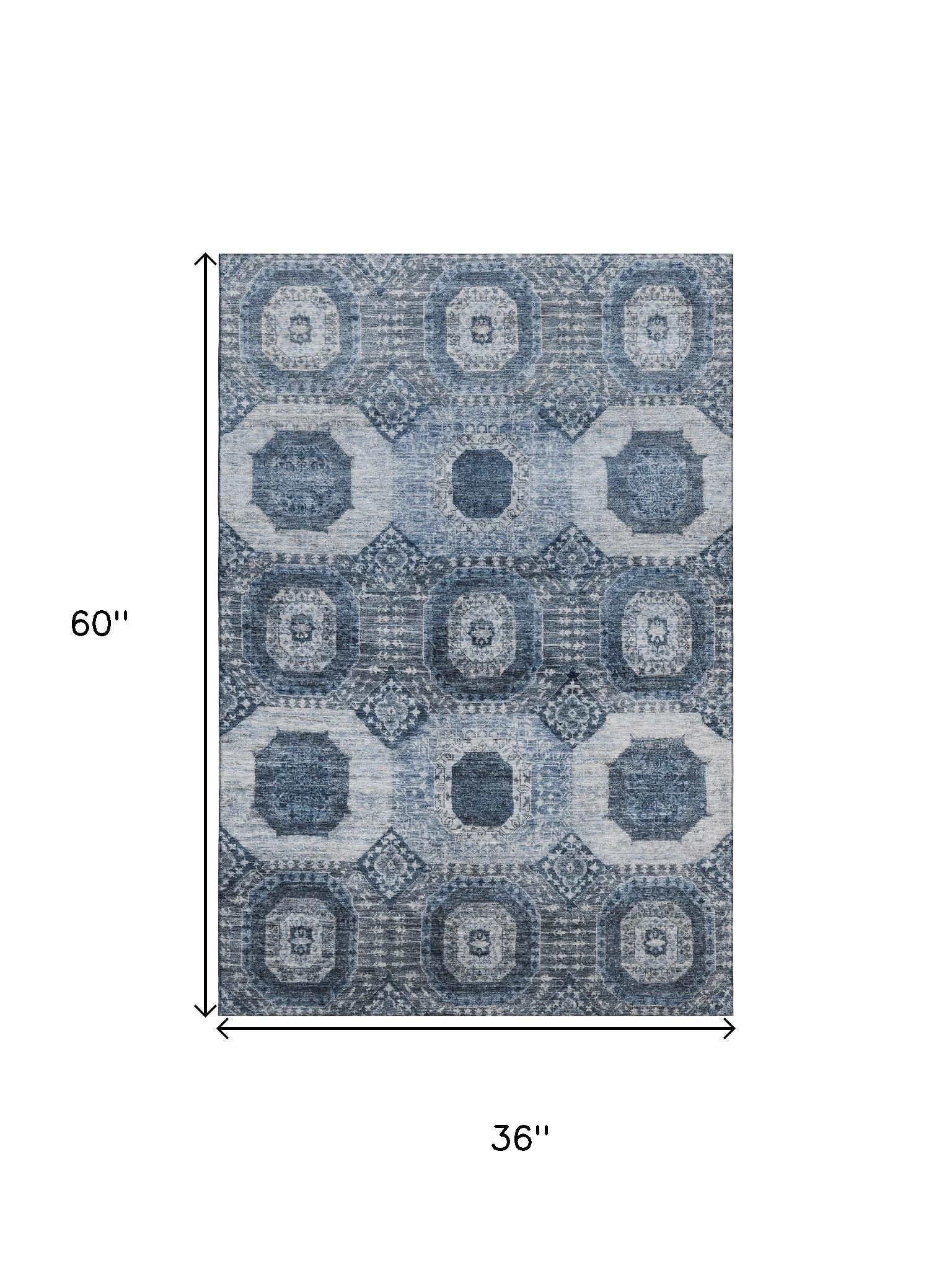 This 3-foot x 5-foot blue and ivory abstract geometric washable area rug with uv protection, is a great way to add warmth to a room. Ideal for spaces with kids and pets, this rug is stain resistant to help repel dirt and spilled liquids. Built to last, this rug crafted from polyester fibers is known for its durability and long lasting appeal. Rugs are a great way to showcase your style, hide imperfections, warm your home and reduce noise. This smaller sized, transitional styled rug is just what you need for your walkway, bedside, in front of door, cabinet, refrigerator, or chair. 36.00-inch h x 60.00-inch w x 0.39-inch d.