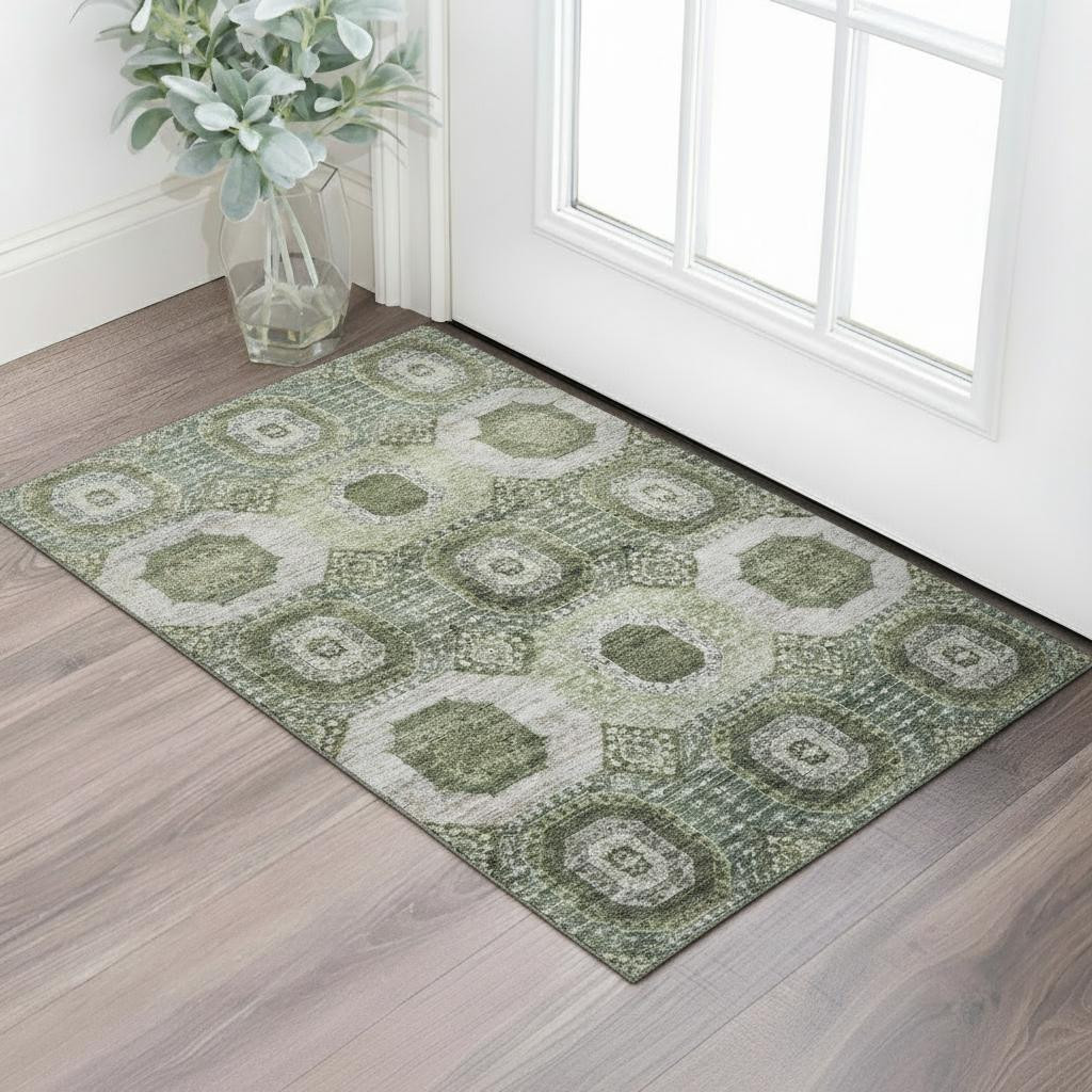 Add great coloration and comfortable texture to your space with this 3-foot x 5-foot olive green and beige abstract geometric washable area rug with uv protection. Ideal for spaces with kids and pets, this rug is stain resistant to help repel dirt and spilled liquids. Built to last, this rug crafted from polyester fibers is known for its durability and long lasting appeal. Rugs are a great way to showcase your style, hide imperfections, warm your home and reduce noise. This smaller sized, transitional styled rug is just what you need for your walkway, bedside, in front of door, cabinet, refrigerator, or chair. 36.00-inch h x 60.00-inch w x 0.39-inch d.