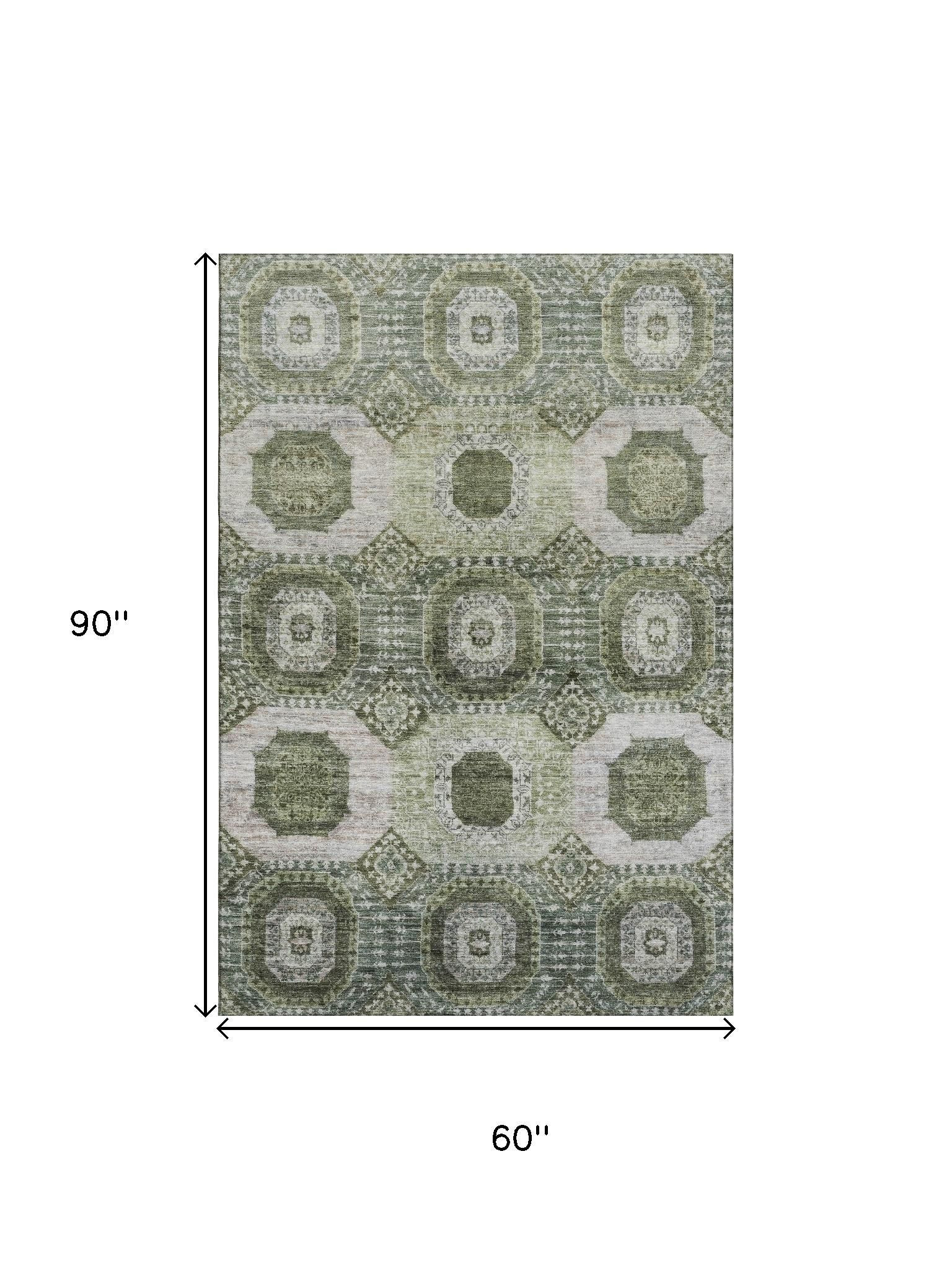 Add some artistry to your room with this 5-foot x 8-foot olive green and beige abstract geometric washable area rug with uv protection. Ideal for spaces with kids and pets, this rug is stain resistant to help repel dirt and spilled liquids. Built to last, this rug crafted from polyester fibers is known for its durability and long lasting appeal. Rugs are a great way to showcase your style, hide imperfections, warm your home and reduce noise. This larger sized, transitional styled rug is ready to create a focal point or statement piece in your room. 60.00-inch h x 90.00-inch w x 0.39-inch d.