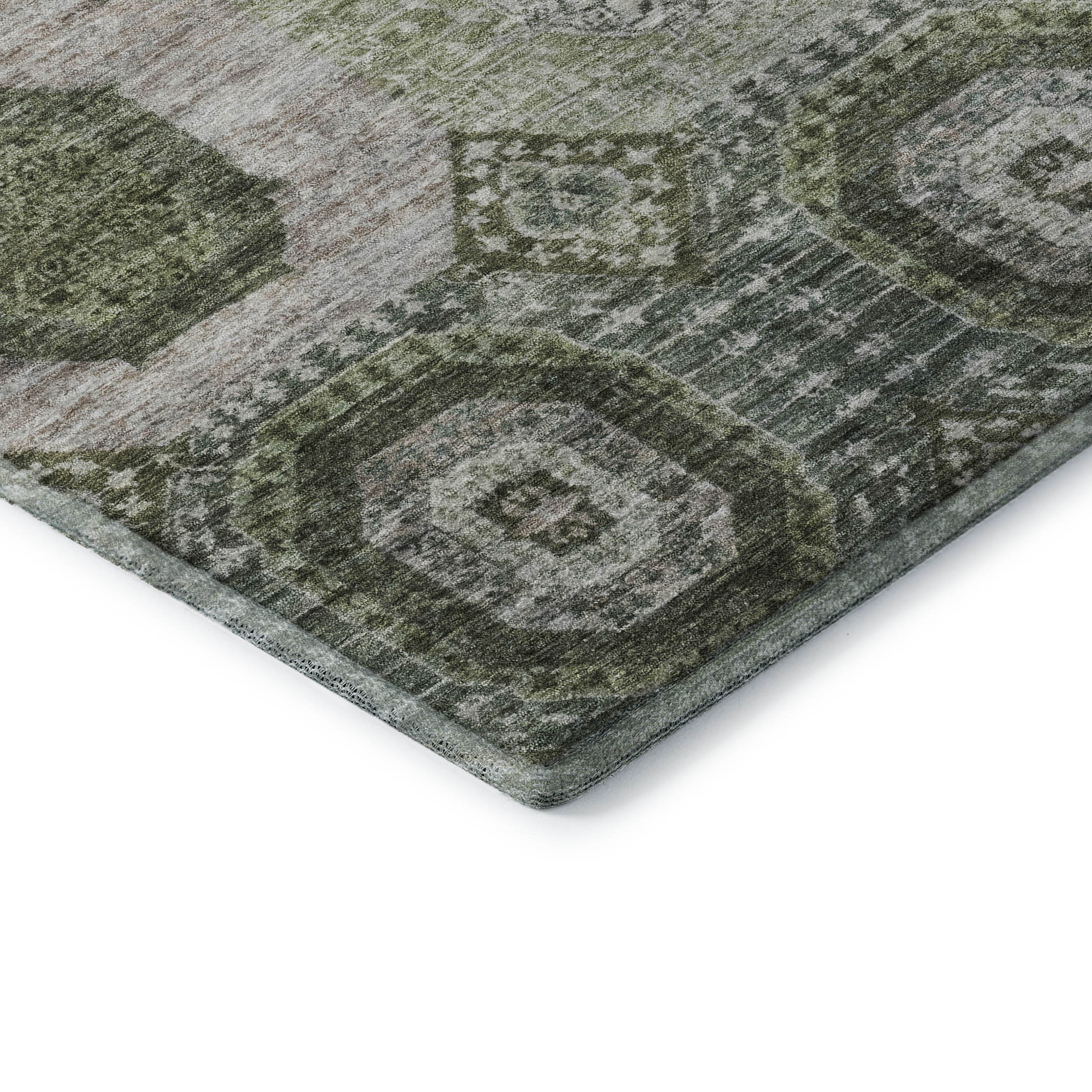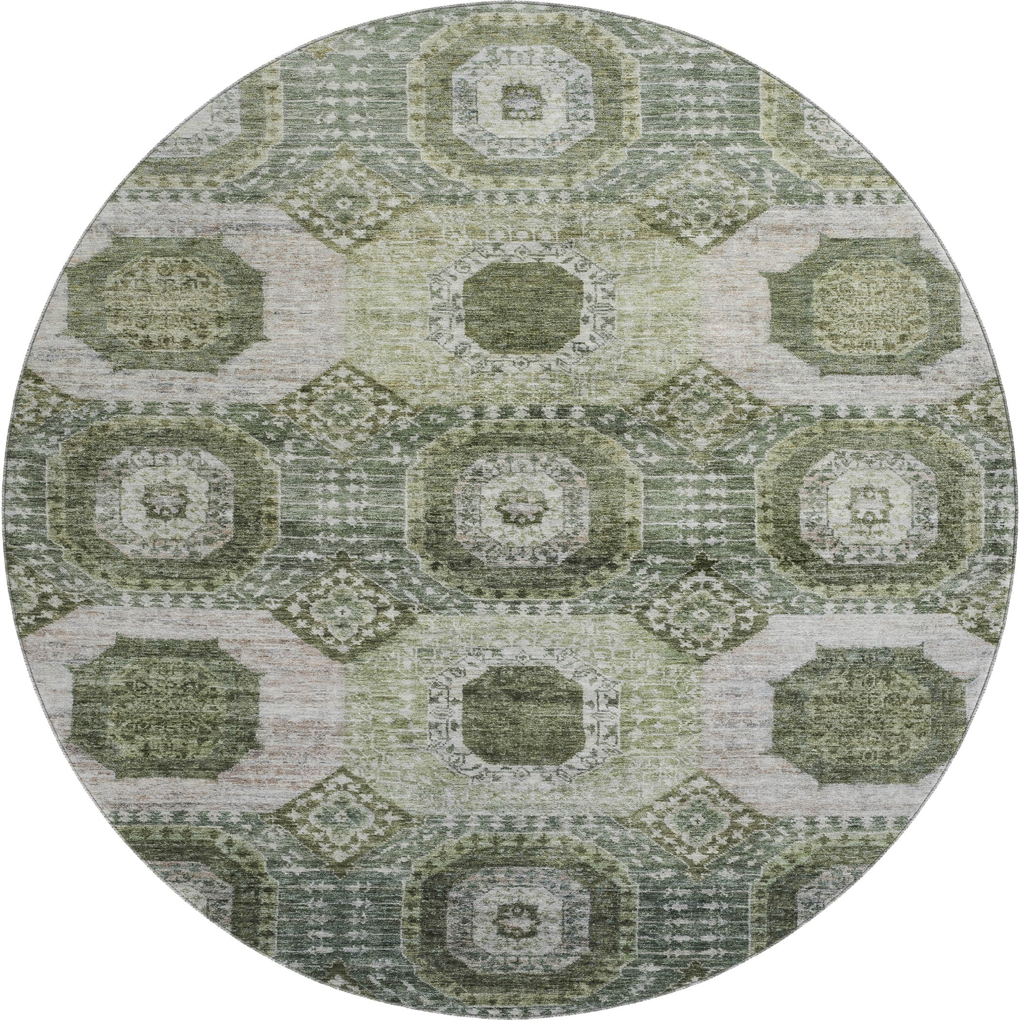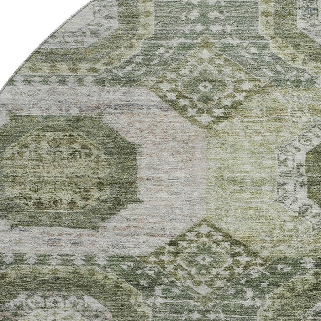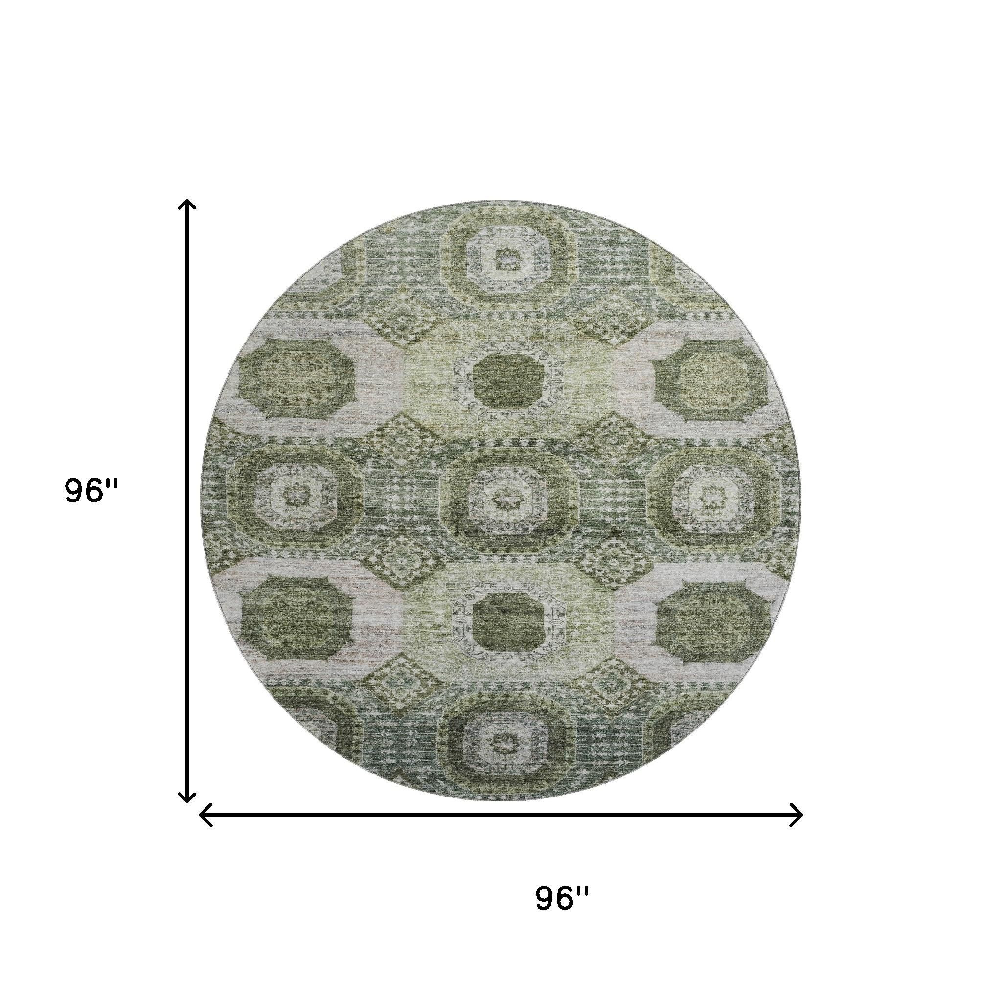 This 8-foot olive green and beige abstract geometric washable round rug with uv protection, is a great way to add warmth to a room. Ideal for spaces with kids and pets, this rug is stain resistant to help repel dirt and spilled liquids. Built to last, this rug crafted from polyester fibers is known for its durability and long lasting appeal. Rugs are a great way to showcase your style, hide imperfections, warm your home and reduce noise. This larger sized, transitional styled rug is ready to create a focal point or statement piece in your room. 96.00-inch h x 96.00-inch w x 0.39-inch d.