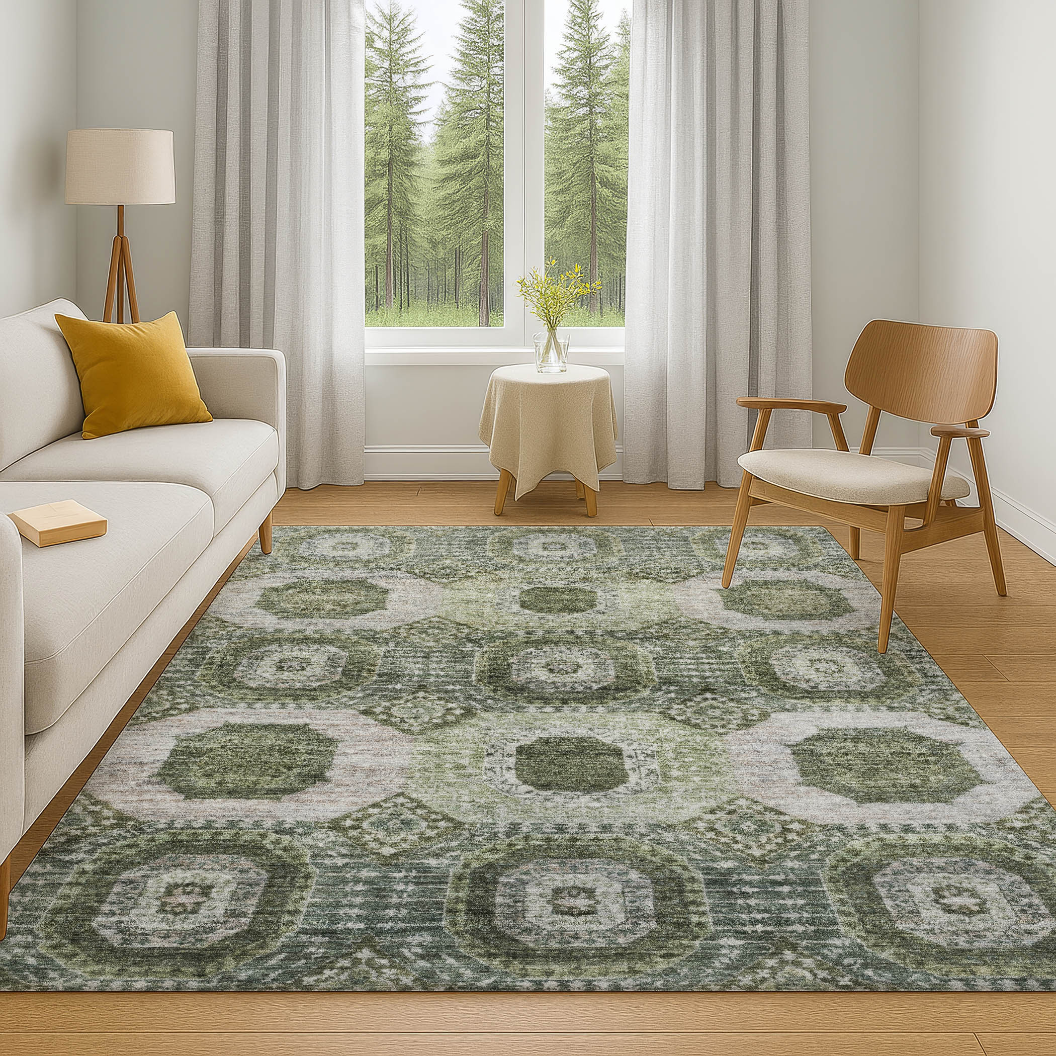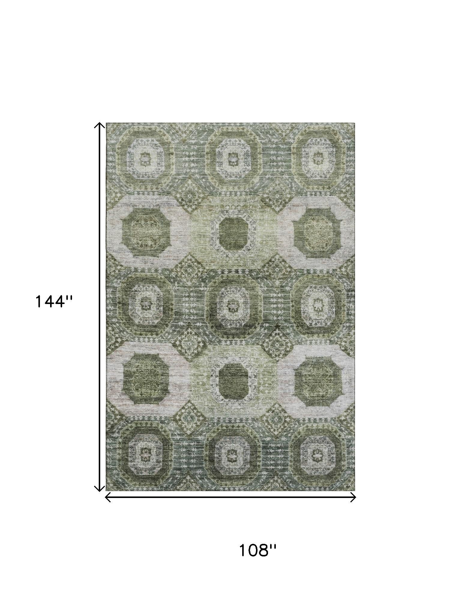 Add some artistry to your room with this 9-foot x 12-foot olive green and beige abstract geometric washable area rug with uv protection. Ideal for spaces with kids and pets, this rug is stain resistant to help repel dirt and spilled liquids. Built to last, this rug crafted from polyester fibers is known for its durability and long lasting appeal. Rugs are a great way to showcase your style, hide imperfections, warm your home and reduce noise. This larger sized, transitional styled rug is ready to create a focal point or statement piece in your room. 108.00-inch h x 144.00-inch w x 0.39-inch d.
