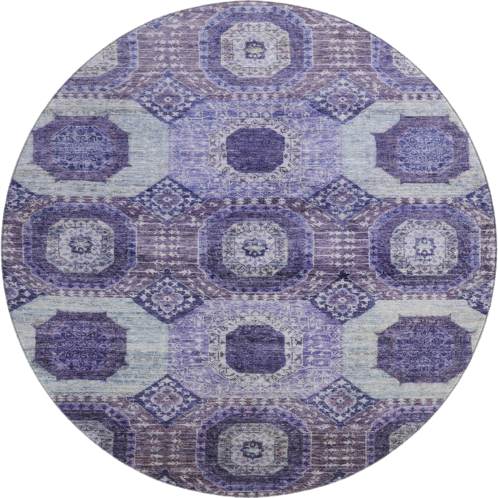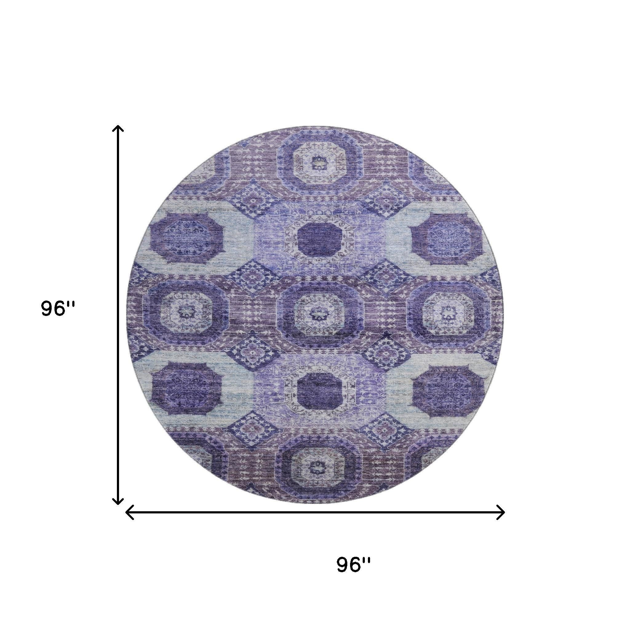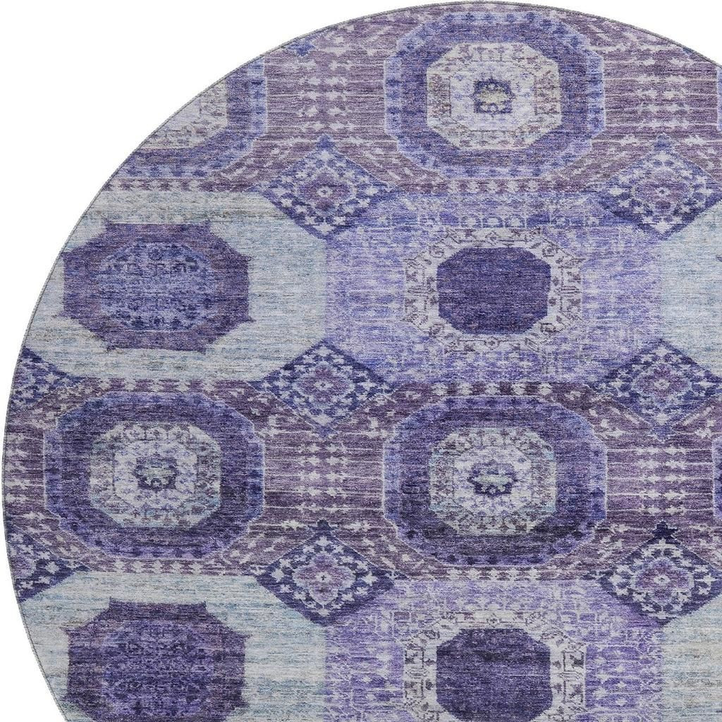 Add some artistry to your room with this 8-foot purple and silver abstract geometric washable round rug with uv protection. Ideal for spaces with kids and pets, this rug is stain resistant to help repel dirt and spilled liquids. Built to last, this rug crafted from polyester fibers is known for its durability and long lasting appeal. Rugs are a great way to showcase your style, hide imperfections, warm your home and reduce noise. This larger sized, transitional styled rug is ready to create a focal point or statement piece in your room. 96.00-inch h x 96.00-inch w x 0.39-inch d.