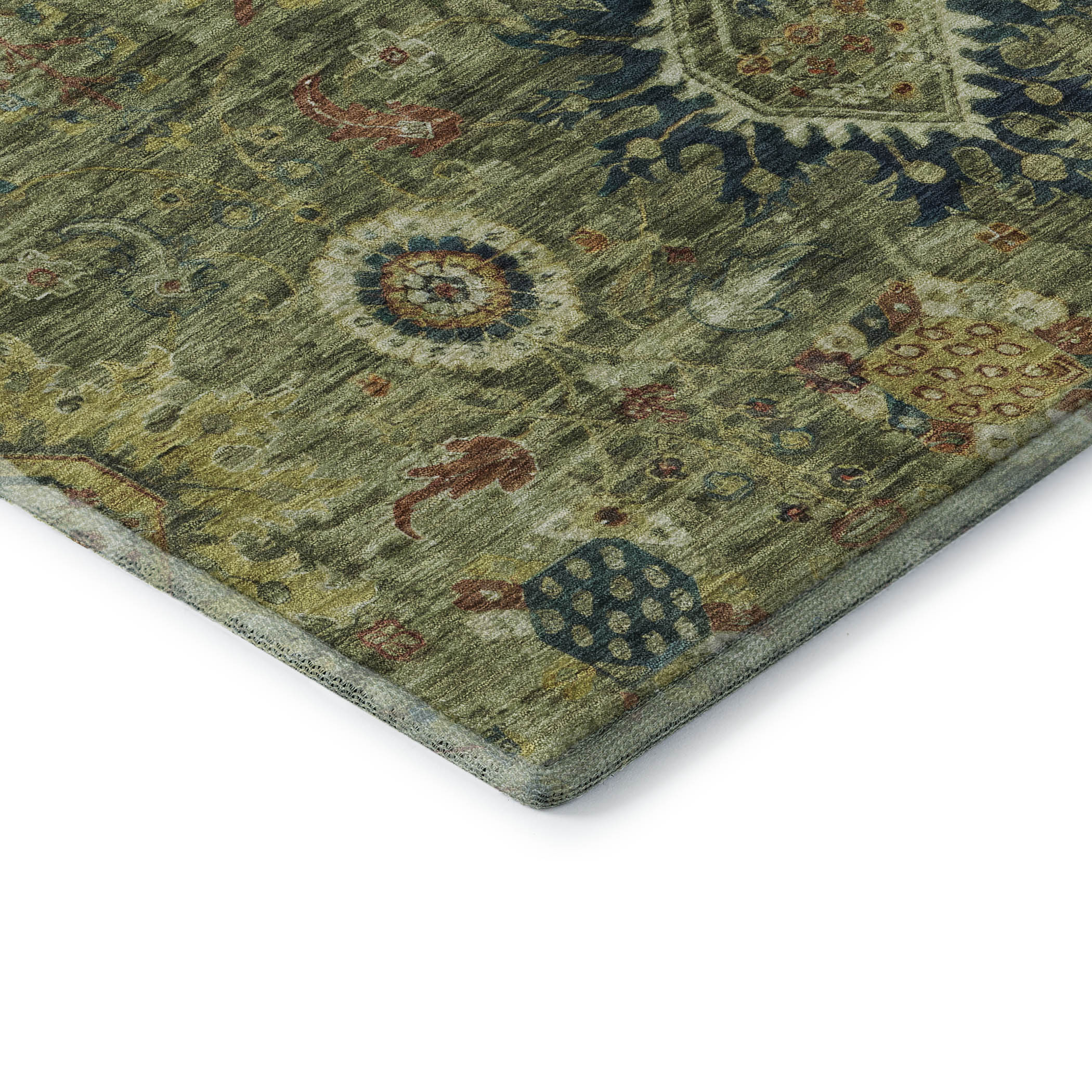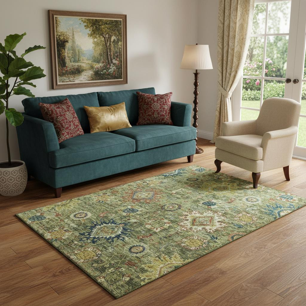 This 5-foot x 8-foot artichoke green rust and gold oriental washable area rug with uv protection, is a great way to add warmth to a room. Ideal for spaces with kids and pets, this rug is stain resistant to help repel dirt and spilled liquids. Built to last, this rug crafted from polyester fibers is known for its durability and long lasting appeal. Rugs are a great way to showcase your style, hide imperfections, warm your home and reduce noise. This larger sized, traditional styled rug is ready to create a focal point or statement piece in your room. 60.00-inch h x 90.00-inch w x 0.39-inch d.
