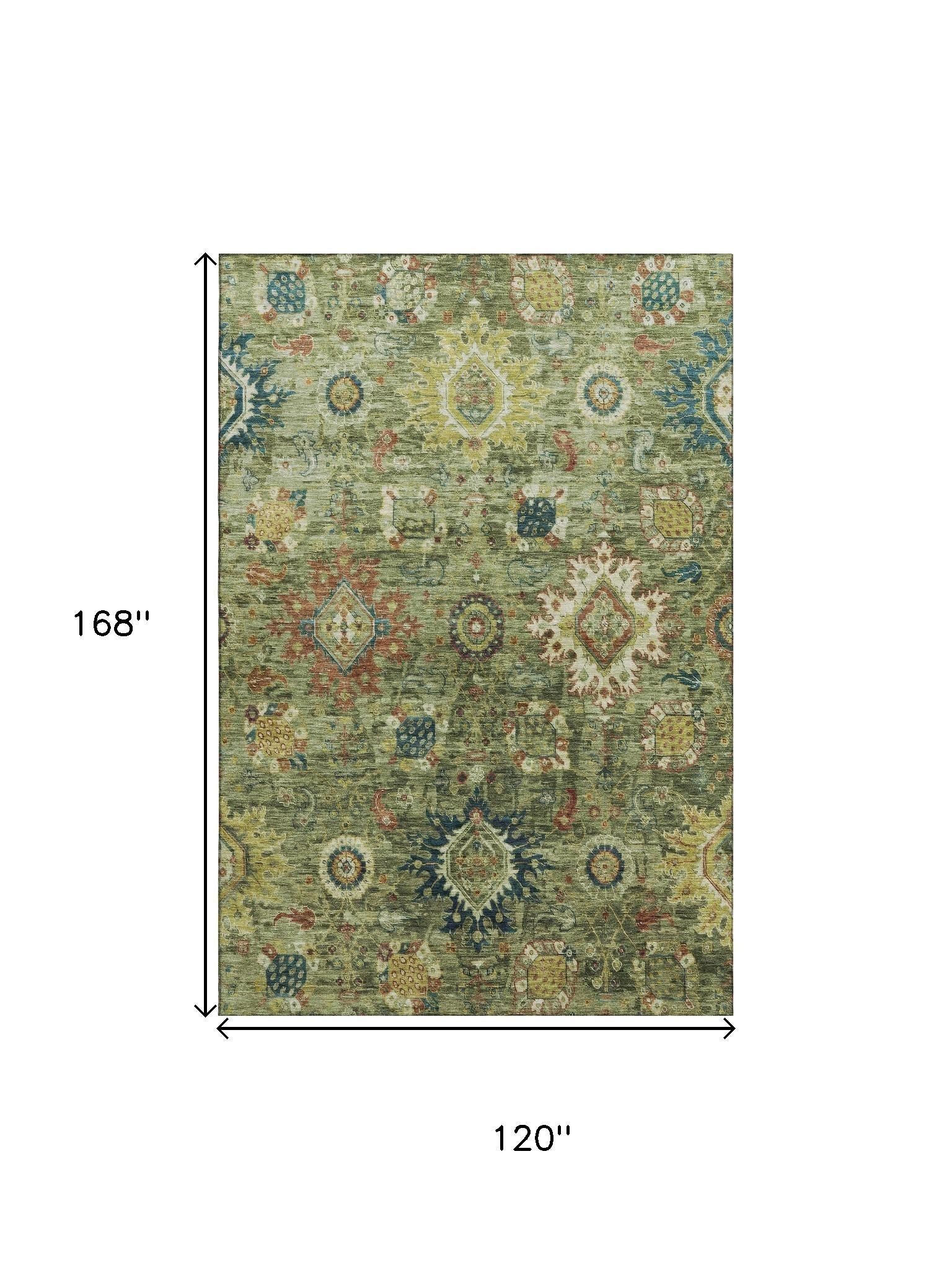 Add some artistry to your room with this 10-foot x 14-foot artichoke green rust and gold oriental washable area rug with uv protection. Ideal for spaces with kids and pets, this rug is stain resistant to help repel dirt and spilled liquids. Built to last, this rug crafted from polyester fibers is known for its durability and long lasting appeal. Rugs are a great way to showcase your style, hide imperfections, warm your home and reduce noise. This larger sized, traditional styled rug is ready to create a focal point or statement piece in your room. 120.00-inch h x 168.00-inch w x 0.39-inch d.