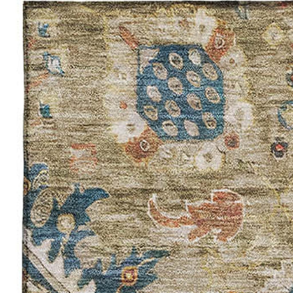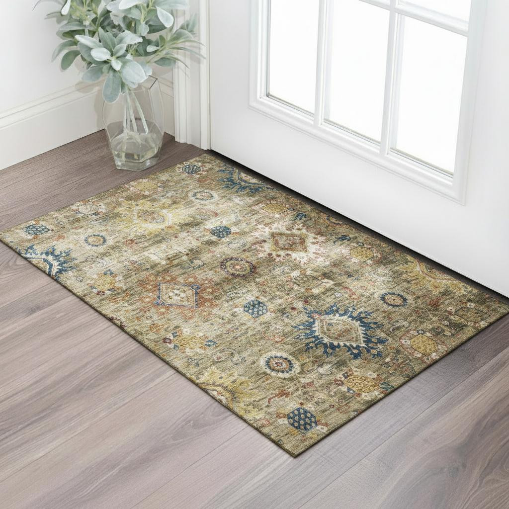 This 3-foot x 5-foot brown blue and gold oriental washable area rug with uv protection, is a great way to add warmth to a room. Ideal for spaces with kids and pets, this rug is stain resistant to help repel dirt and spilled liquids. Built to last, this rug crafted from polyester fibers is known for its durability and long lasting appeal. Rugs are a great way to showcase your style, hide imperfections, warm your home and reduce noise. This smaller sized, traditional styled rug is just what you need for your walkway, bedside, in front of door, cabinet, refrigerator, or chair. 36.00-inch h x 60.00-inch w x 0.39-inch d.
