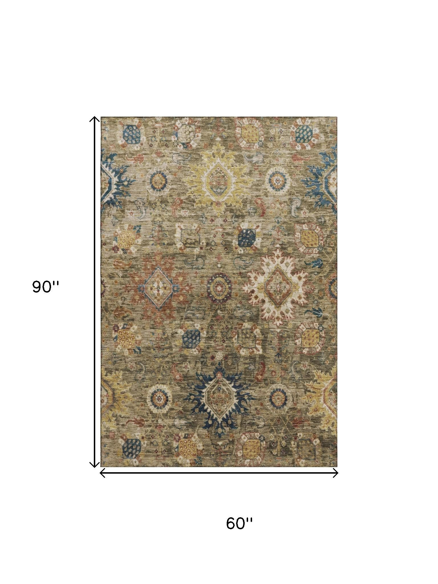 Set an inviting tone in your space with this 5-foot x 8-foot brown blue and gold oriental washable area rug with uv protection. Ideal for spaces with kids and pets, this rug is stain resistant to help repel dirt and spilled liquids. Built to last, this rug crafted from polyester fibers is known for its durability and long lasting appeal. Rugs are a great way to showcase your style, hide imperfections, warm your home and reduce noise. This larger sized, traditional styled rug is ready to create a focal point or statement piece in your room. 60.00-inch h x 90.00-inch w x 0.39-inch d.