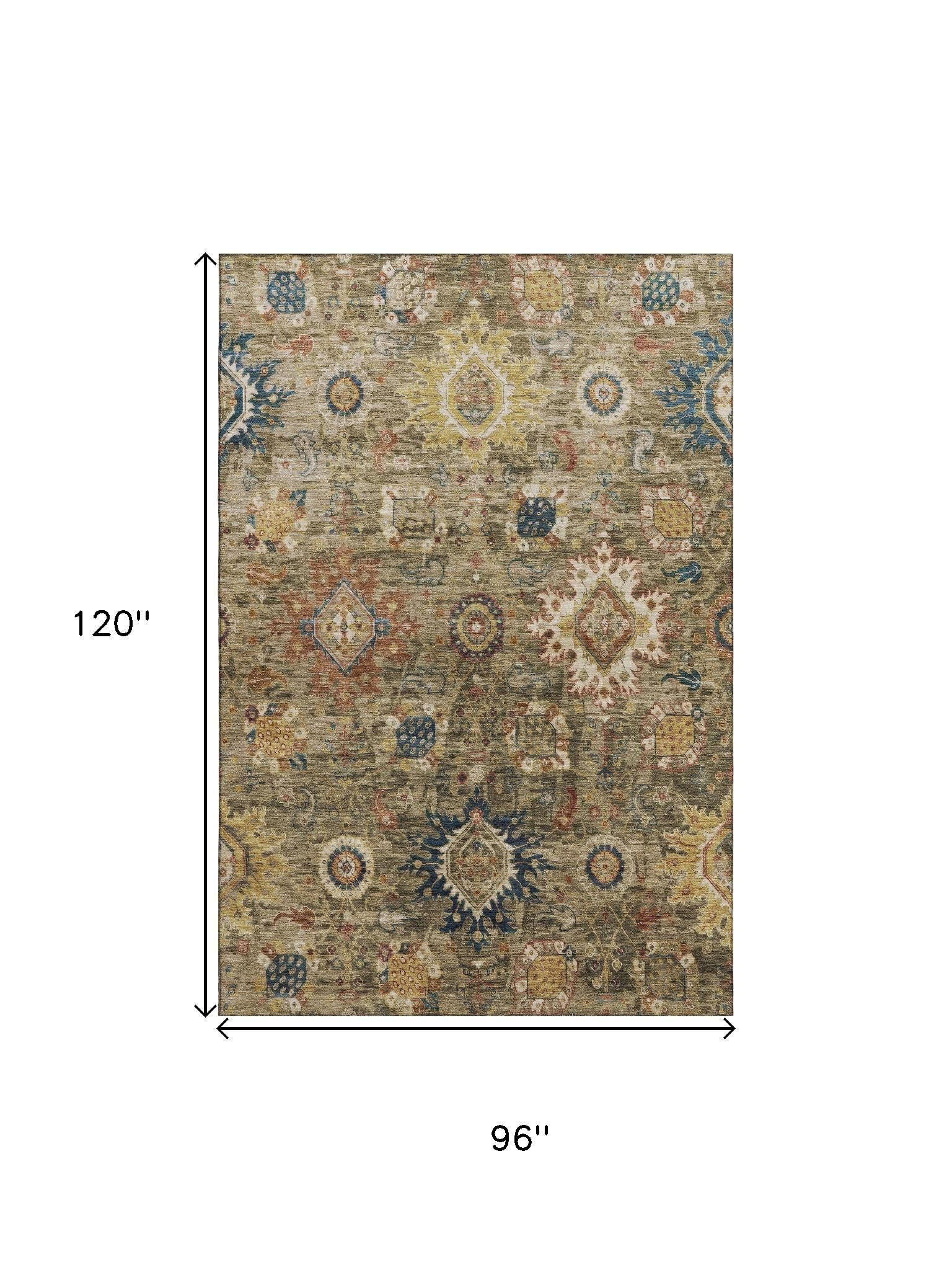 This 8-foot x 10-foot brown blue and gold oriental washable area rug with uv protection, is a great way to add warmth to a room. Ideal for spaces with kids and pets, this rug is stain resistant to help repel dirt and spilled liquids. Built to last, this rug crafted from polyester fibers is known for its durability and long lasting appeal. Rugs are a great way to showcase your style, hide imperfections, warm your home and reduce noise. This larger sized, traditional styled rug is ready to create a focal point or statement piece in your room. 96.00-inch h x 120.00-inch w x 0.39-inch d.