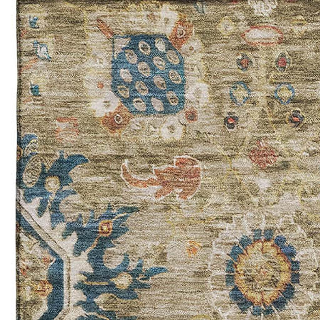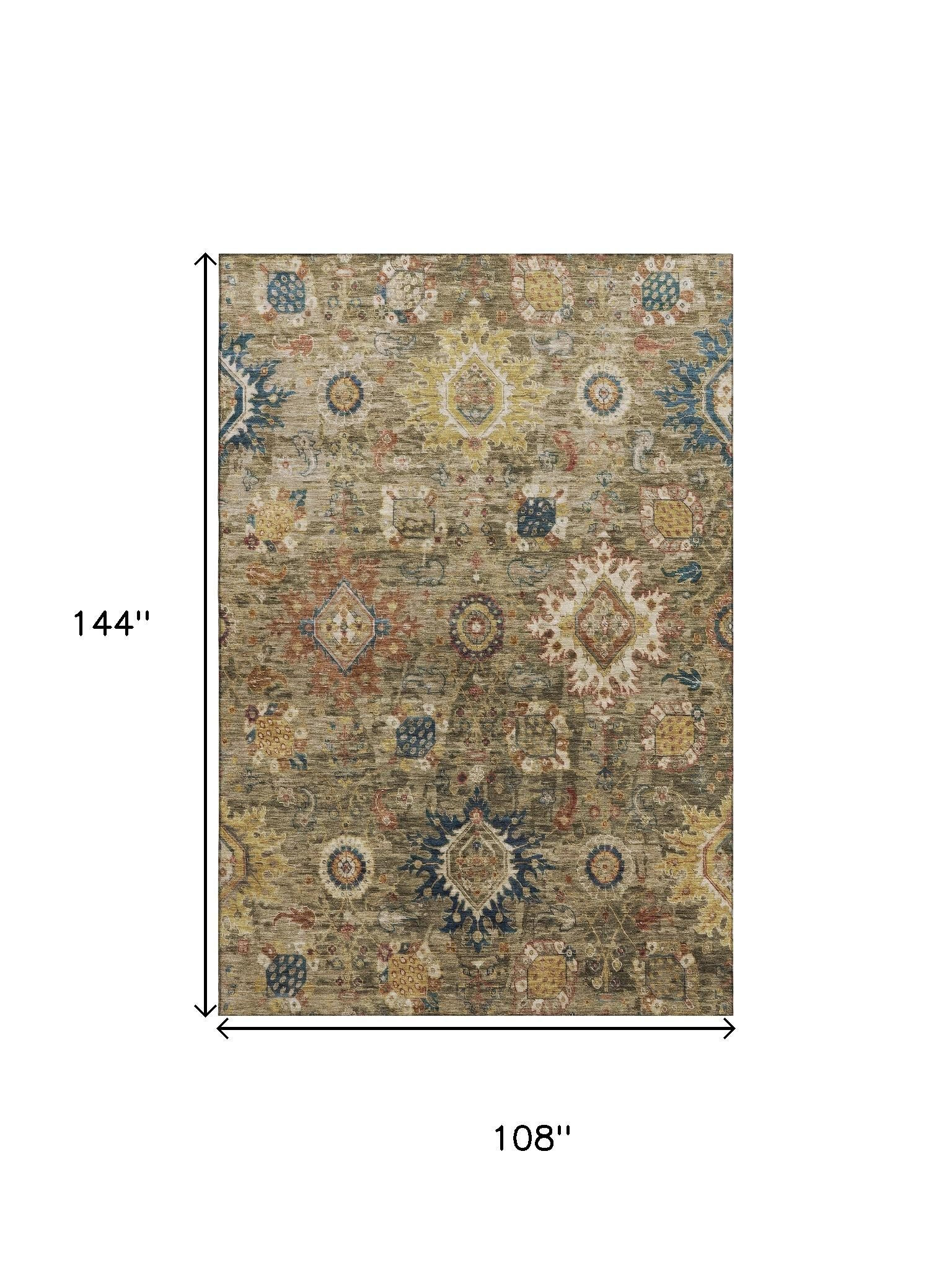 This 9-foot x 12-foot brown blue and gold oriental washable area rug with uv protection, is a great way to add warmth to a room. Ideal for spaces with kids and pets, this rug is stain resistant to help repel dirt and spilled liquids. Built to last, this rug crafted from polyester fibers is known for its durability and long lasting appeal. Rugs are a great way to showcase your style, hide imperfections, warm your home and reduce noise. This larger sized, traditional styled rug is ready to create a focal point or statement piece in your room. 108.00-inch h x 144.00-inch w x 0.39-inch d.
