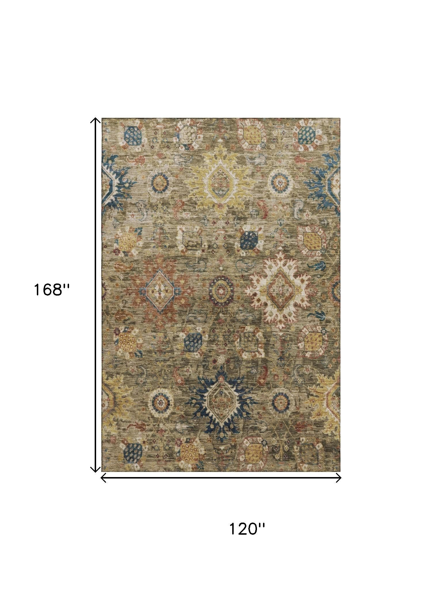 This 10-foot x 14-foot brown blue and gold oriental washable area rug with uv protection, is a great way to add warmth to a room. Ideal for spaces with kids and pets, this rug is stain resistant to help repel dirt and spilled liquids. Built to last, this rug crafted from polyester fibers is known for its durability and long lasting appeal. Rugs are a great way to showcase your style, hide imperfections, warm your home and reduce noise. This larger sized, traditional styled rug is ready to create a focal point or statement piece in your room. 120.00-inch h x 168.00-inch w x 0.39-inch d.