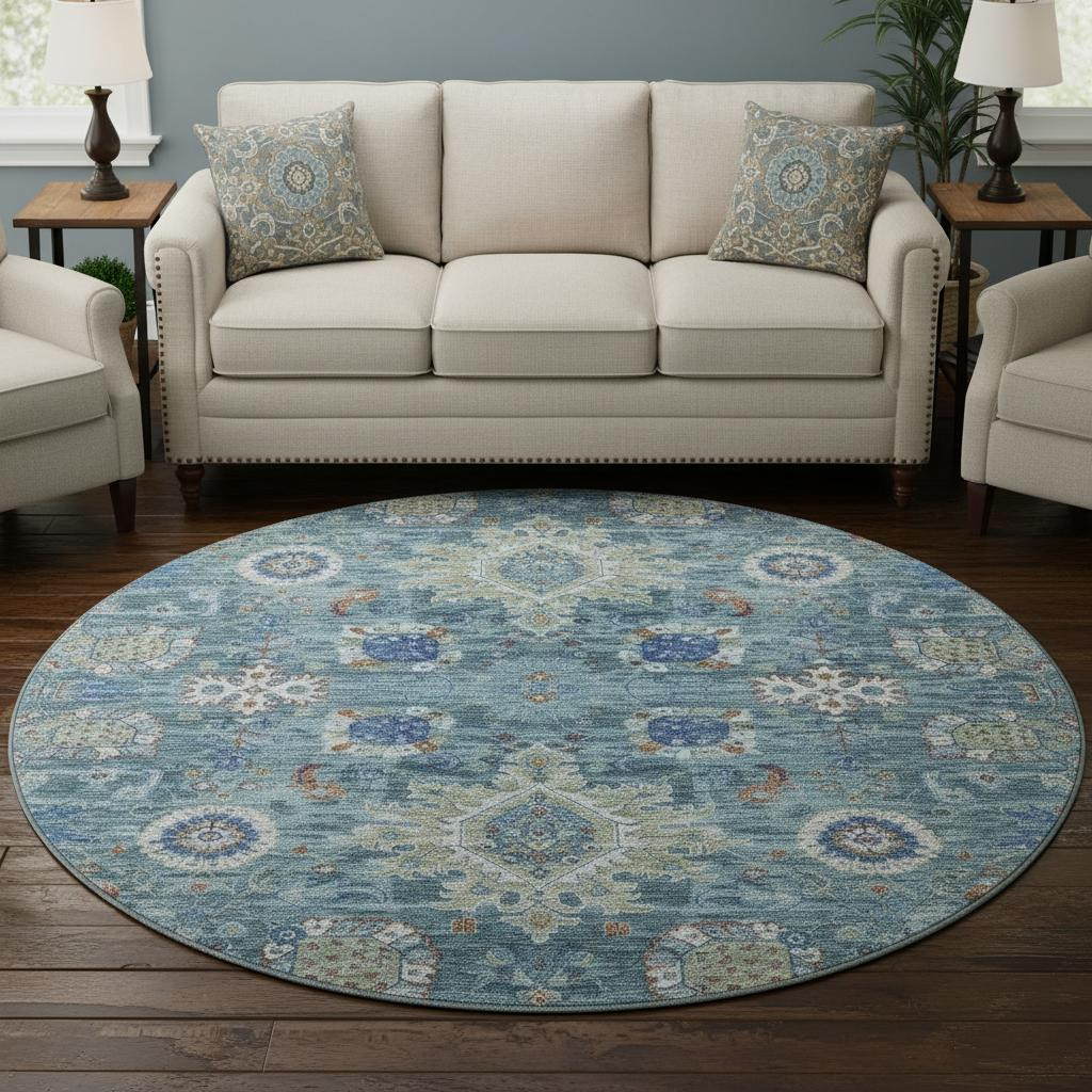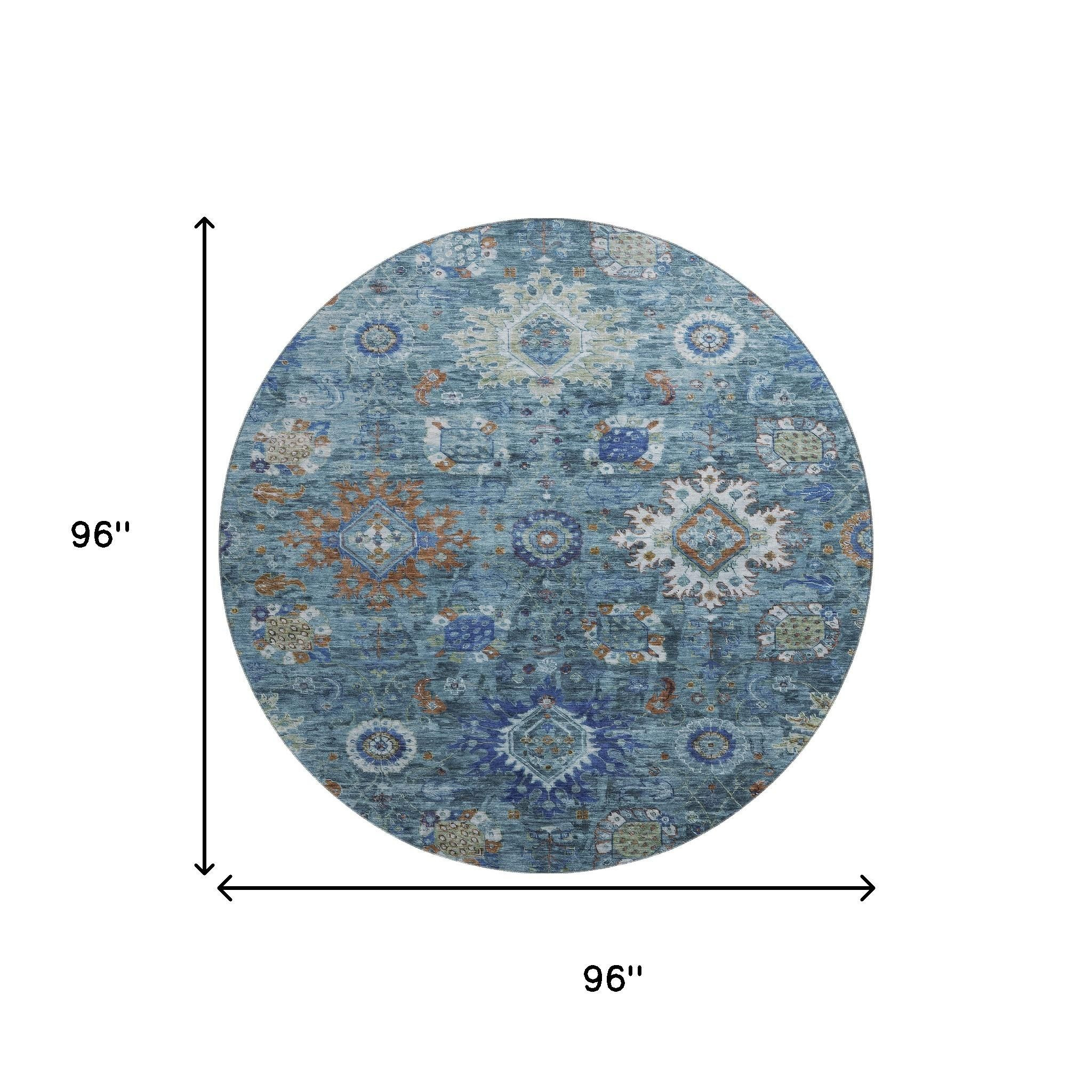 Set an inviting tone in your space with this 8-foot blue rust and ivory oriental washable round rug with uv protection. Ideal for spaces with kids and pets, this rug is stain resistant to help repel dirt and spilled liquids. Built to last, this rug crafted from polyester fibers is known for its durability and long lasting appeal. Rugs are a great way to showcase your style, hide imperfections, warm your home and reduce noise. This larger sized, traditional styled rug is ready to create a focal point or statement piece in your room. 96.00-inch h x 96.00-inch w x 0.39-inch d.