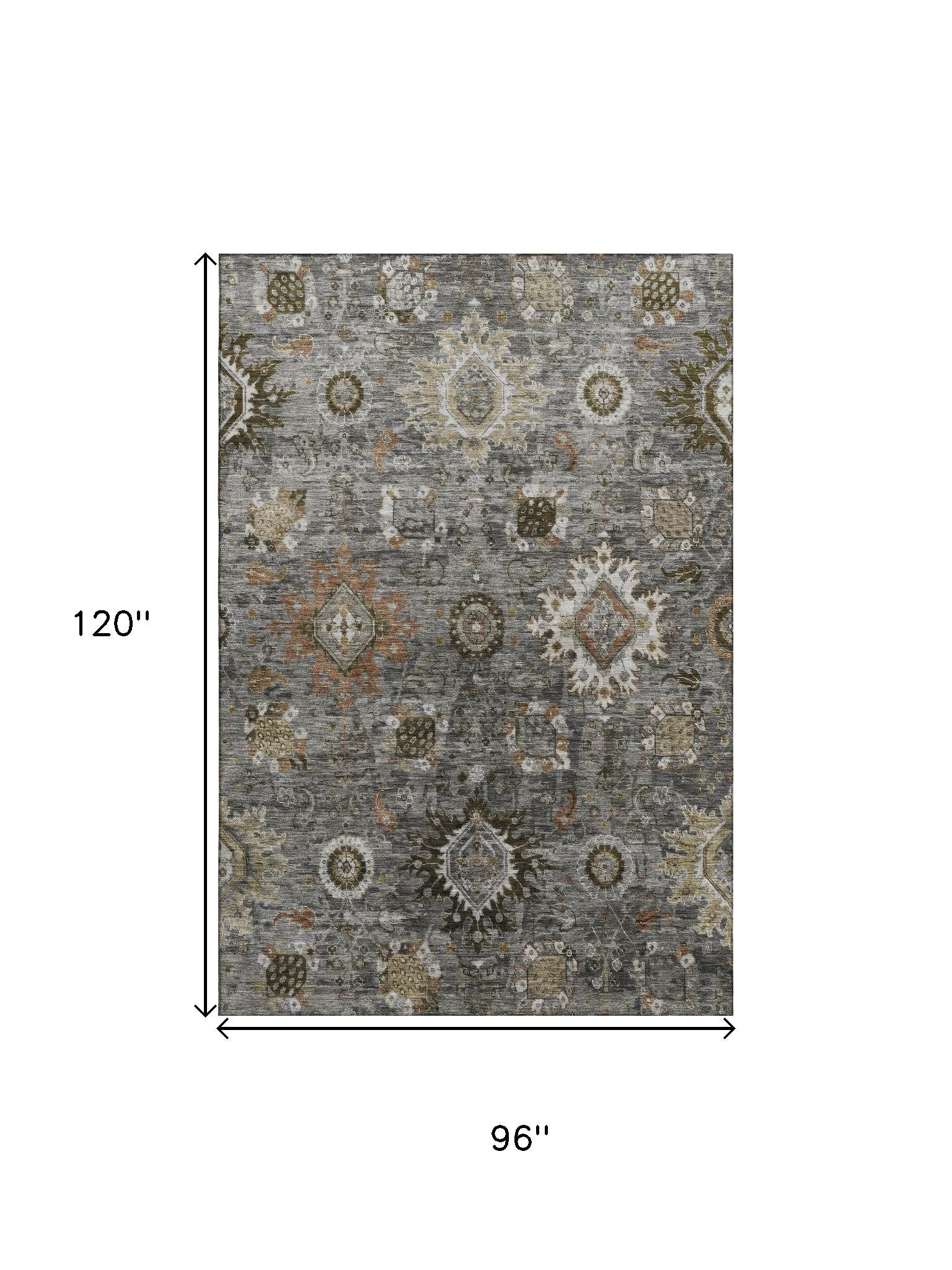 Add great coloration and comfortable texture to your space with this 8-foot x 10-foot pewter copper and beige oriental washable area rug with uv protection. Ideal for spaces with kids and pets, this rug is stain resistant to help repel dirt and spilled liquids. Built to last, this rug crafted from polyester fibers is known for its durability and long lasting appeal. Rugs are a great way to showcase your style, hide imperfections, warm your home and reduce noise. This larger sized, traditional styled rug is ready to create a focal point or statement piece in your room. 96.00-inch h x 120.00-inch w x 0.39-inch d.