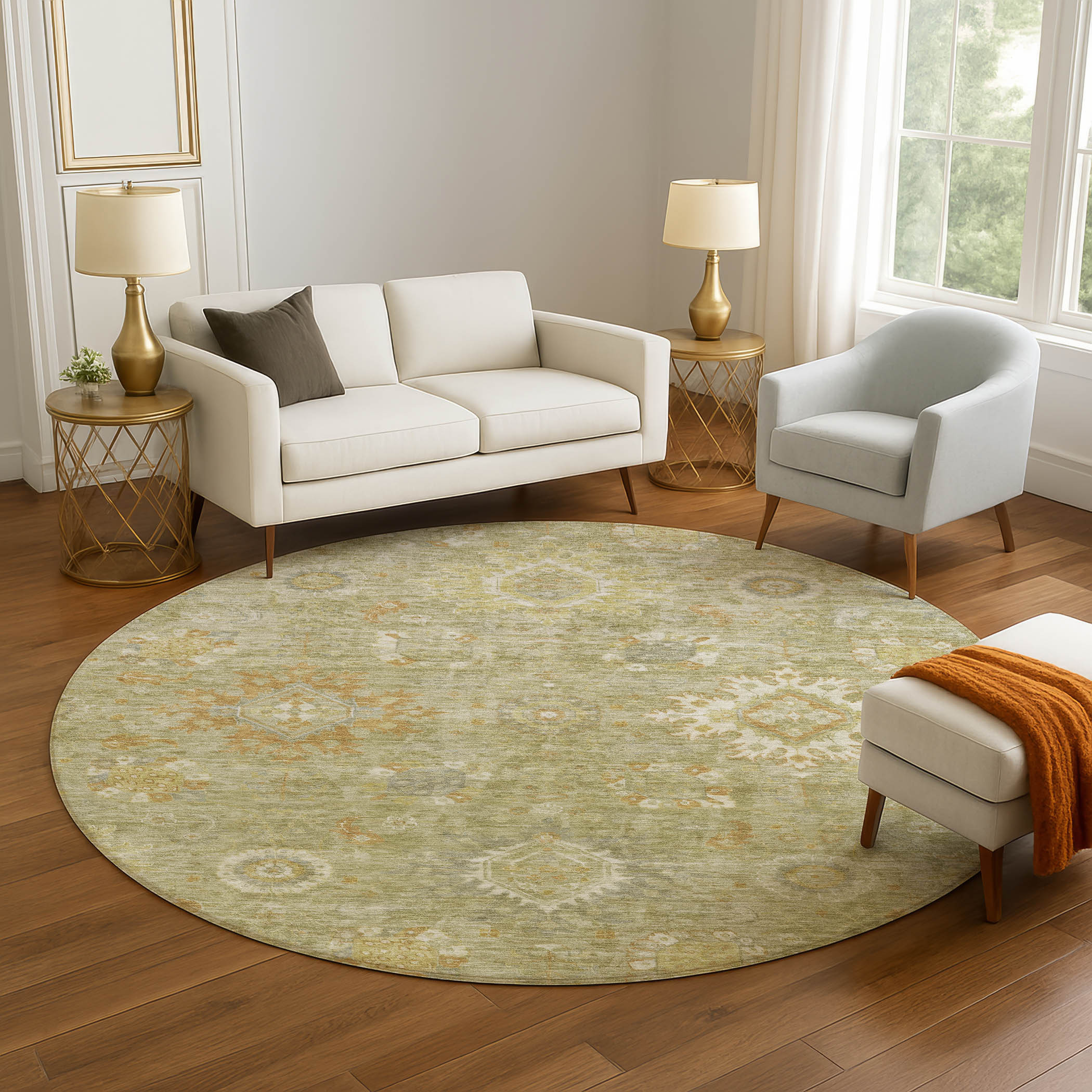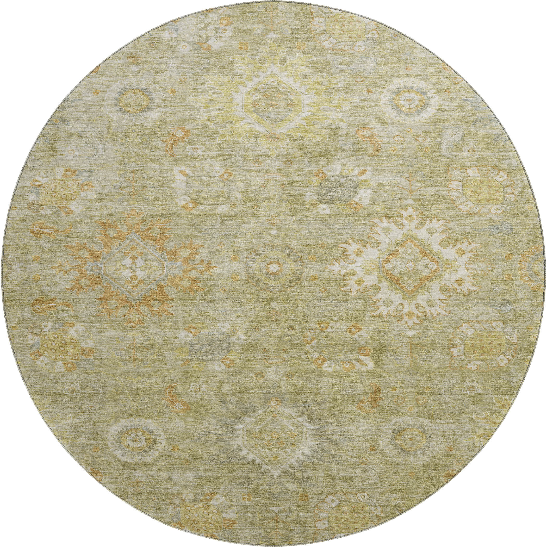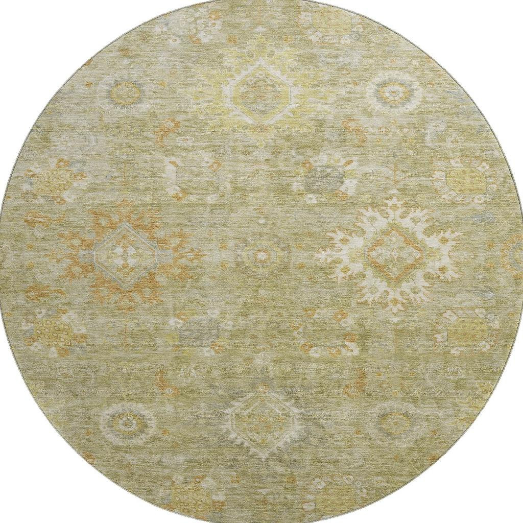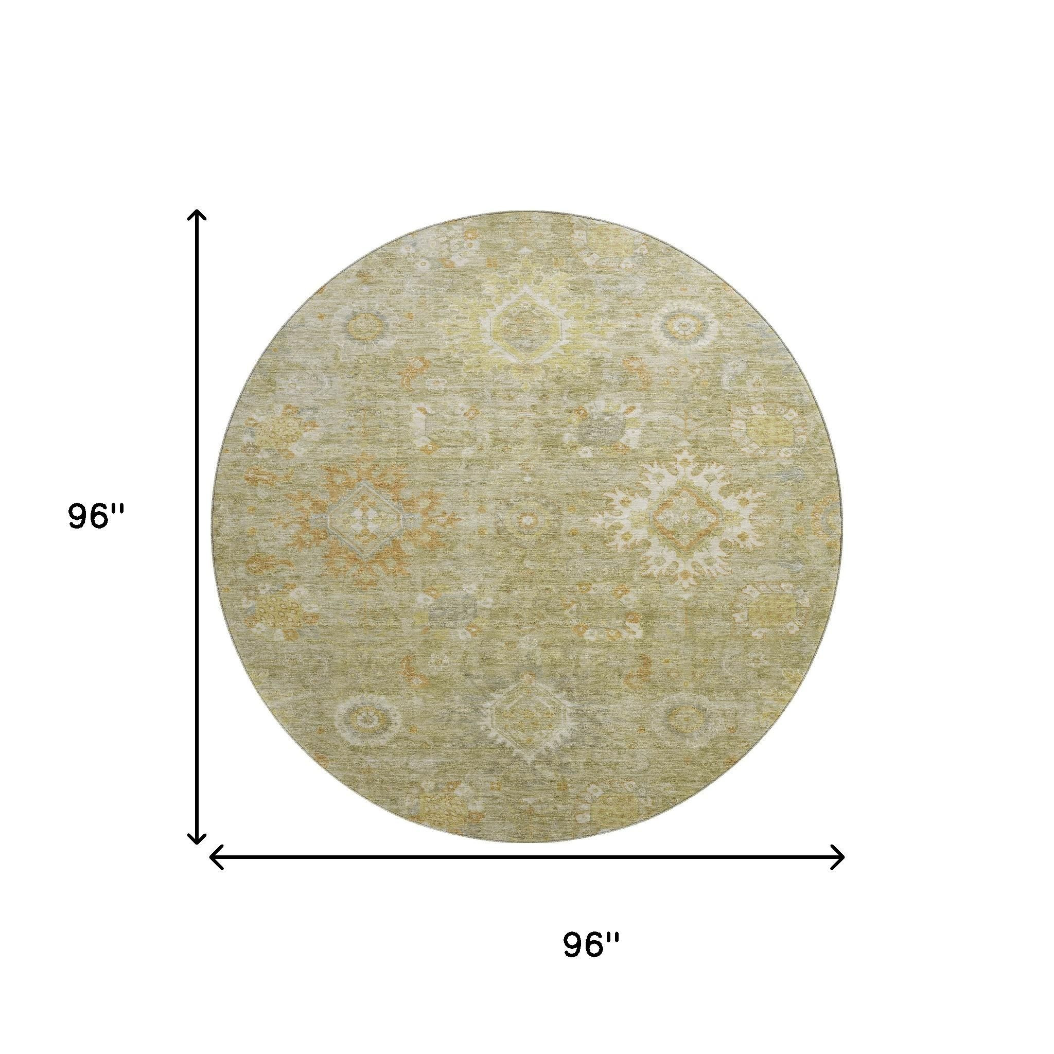 Set an inviting tone in your space with this 8-foot sage copper and ivory oriental washable round rug with uv protection. Ideal for spaces with kids and pets, this rug is stain resistant to help repel dirt and spilled liquids. Built to last, this rug crafted from polyester fibers is known for its durability and long lasting appeal. Rugs are a great way to showcase your style, hide imperfections, warm your home and reduce noise. This larger sized, traditional styled rug is ready to create a focal point or statement piece in your room. 96.00-inch h x 96.00-inch w x 0.39-inch d.