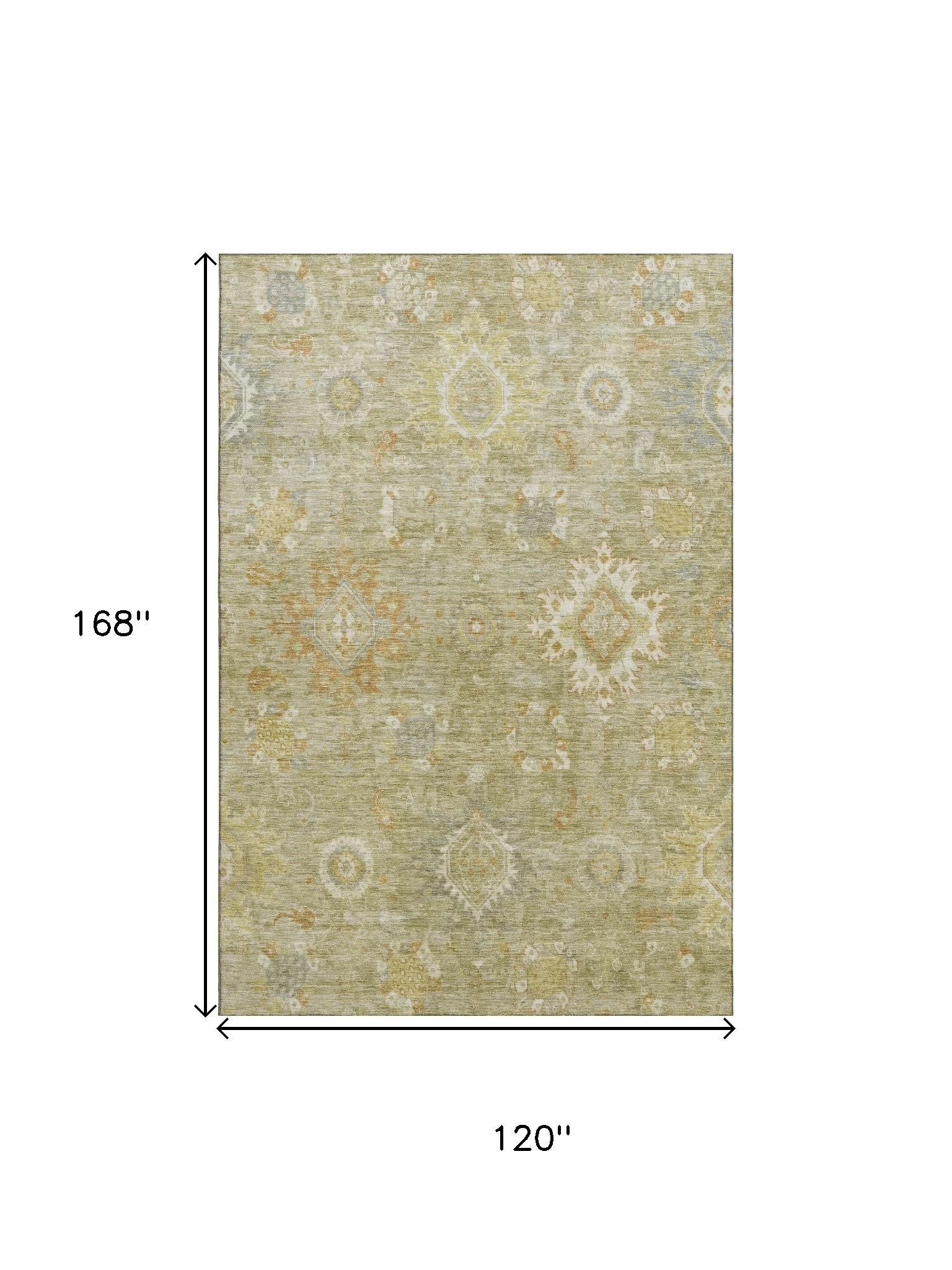 This 10-foot x 14-foot sage copper and ivory oriental washable area rug with uv protection, is a great way to add warmth to a room. Ideal for spaces with kids and pets, this rug is stain resistant to help repel dirt and spilled liquids. Built to last, this rug crafted from polyester fibers is known for its durability and long lasting appeal. Rugs are a great way to showcase your style, hide imperfections, warm your home and reduce noise. This larger sized, traditional styled rug is ready to create a focal point or statement piece in your room. 120.00-inch h x 168.00-inch w x 0.39-inch d.