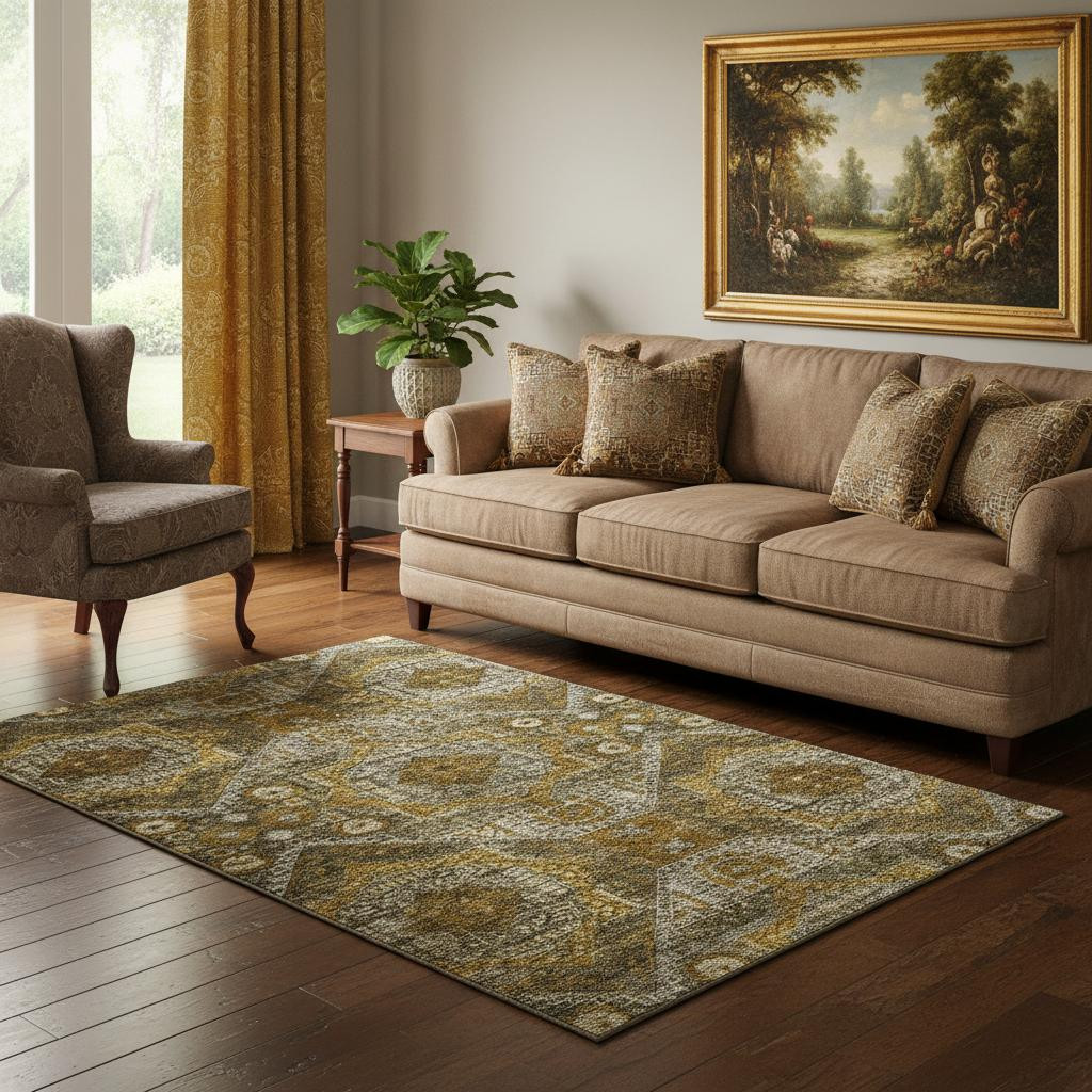 Add some artistry to your room with this 5-foot x 8-foot brown gold and beige abstract geometric washable area rug with uv protection. Ideal for spaces with kids and pets, this rug is stain resistant to help repel dirt and spilled liquids. Built to last, this rug crafted from polyester fibers is known for its durability and long lasting appeal. Rugs are a great way to showcase your style, hide imperfections, warm your home and reduce noise. This larger sized, traditional styled rug is ready to create a focal point or statement piece in your room. 60.00-inch h x 90.00-inch w x 0.39-inch d.