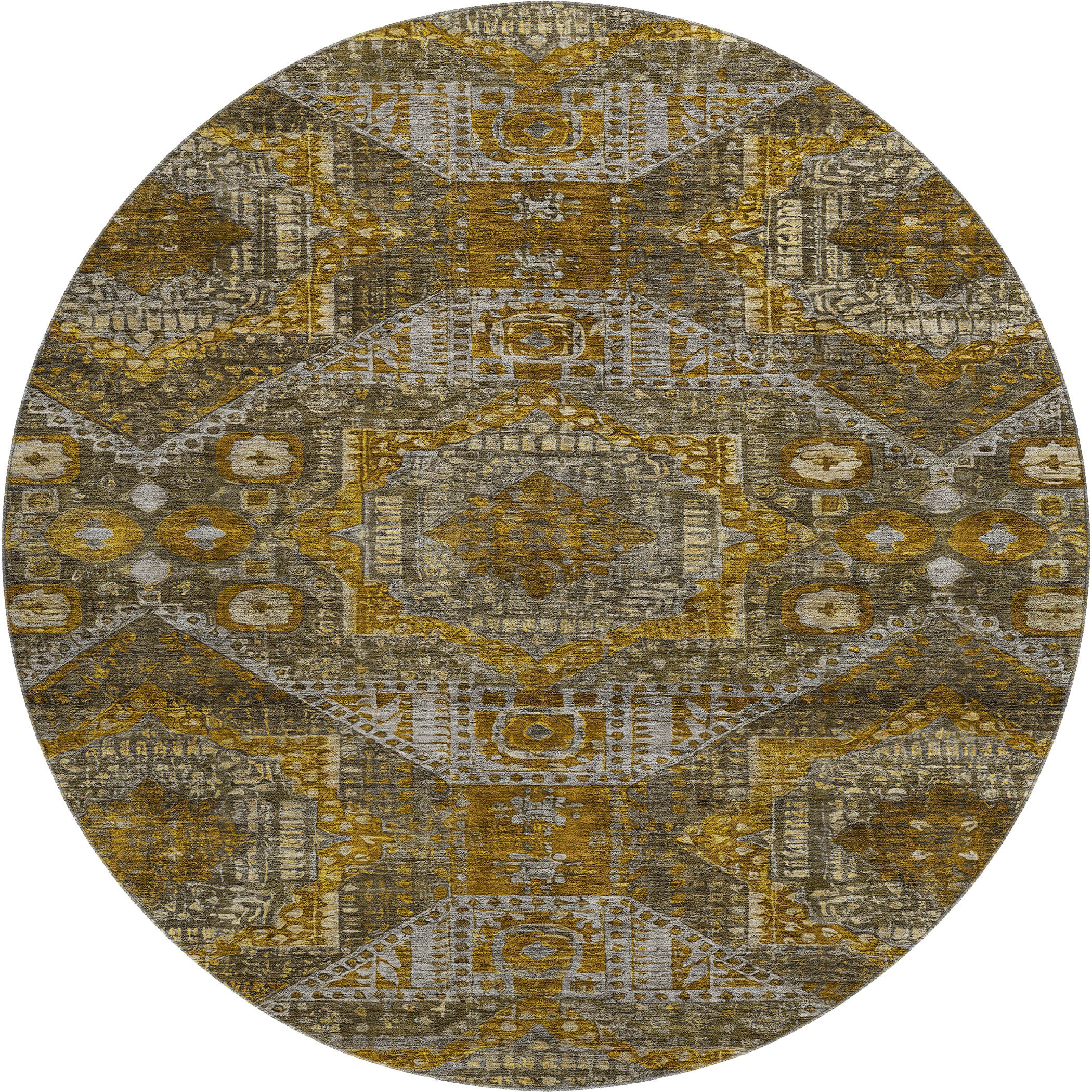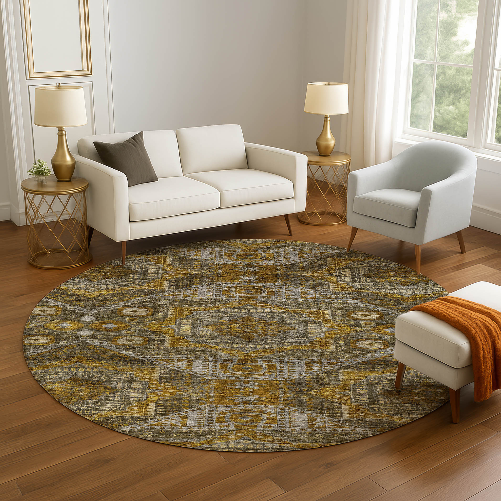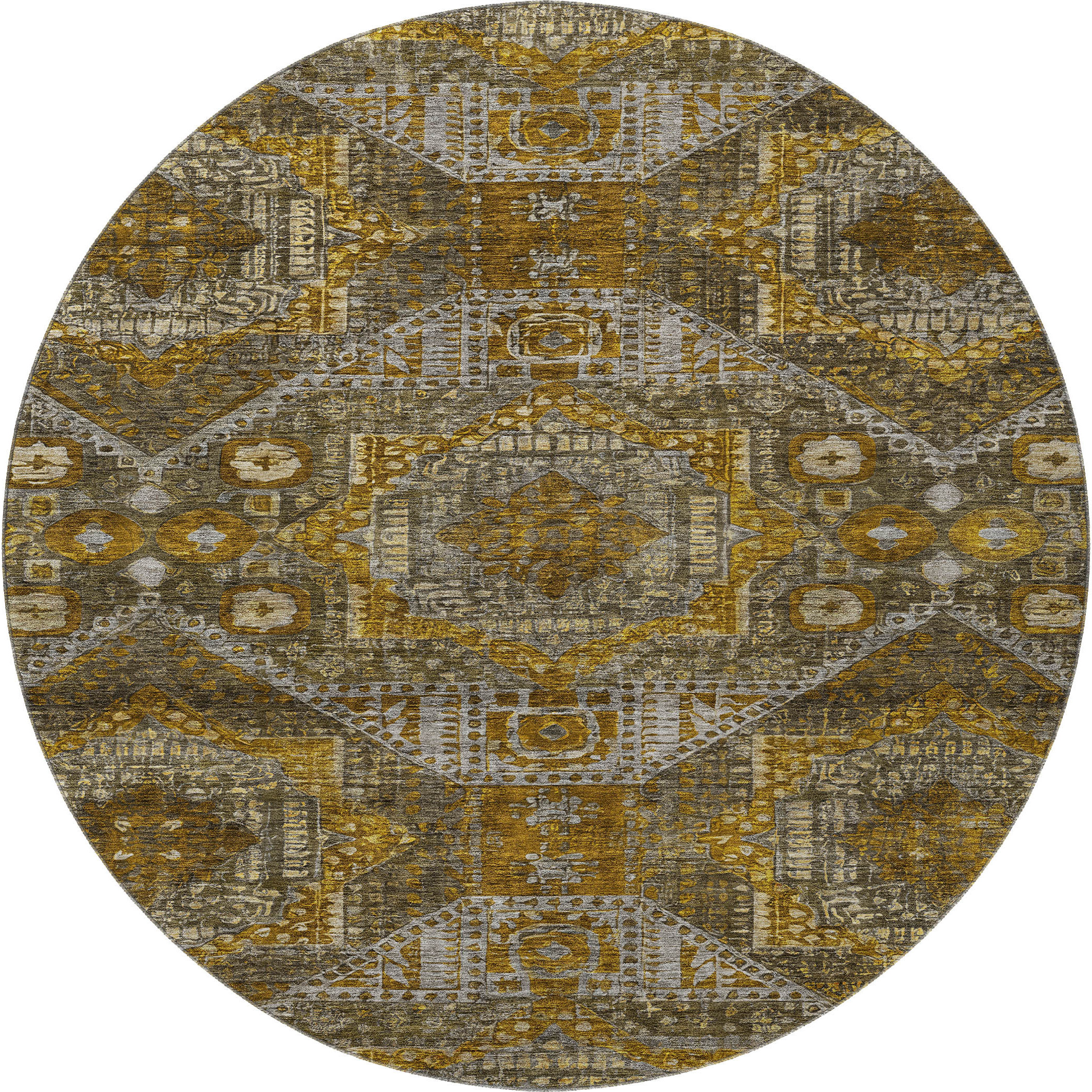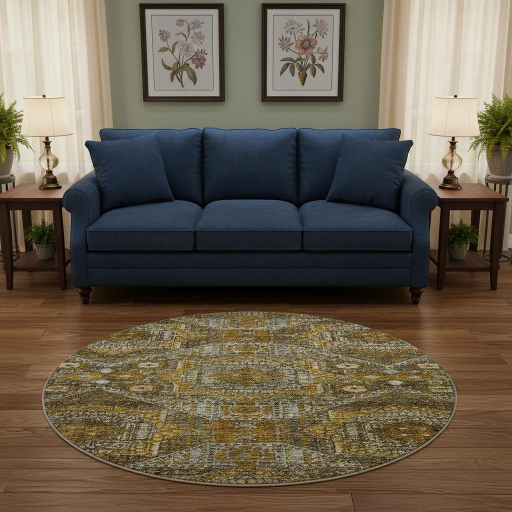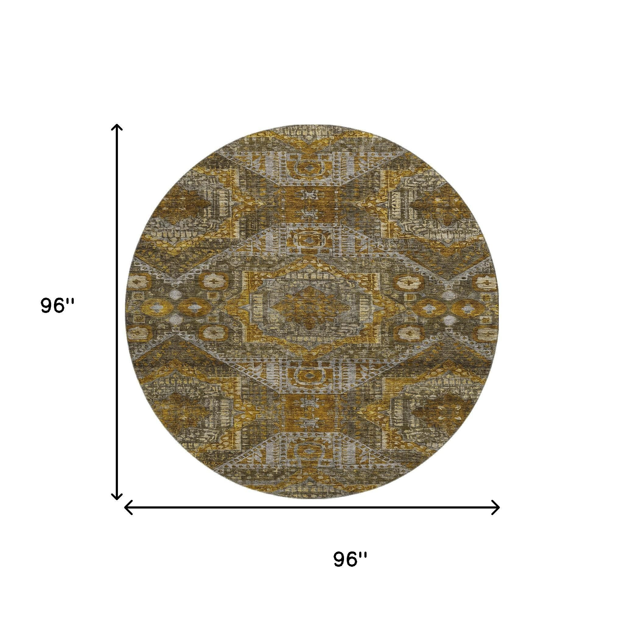 Add some artistry to your room with this 8-foot brown gold and beige abstract geometric washable round rug with uv protection. Ideal for spaces with kids and pets, this rug is stain resistant to help repel dirt and spilled liquids. Built to last, this rug crafted from polyester fibers is known for its durability and long lasting appeal. Rugs are a great way to showcase your style, hide imperfections, warm your home and reduce noise. This larger sized, traditional styled rug is ready to create a focal point or statement piece in your room. 96.00-inch h x 96.00-inch w x 0.39-inch d.