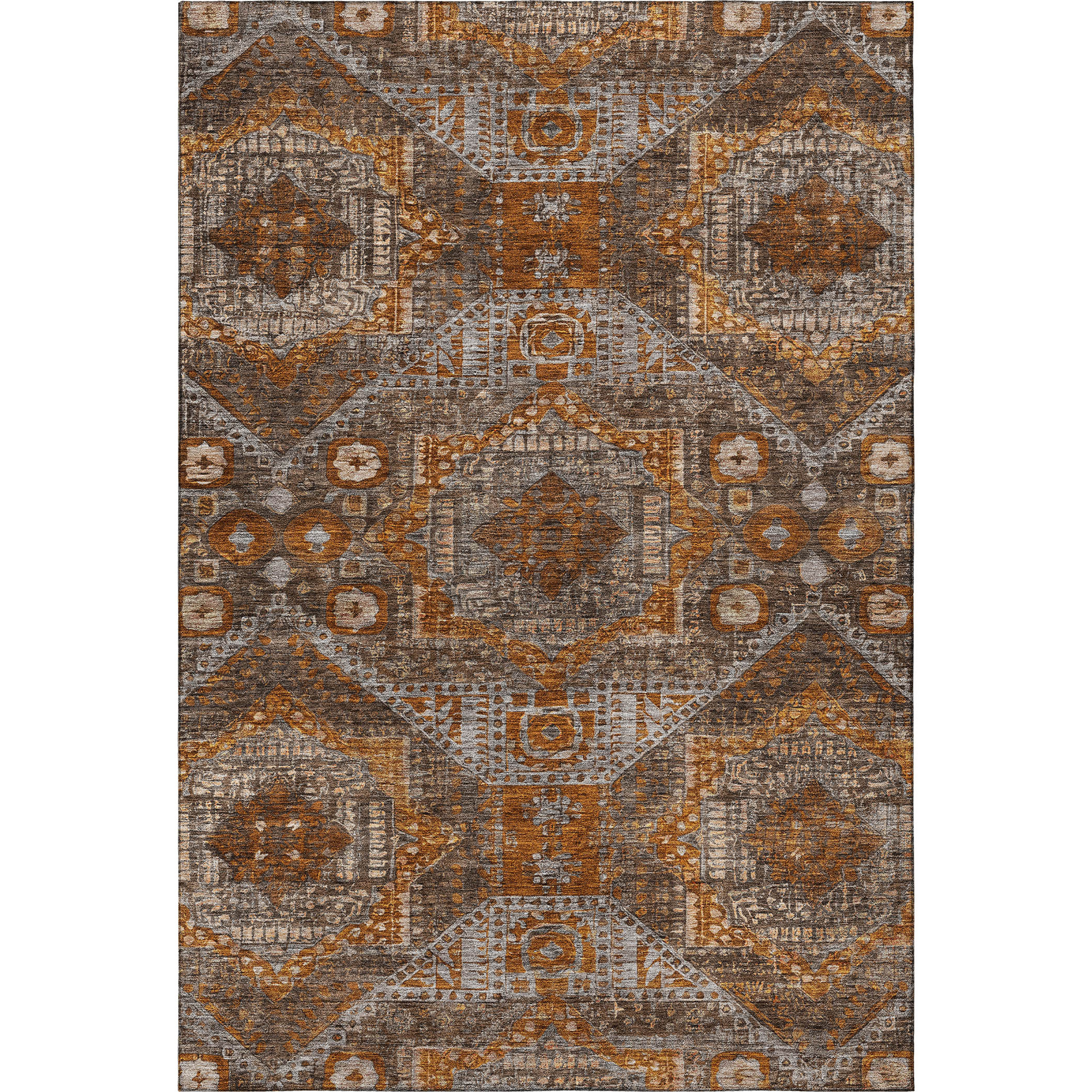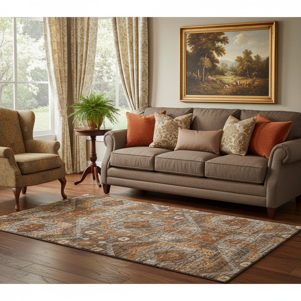 This 5-foot x 8-foot copper rust and beige abstract geometric washable area rug with uv protection, is a great way to add warmth to a room. Ideal for spaces with kids and pets, this rug is stain resistant to help repel dirt and spilled liquids. Built to last, this rug crafted from polyester fibers is known for its durability and long lasting appeal. Rugs are a great way to showcase your style, hide imperfections, warm your home and reduce noise. This larger sized, traditional styled rug is ready to create a focal point or statement piece in your room. 60.00-inch h x 90.00-inch w x 0.39-inch d.