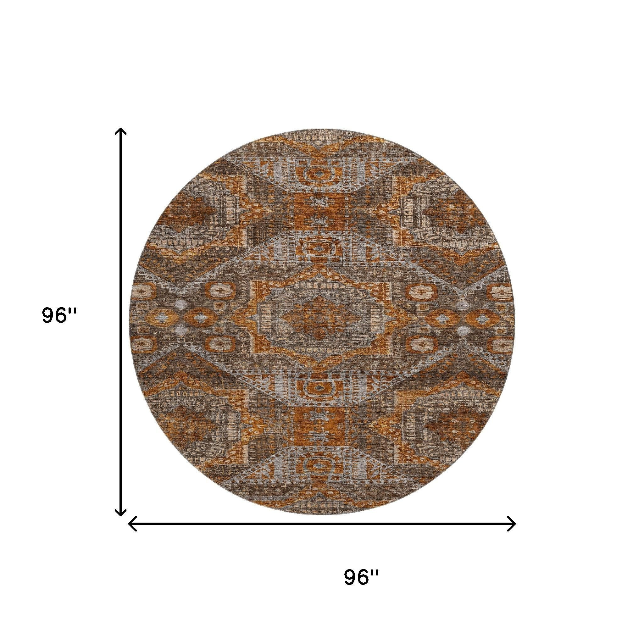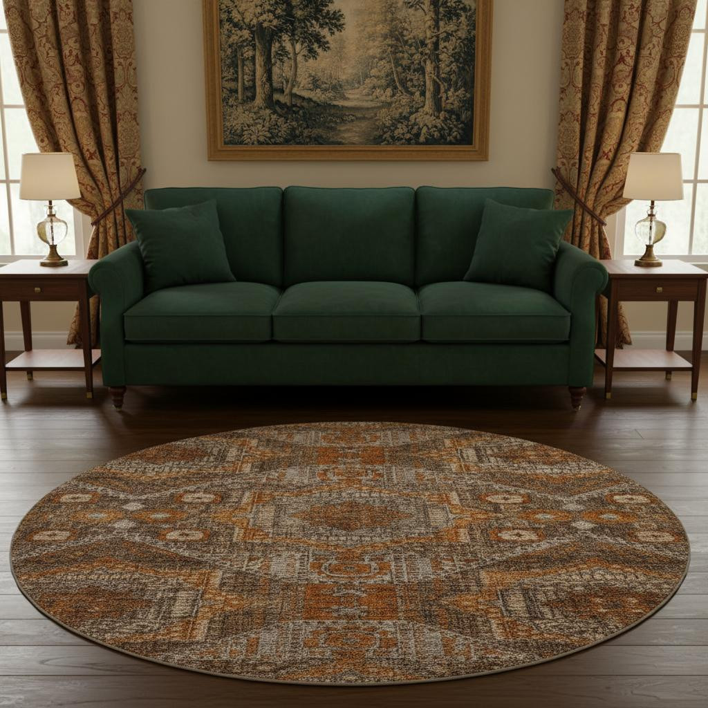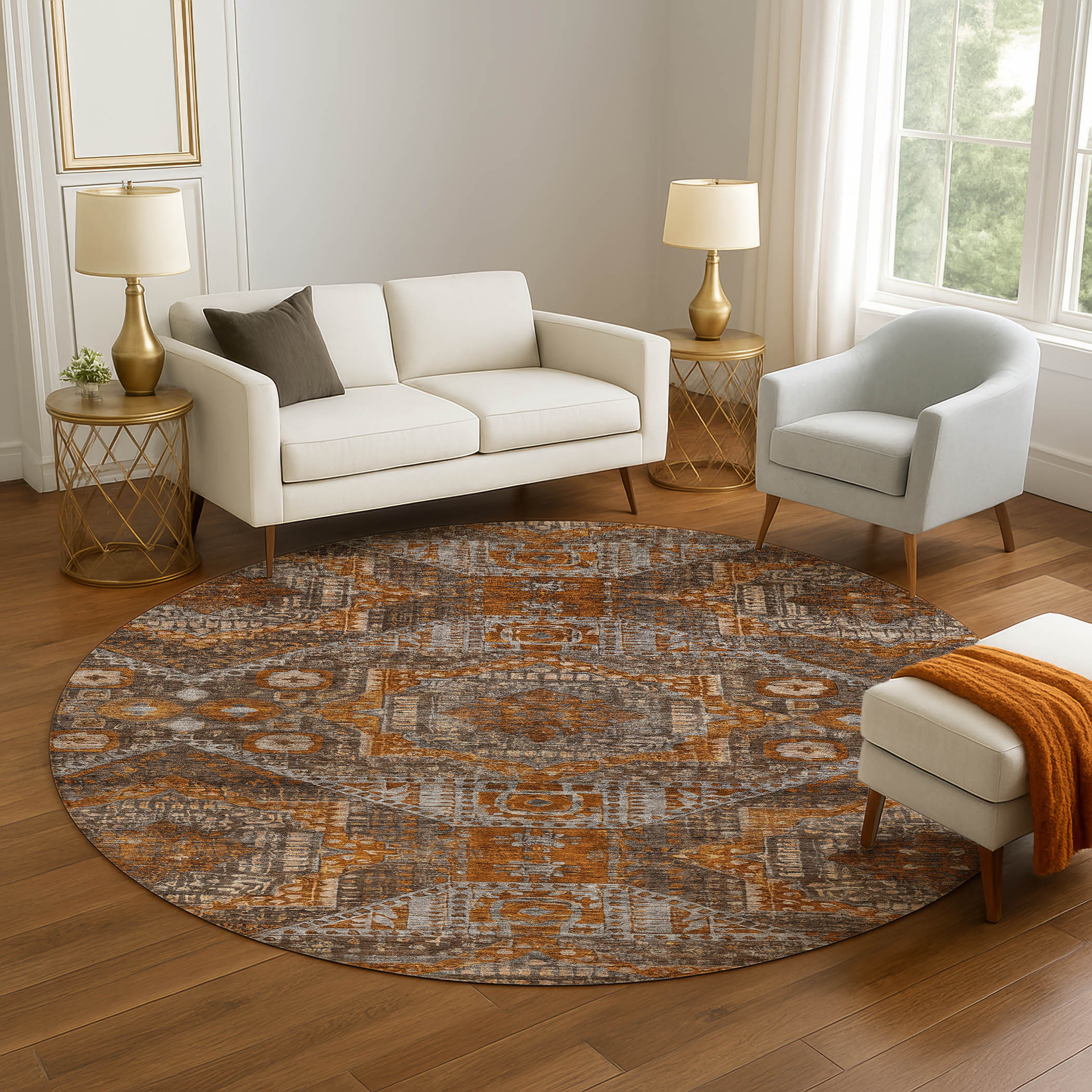 Add some artistry to your room with this 8-foot copper rust and beige abstract geometric washable round rug with uv protection. Ideal for spaces with kids and pets, this rug is stain resistant to help repel dirt and spilled liquids. Built to last, this rug crafted from polyester fibers is known for its durability and long lasting appeal. Rugs are a great way to showcase your style, hide imperfections, warm your home and reduce noise. This larger sized, traditional styled rug is ready to create a focal point or statement piece in your room. 96.00-inch h x 96.00-inch w x 0.39-inch d.