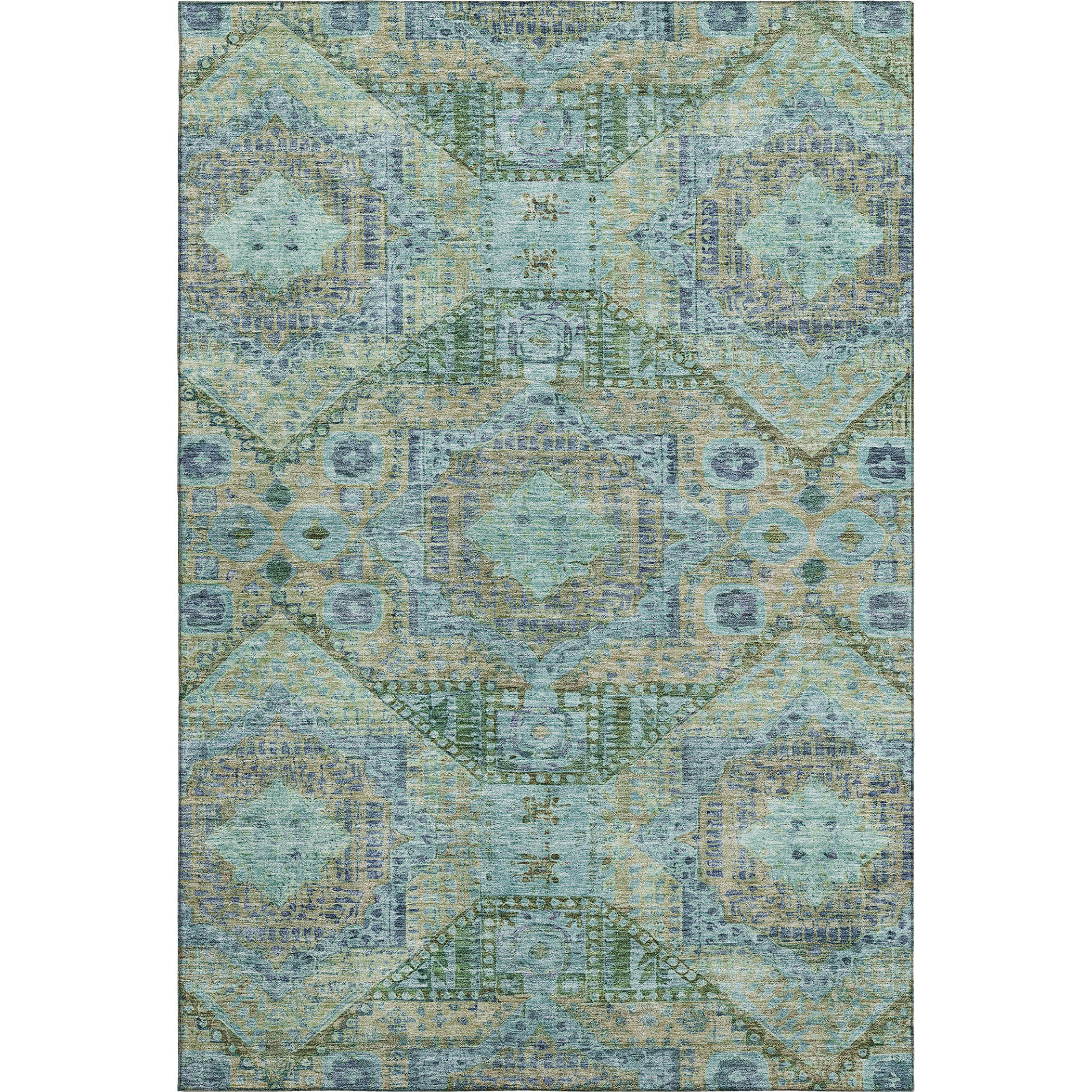 This 8-foot x 10-foot green blue and beige abstract geometric washable area rug with uv protection, is a great way to add warmth to a room. Ideal for spaces with kids and pets, this rug is stain resistant to help repel dirt and spilled liquids. Built to last, this rug crafted from polyester fibers is known for its durability and long lasting appeal. Rugs are a great way to showcase your style, hide imperfections, warm your home and reduce noise. This larger sized, traditional styled rug is ready to create a focal point or statement piece in your room. 96.00-inch h x 120.00-inch w x 0.39-inch d.