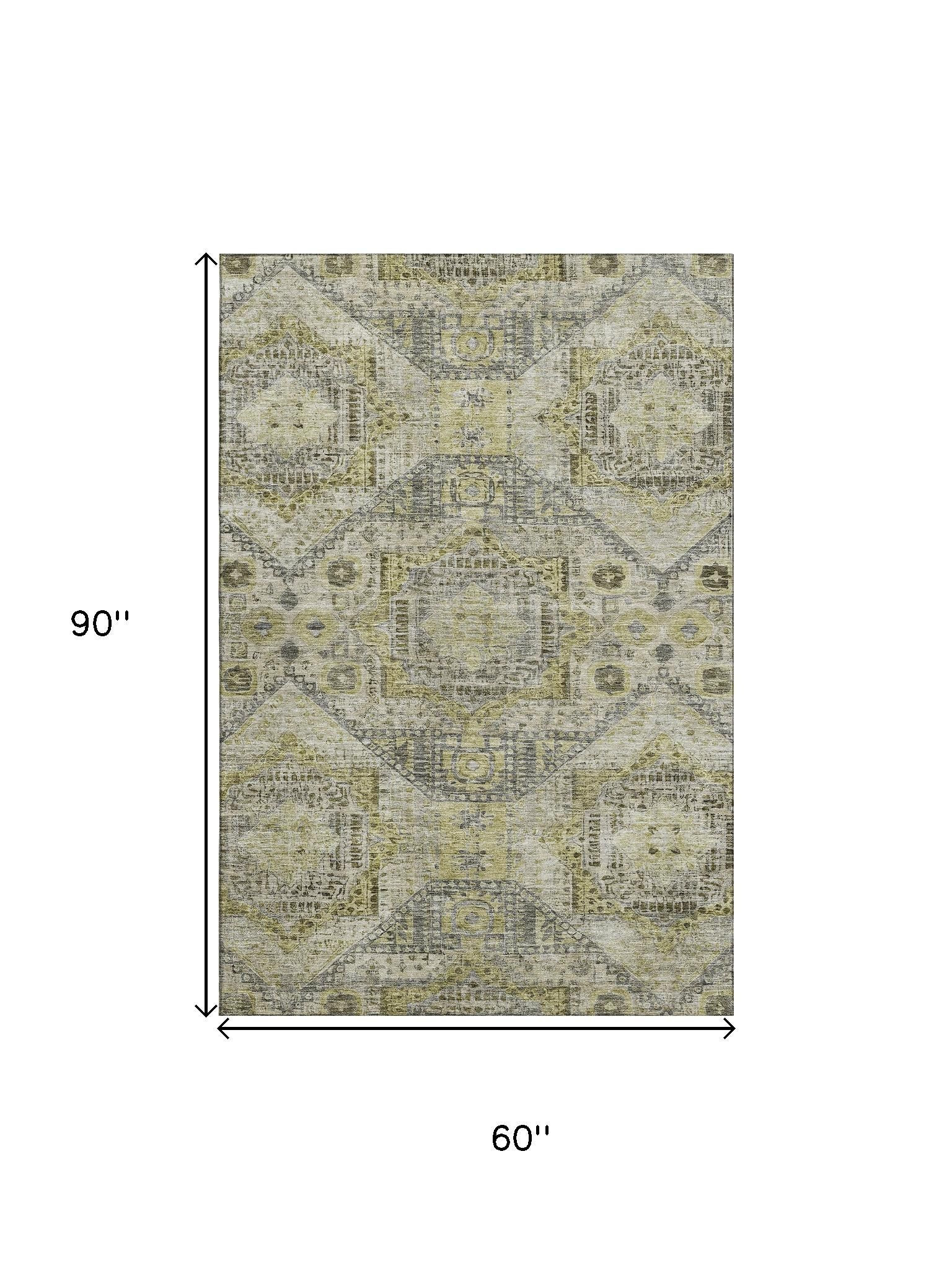 Set an inviting tone in your space with this 5-foot x 8-foot khaki beige and gray abstract geometric washable area rug with uv protection. Ideal for spaces with kids and pets, this rug is stain resistant to help repel dirt and spilled liquids. Built to last, this rug crafted from polyester fibers is known for its durability and long lasting appeal. Rugs are a great way to showcase your style, hide imperfections, warm your home and reduce noise. This larger sized, traditional styled rug is ready to create a focal point or statement piece in your room. 60.00-inch h x 90.00-inch w x 0.39-inch d.