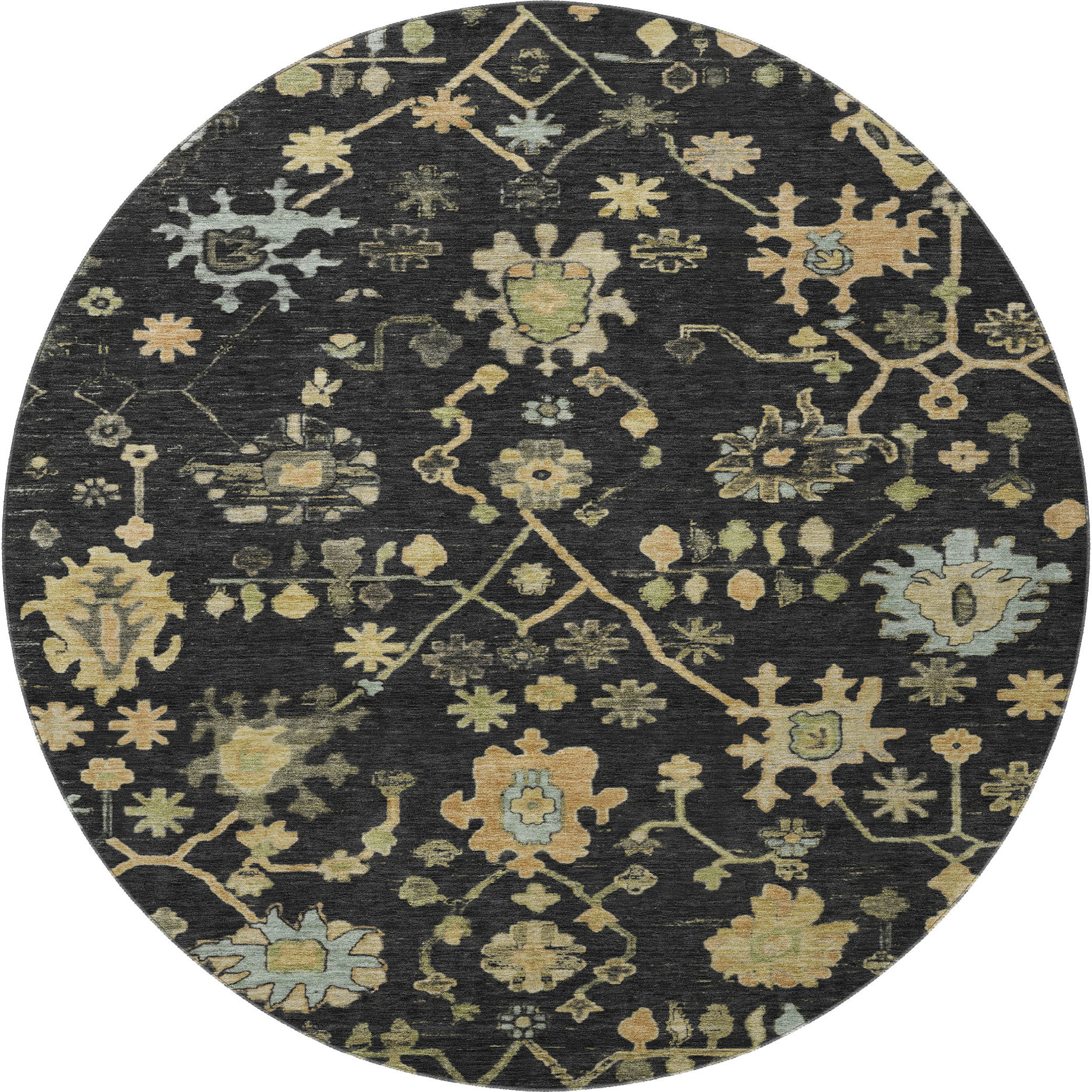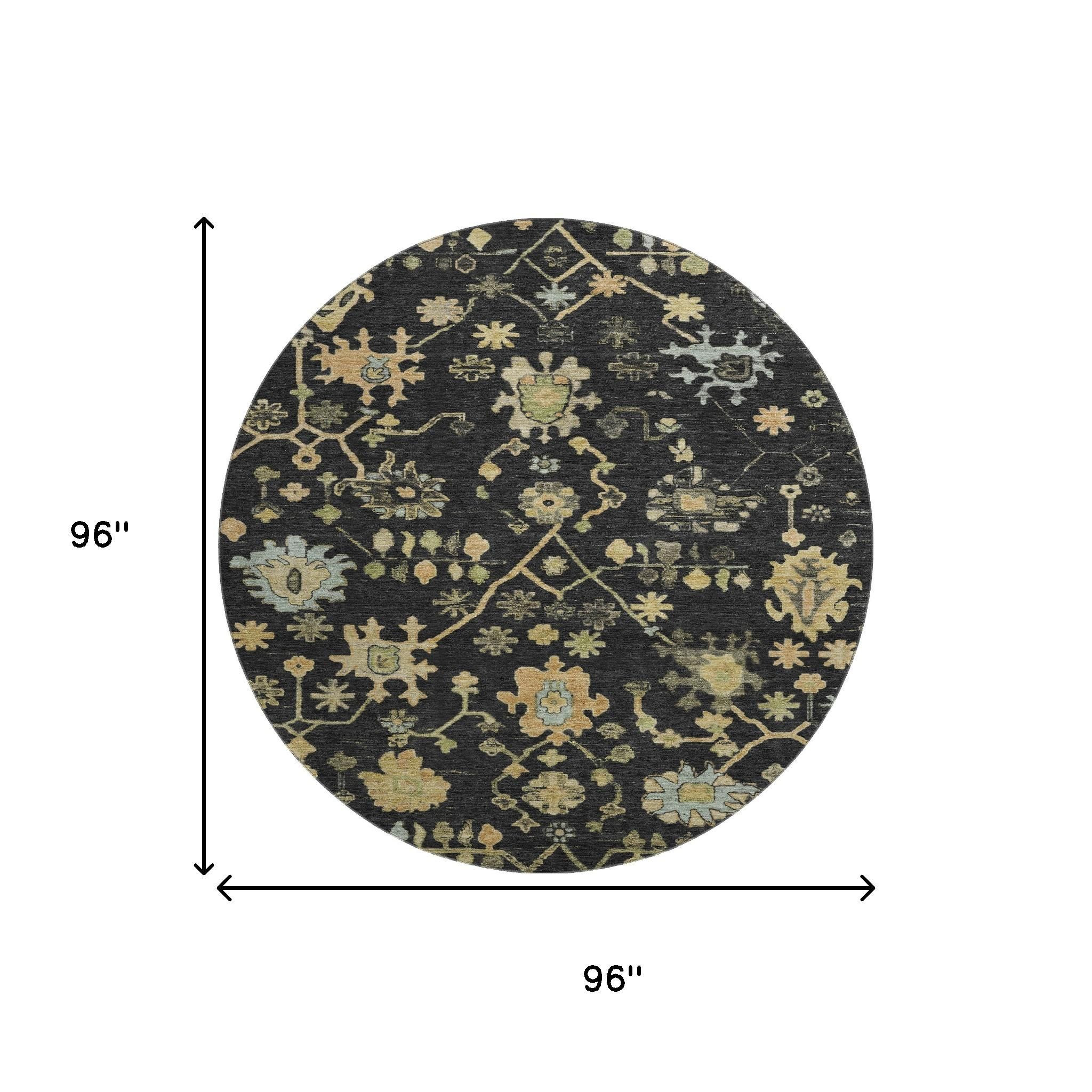 Add some artistry to your room with this 8-foot black gold and blue floral washable round rug with uv protection. Ideal for spaces with kids and pets, this rug is stain resistant to help repel dirt and spilled liquids. Built to last, this rug crafted from polyester fibers is known for its durability and long lasting appeal. Rugs are a great way to showcase your style, hide imperfections, warm your home and reduce noise. This larger sized, traditional styled rug is ready to create a focal point or statement piece in your room. 96.00-inch h x 96.00-inch w x 0.39-inch d.