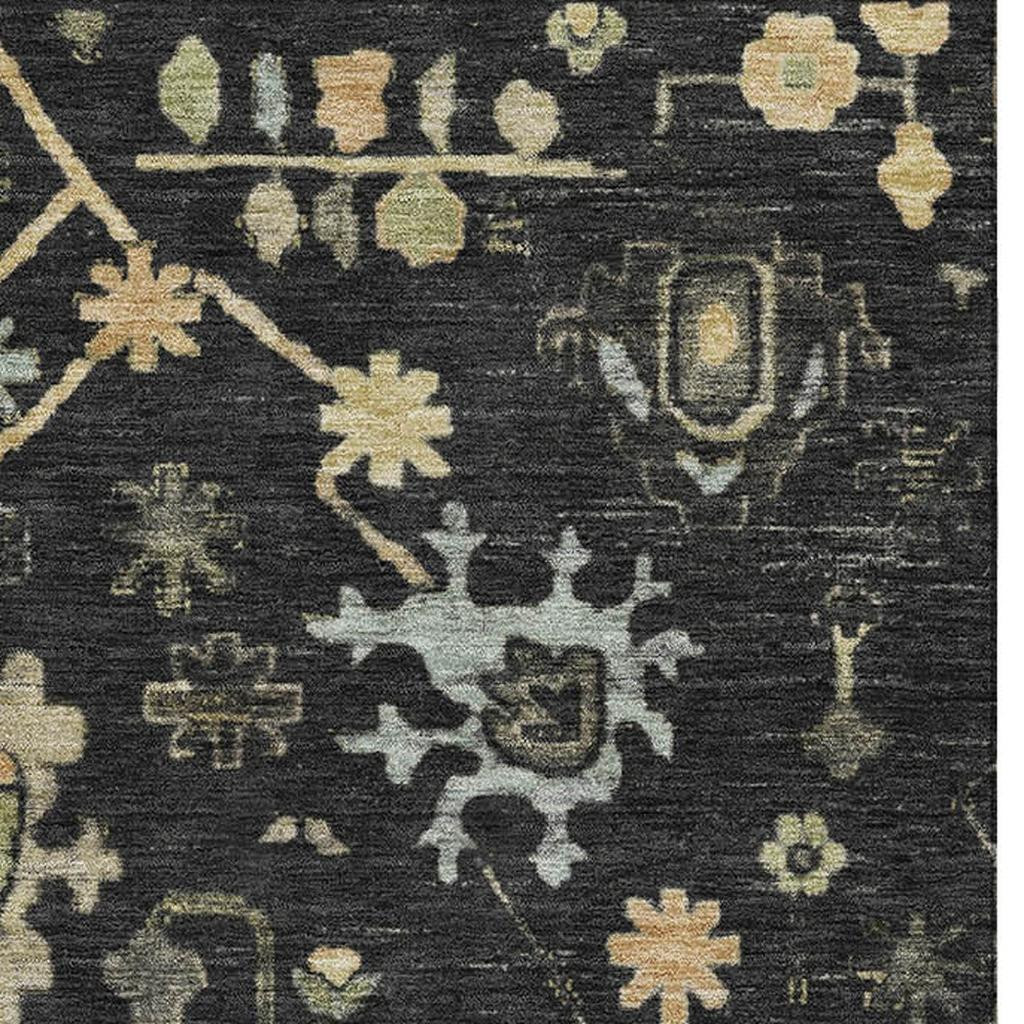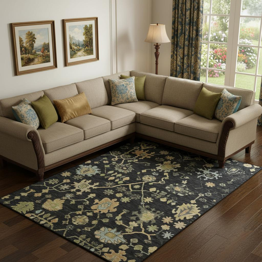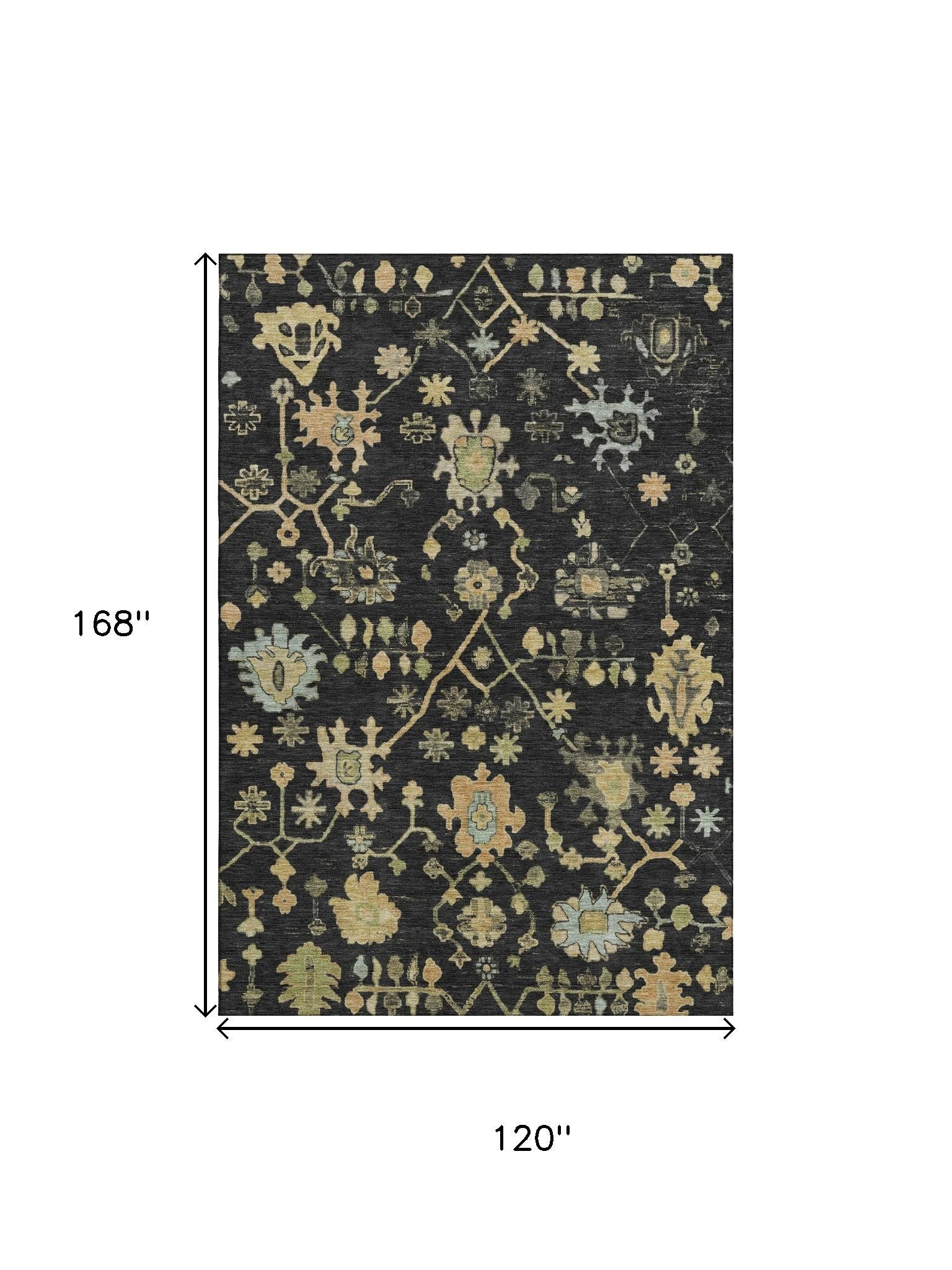 Add some artistry to your room with this 10-foot x 14-foot black gold and blue floral washable area rug with uv protection. Ideal for spaces with kids and pets, this rug is stain resistant to help repel dirt and spilled liquids. Built to last, this rug crafted from polyester fibers is known for its durability and long lasting appeal. Rugs are a great way to showcase your style, hide imperfections, warm your home and reduce noise. This larger sized, traditional styled rug is ready to create a focal point or statement piece in your room. 120.00-inch h x 168.00-inch w x 0.39-inch d.