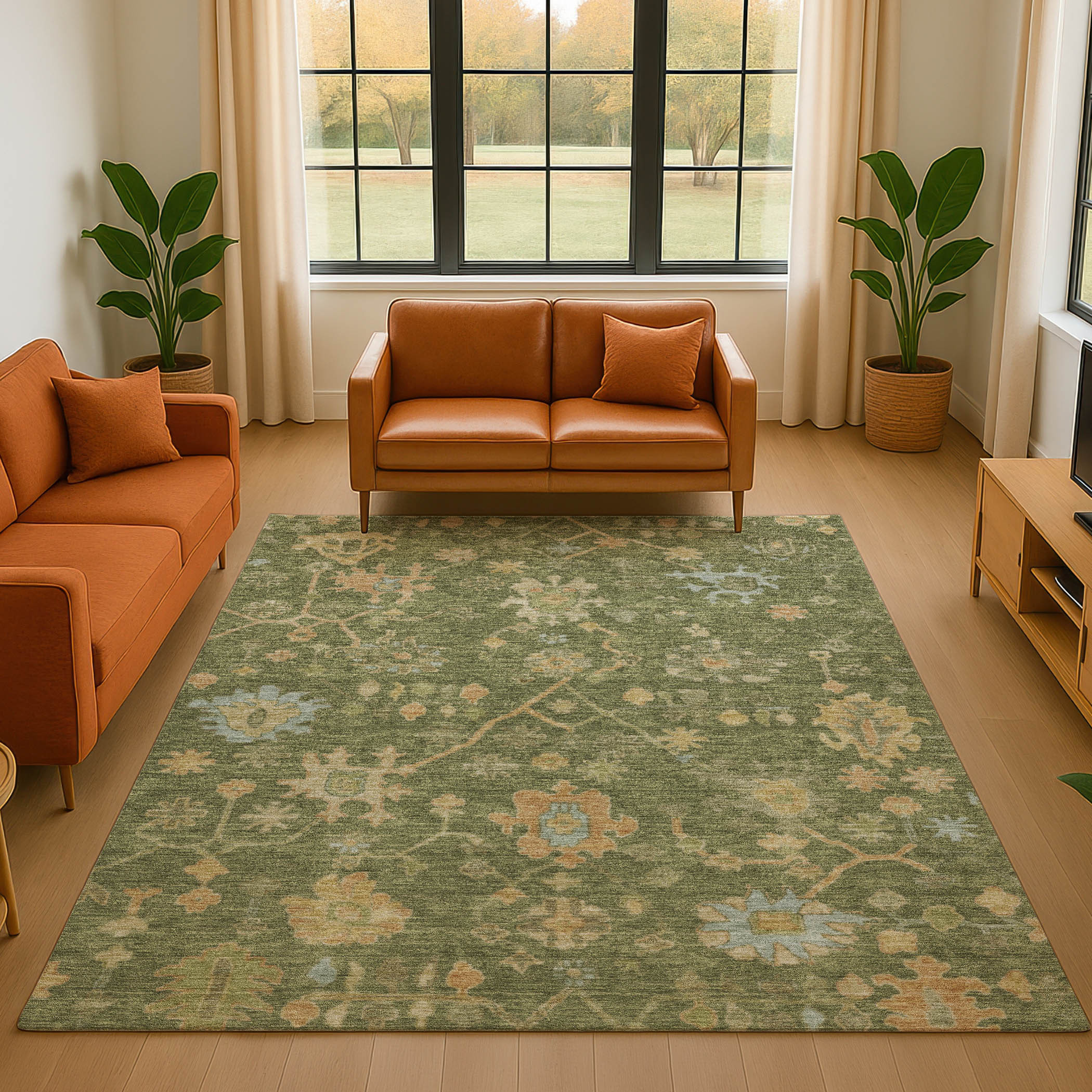This 5-foot x 8-foot fern green gold and blue floral washable area rug with uv protection, is a great way to add warmth to a room. Ideal for spaces with kids and pets, this rug is stain resistant to help repel dirt and spilled liquids. Built to last, this rug crafted from polyester fibers is known for its durability and long lasting appeal. Rugs are a great way to showcase your style, hide imperfections, warm your home and reduce noise. This larger sized, traditional styled rug is ready to create a focal point or statement piece in your room. 60.00-inch h x 90.00-inch w x 0.39-inch d.
