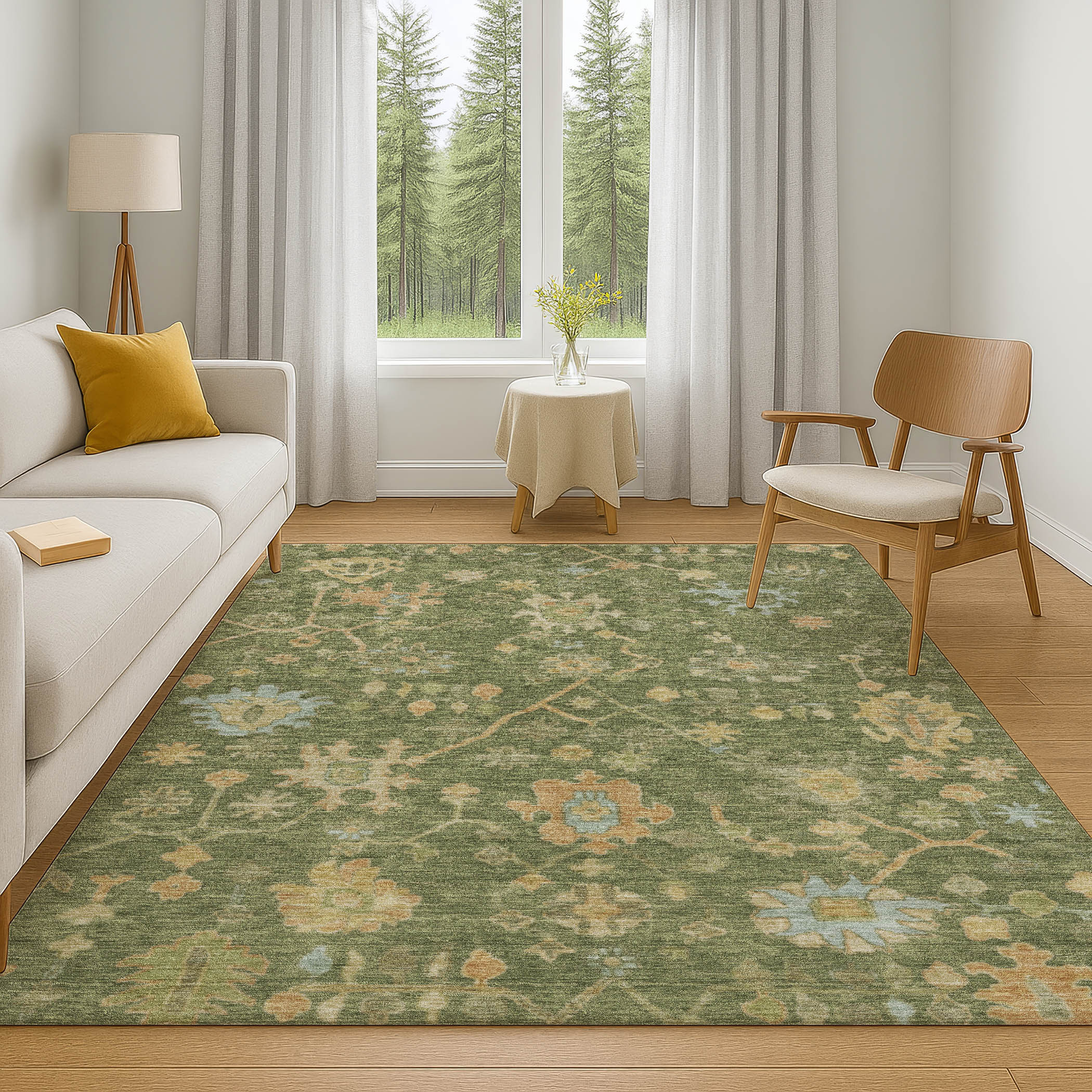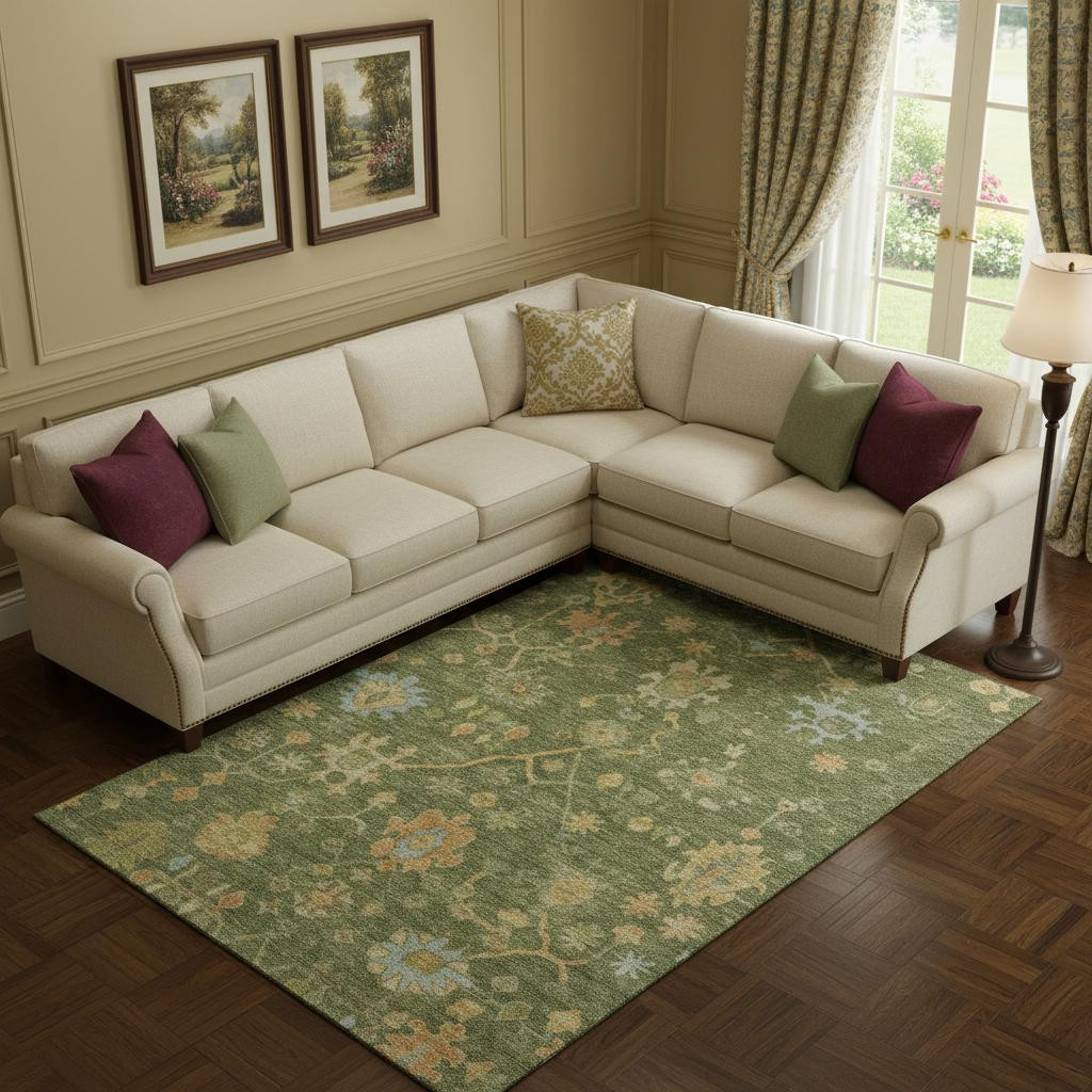 This 9-foot x 12-foot fern green gold and blue floral washable area rug with uv protection, is a great way to add warmth to a room. Ideal for spaces with kids and pets, this rug is stain resistant to help repel dirt and spilled liquids. Built to last, this rug crafted from polyester fibers is known for its durability and long lasting appeal. Rugs are a great way to showcase your style, hide imperfections, warm your home and reduce noise. This larger sized, traditional styled rug is ready to create a focal point or statement piece in your room. 108.00-inch h x 144.00-inch w x 0.39-inch d.