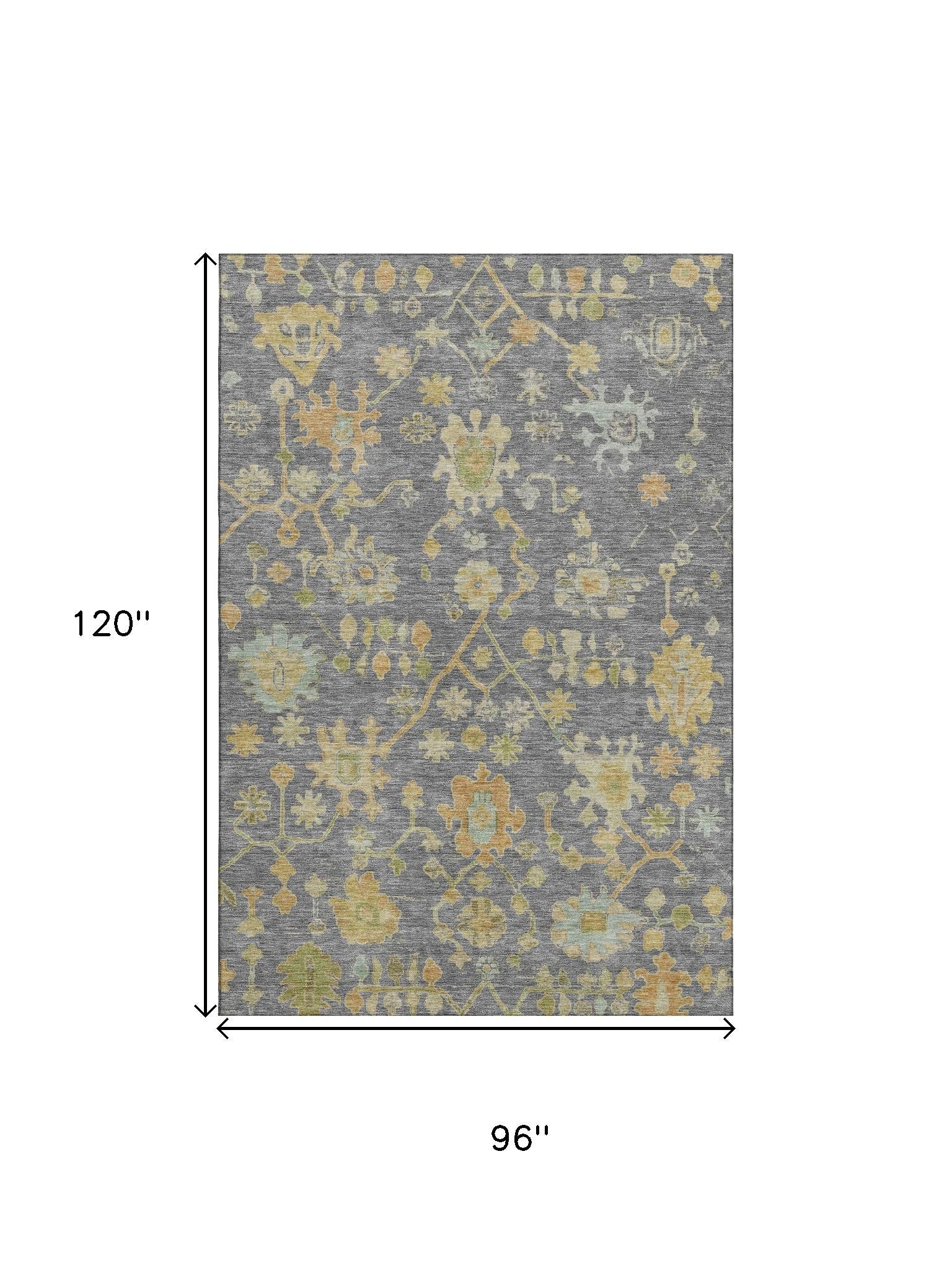 Set an inviting tone in your space with this 8-foot x 10-foot gray gold and blue floral washable area rug with uv protection. Ideal for spaces with kids and pets, this rug is stain resistant to help repel dirt and spilled liquids. Built to last, this rug crafted from polyester fibers is known for its durability and long lasting appeal. Rugs are a great way to showcase your style, hide imperfections, warm your home and reduce noise. This larger sized, traditional styled rug is ready to create a focal point or statement piece in your room. 96.00-inch h x 120.00-inch w x 0.39-inch d.