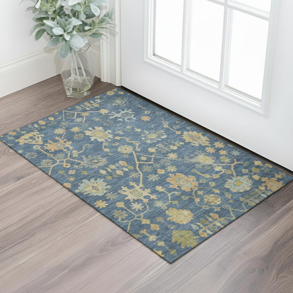 Add great coloration and comfortable texture to your space with this 3-foot x 5-foot navy blue and gold floral washable area rug with uv protection. Ideal for spaces with kids and pets, this rug is stain resistant to help repel dirt and spilled liquids. Built to last, this rug crafted from polyester fibers is known for its durability and long lasting appeal. Rugs are a great way to showcase your style, hide imperfections, warm your home and reduce noise. This smaller sized, traditional styled rug is just what you need for your walkway, bedside, in front of door, cabinet, refrigerator, or chair. 36.00-inch h x 60.00-inch w x 0.39-inch d.
