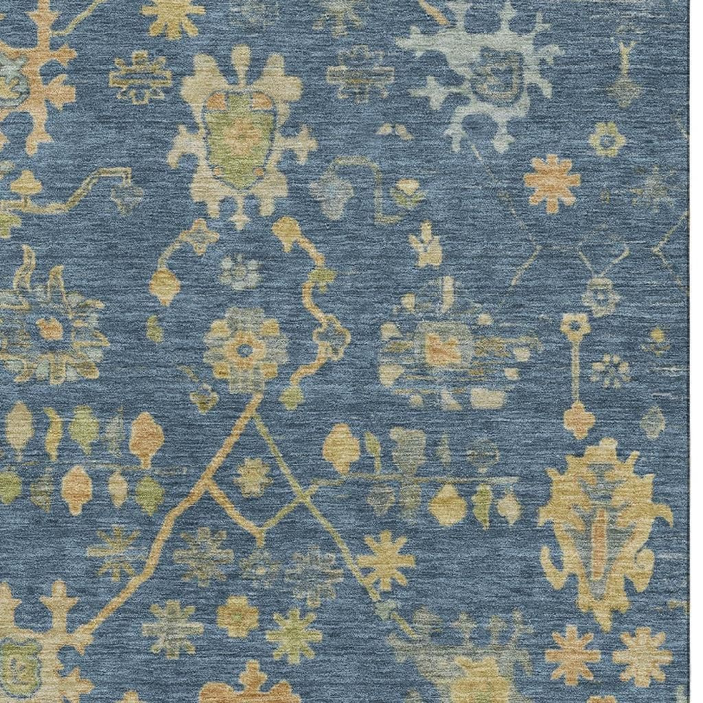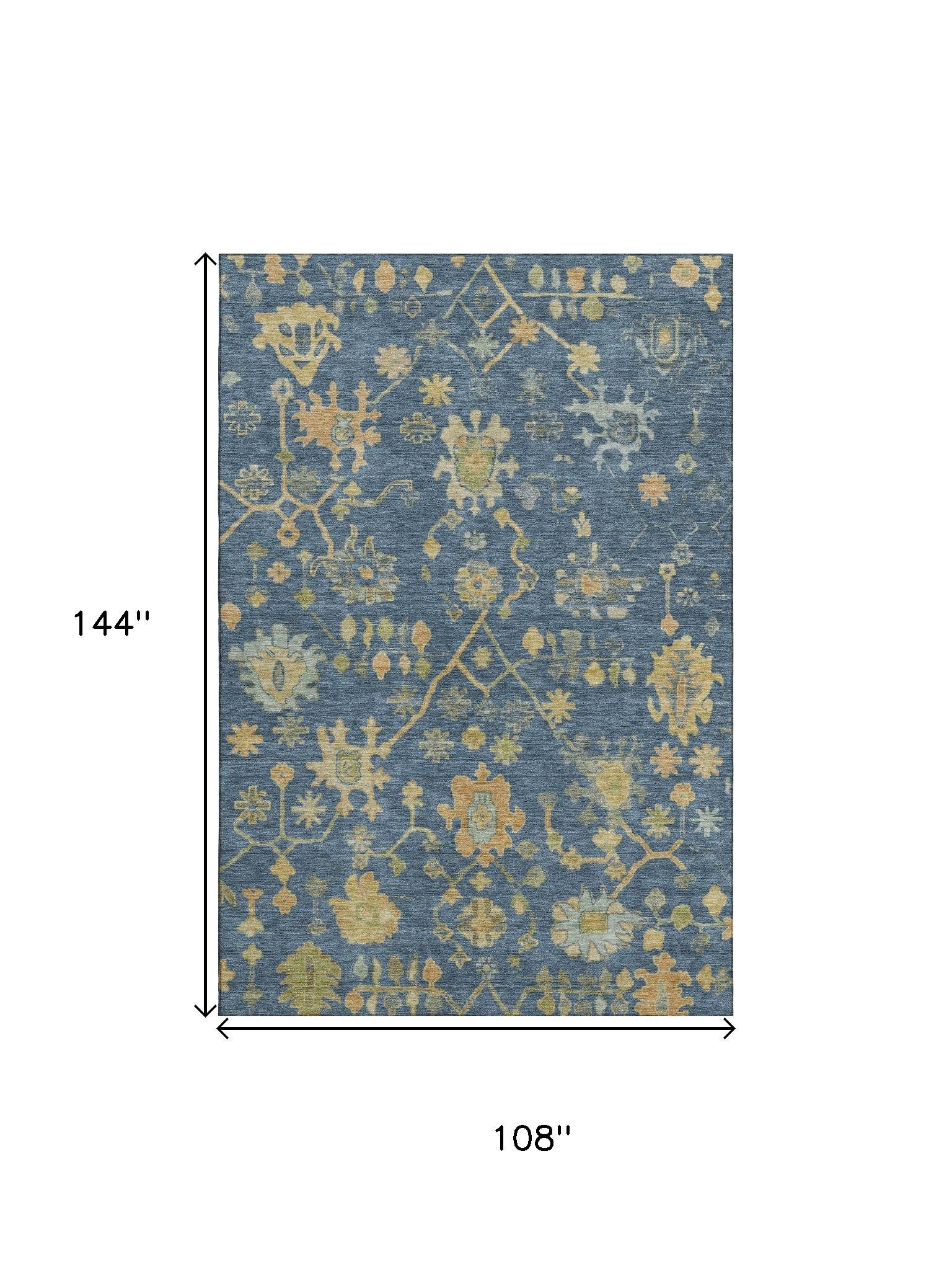 Add some artistry to your room with this 9-foot x 12-foot navy blue and gold floral washable area rug with uv protection. Ideal for spaces with kids and pets, this rug is stain resistant to help repel dirt and spilled liquids. Built to last, this rug crafted from polyester fibers is known for its durability and long lasting appeal. Rugs are a great way to showcase your style, hide imperfections, warm your home and reduce noise. This larger sized, traditional styled rug is ready to create a focal point or statement piece in your room. 108.00-inch h x 144.00-inch w x 0.39-inch d.