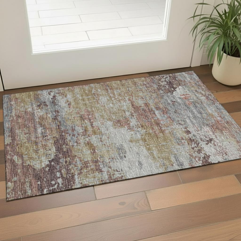 Set an inviting tone in your space with this 3-foot x 5-foot green purple and gold abstract washable area rug with uv protection. Ideal for spaces with kids and pets, this rug is stain resistant to help repel dirt and spilled liquids. Built to last, this rug crafted from polyester fibers is known for its durability and long lasting appeal. Rugs are a great way to showcase your style, hide imperfections, warm your home and reduce noise. This smaller sized, transitional styled rug is just what you need for your walkway, bedside, in front of door, cabinet, refrigerator, or chair. 36.00-inch h x 60.00-inch w x 0.39-inch d.