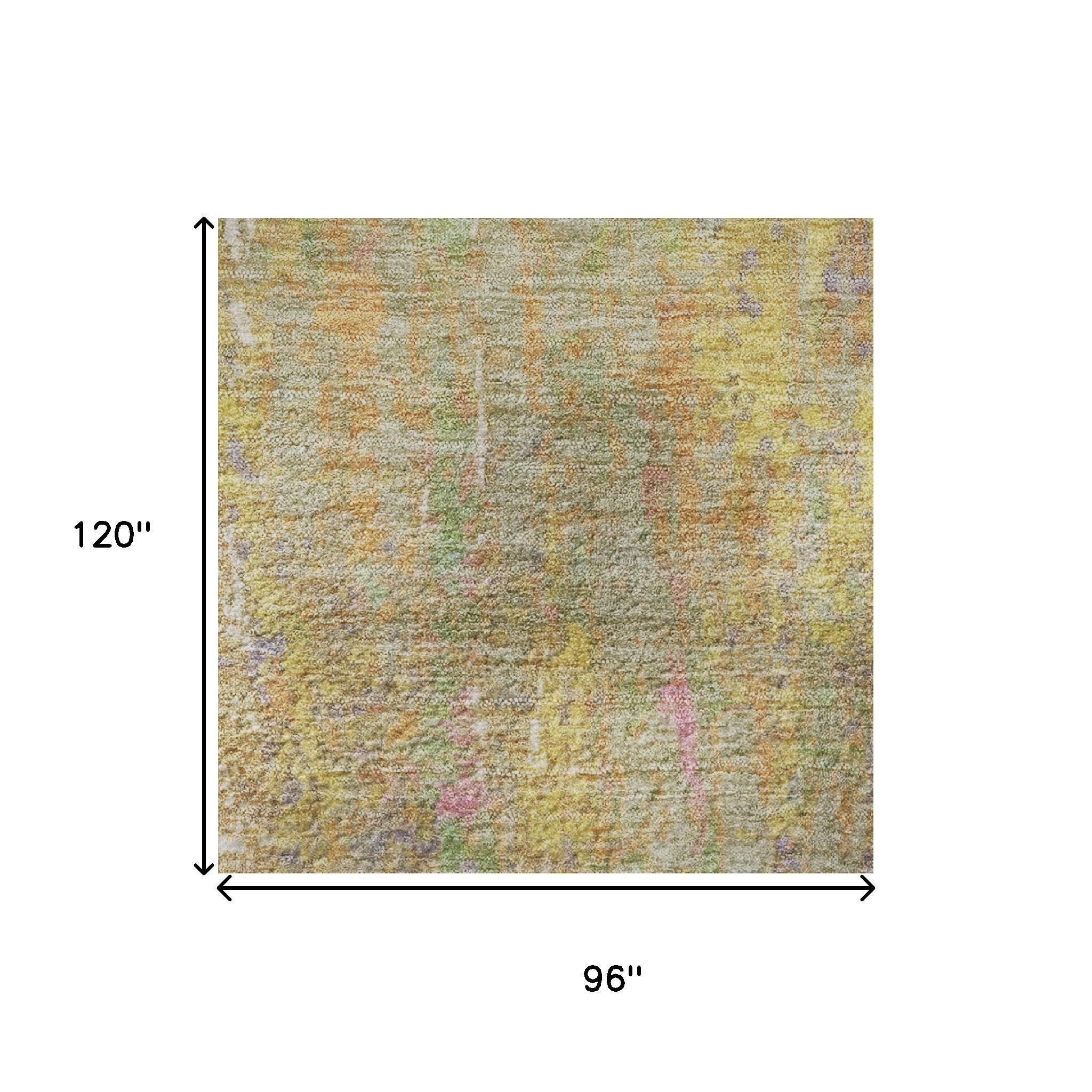 Set an inviting tone in your space with this 8-foot x 10-foot green purple and gold abstract washable area rug with uv protection. Ideal for spaces with kids and pets, this rug is stain resistant to help repel dirt and spilled liquids. Built to last, this rug crafted from polyester fibers is known for its durability and long lasting appeal. Rugs are a great way to showcase your style, hide imperfections, warm your home and reduce noise. This larger sized, transitional styled rug is ready to create a focal point or statement piece in your room. 96.00-inch h x 120.00-inch w x 0.39-inch d.