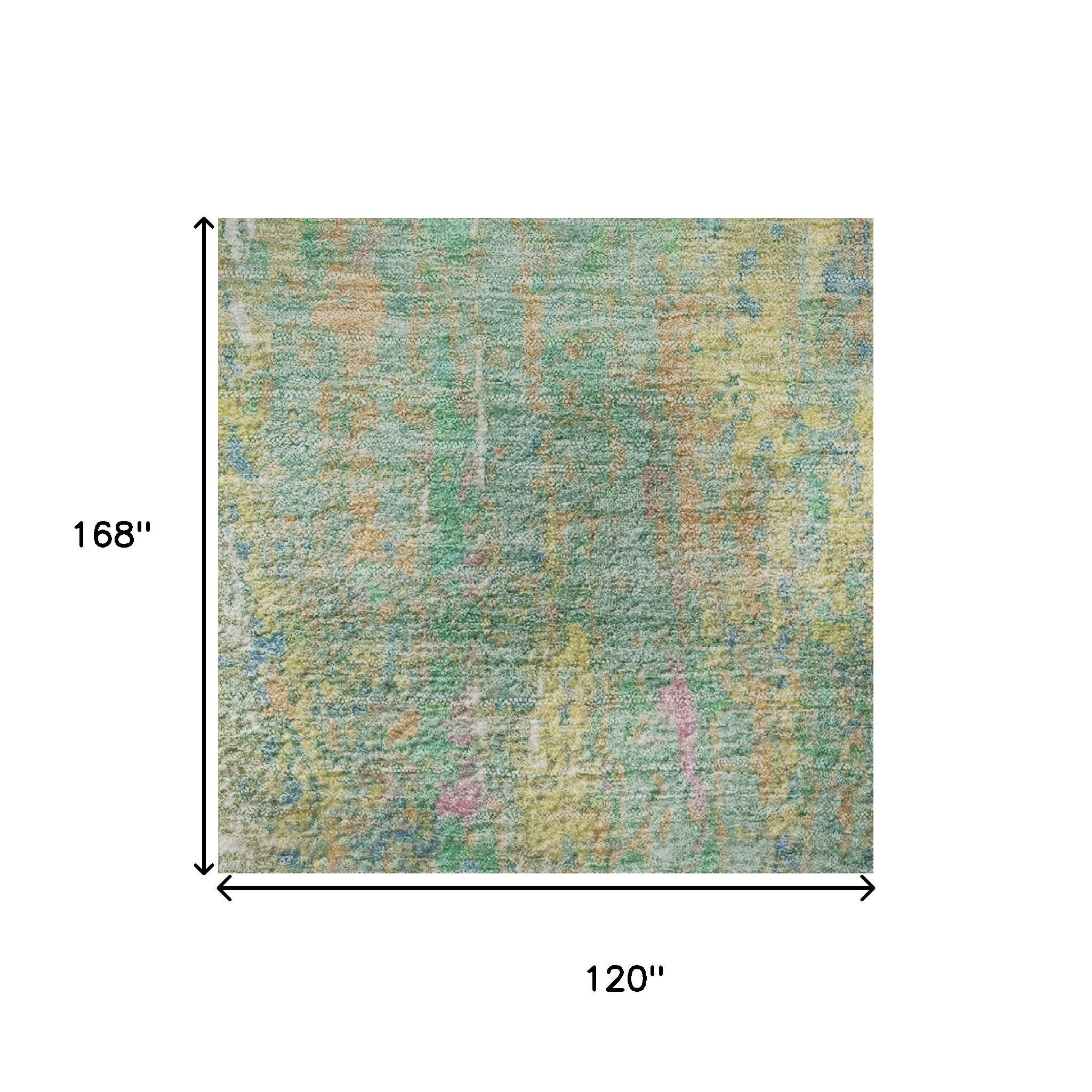 Add some artistry to your room with this 10-foot x 14-foot teal purple and gold abstract washable area rug with uv protection. Ideal for spaces with kids and pets, this rug is stain resistant to help repel dirt and spilled liquids. Built to last, this rug crafted from polyester fibers is known for its durability and long lasting appeal. Rugs are a great way to showcase your style, hide imperfections, warm your home and reduce noise. This larger sized, transitional styled rug is ready to create a focal point or statement piece in your room. 120.00-inch h x 168.00-inch w x 0.39-inch d.