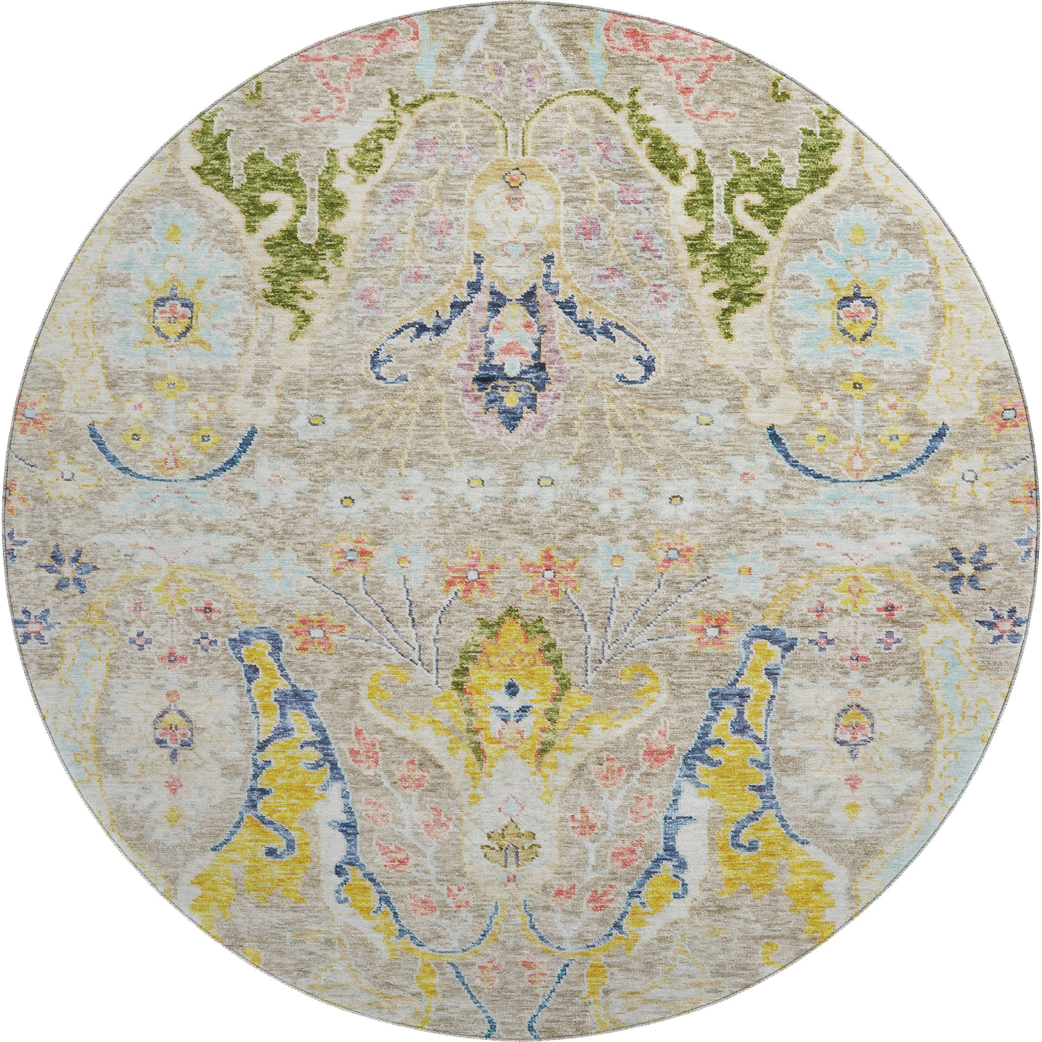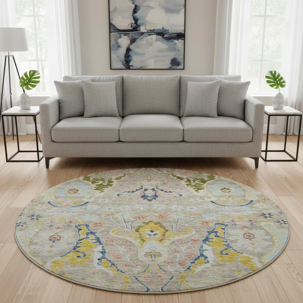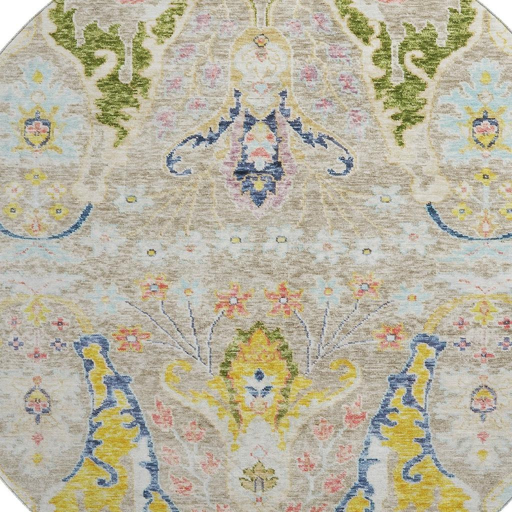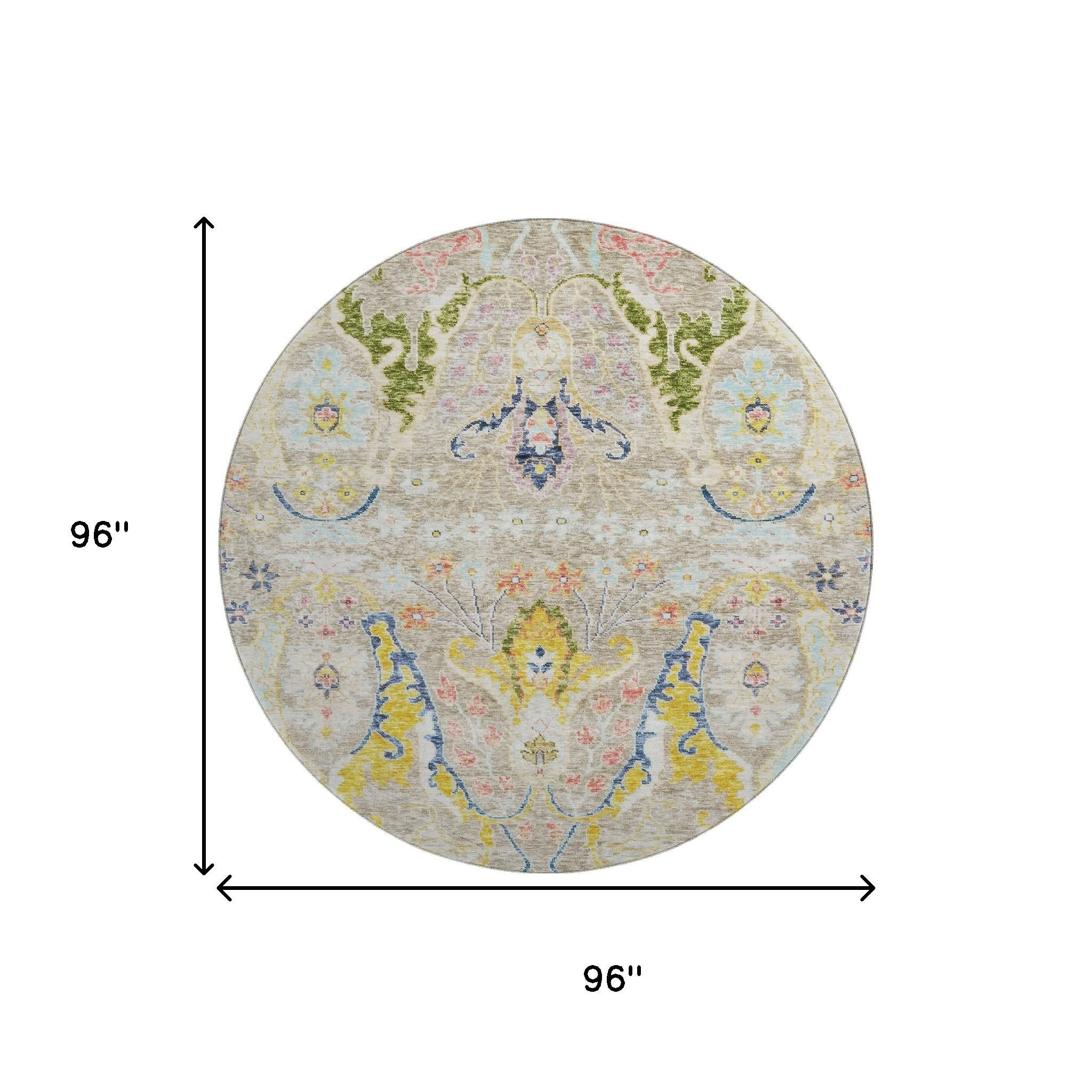 Add some artistry to your room with this 8-foot beige blue and gold floral washable round rug with uv protection. Ideal for spaces with kids and pets, this rug is stain resistant to help repel dirt and spilled liquids. Built to last, this rug crafted from polyester fibers is known for its durability and long lasting appeal. Rugs are a great way to showcase your style, hide imperfections, warm your home and reduce noise. This larger sized, transitional styled rug is ready to create a focal point or statement piece in your room. 96.00-inch h x 96.00-inch w x 0.39-inch d.