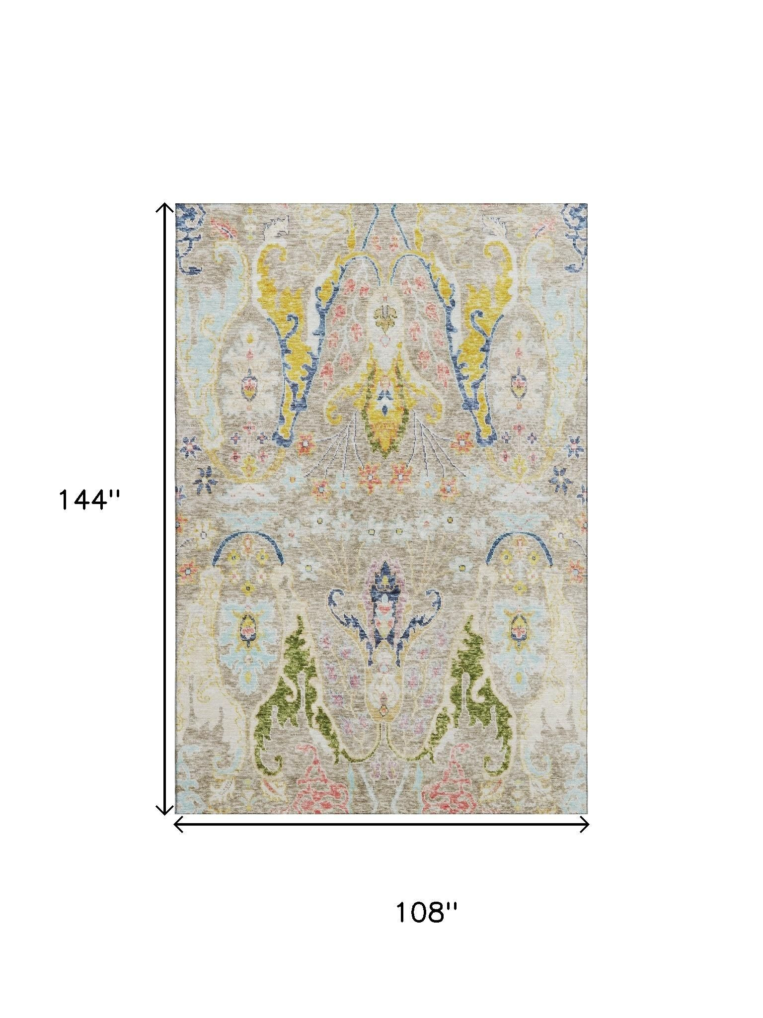 This 9-foot x 12-foot beige blue and gold floral washable area rug with uv protection, is a great way to add warmth to a room. Ideal for spaces with kids and pets, this rug is stain resistant to help repel dirt and spilled liquids. Built to last, this rug crafted from polyester fibers is known for its durability and long lasting appeal. Rugs are a great way to showcase your style, hide imperfections, warm your home and reduce noise. This larger sized, transitional styled rug is ready to create a focal point or statement piece in your room. 108.00-inch h x 144.00-inch w x 0.39-inch d.