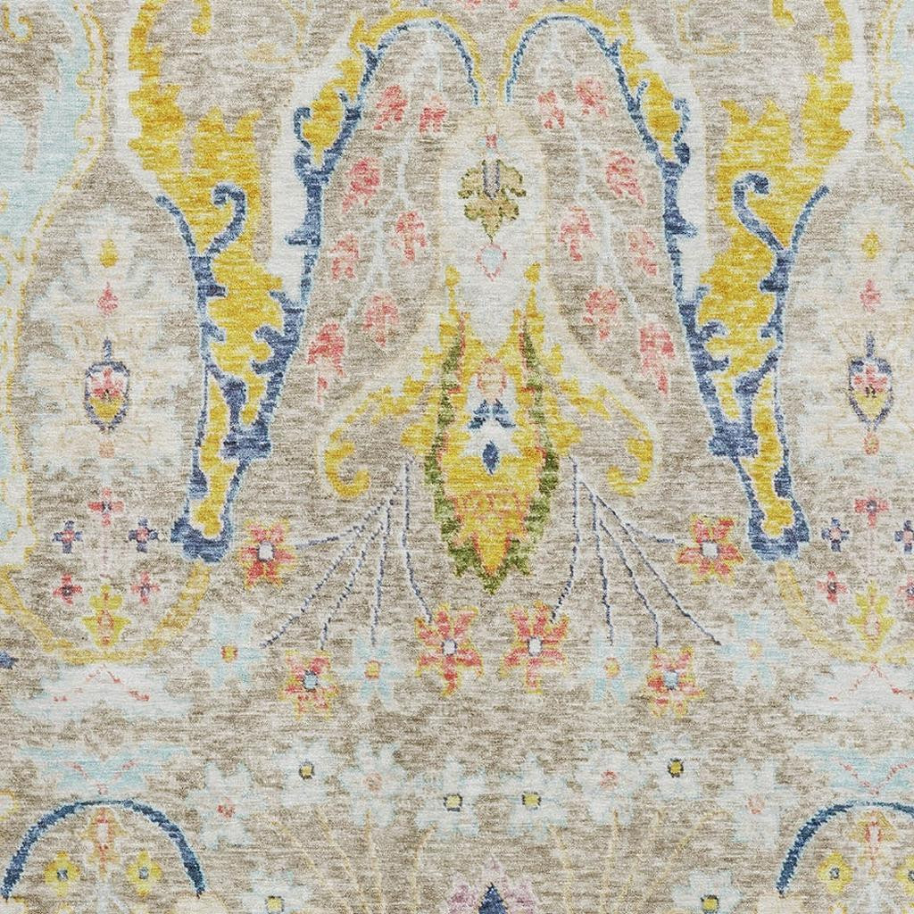 This 10-foot x 14-foot beige blue and gold floral washable area rug with uv protection, is a great way to add warmth to a room. Ideal for spaces with kids and pets, this rug is stain resistant to help repel dirt and spilled liquids. Built to last, this rug crafted from polyester fibers is known for its durability and long lasting appeal. Rugs are a great way to showcase your style, hide imperfections, warm your home and reduce noise. This larger sized, transitional styled rug is ready to create a focal point or statement piece in your room. 120.00-inch h x 168.00-inch w x 0.39-inch d.