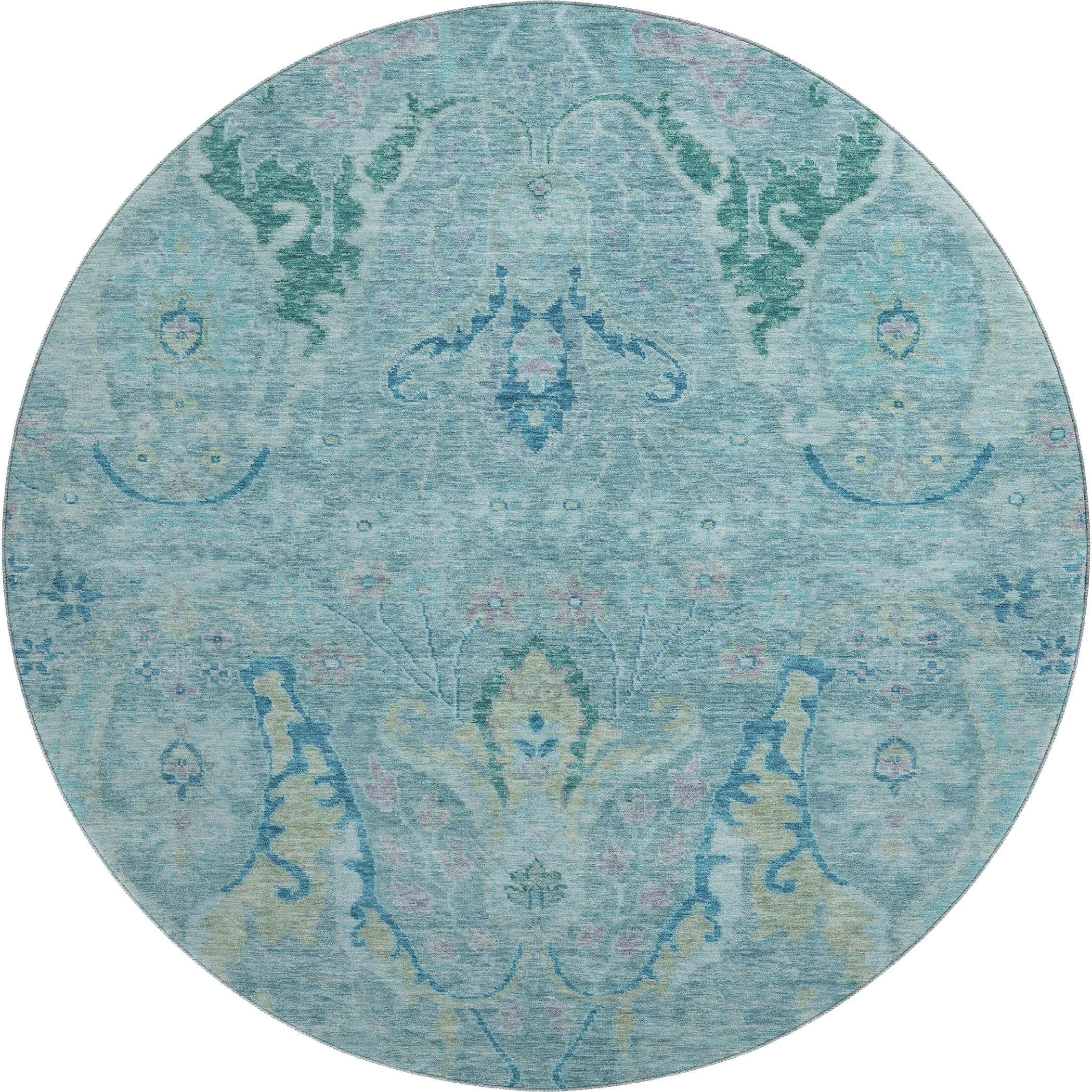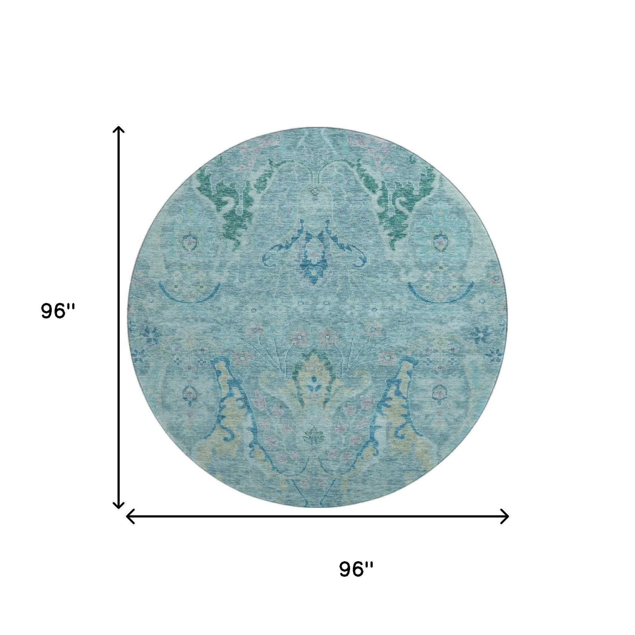Add some artistry to your room with this 8-foot blue teal and artichoke green floral washable round rug with uv protection. Ideal for spaces with kids and pets, this rug is stain resistant to help repel dirt and spilled liquids. Built to last, this rug crafted from polyester fibers is known for its durability and long lasting appeal. Rugs are a great way to showcase your style, hide imperfections, warm your home and reduce noise. This larger sized, transitional styled rug is ready to create a focal point or statement piece in your room. 96.00-inch h x 96.00-inch w x 0.39-inch d.