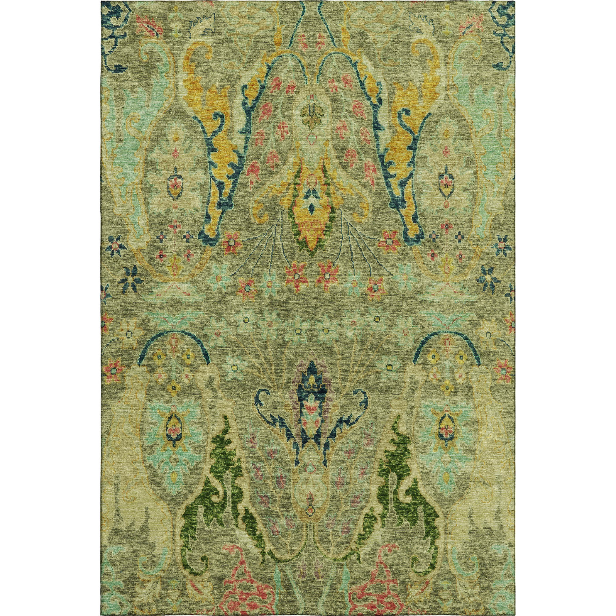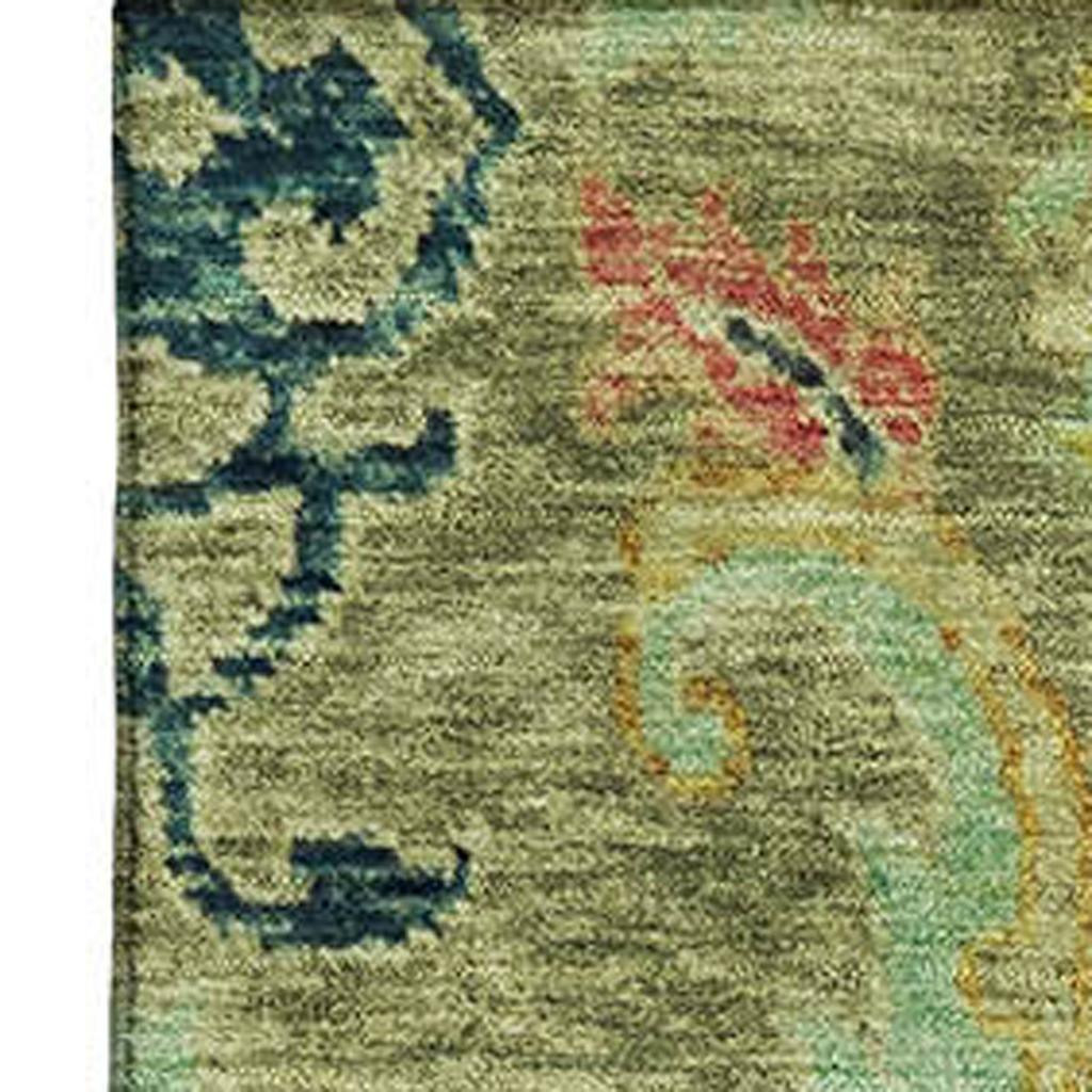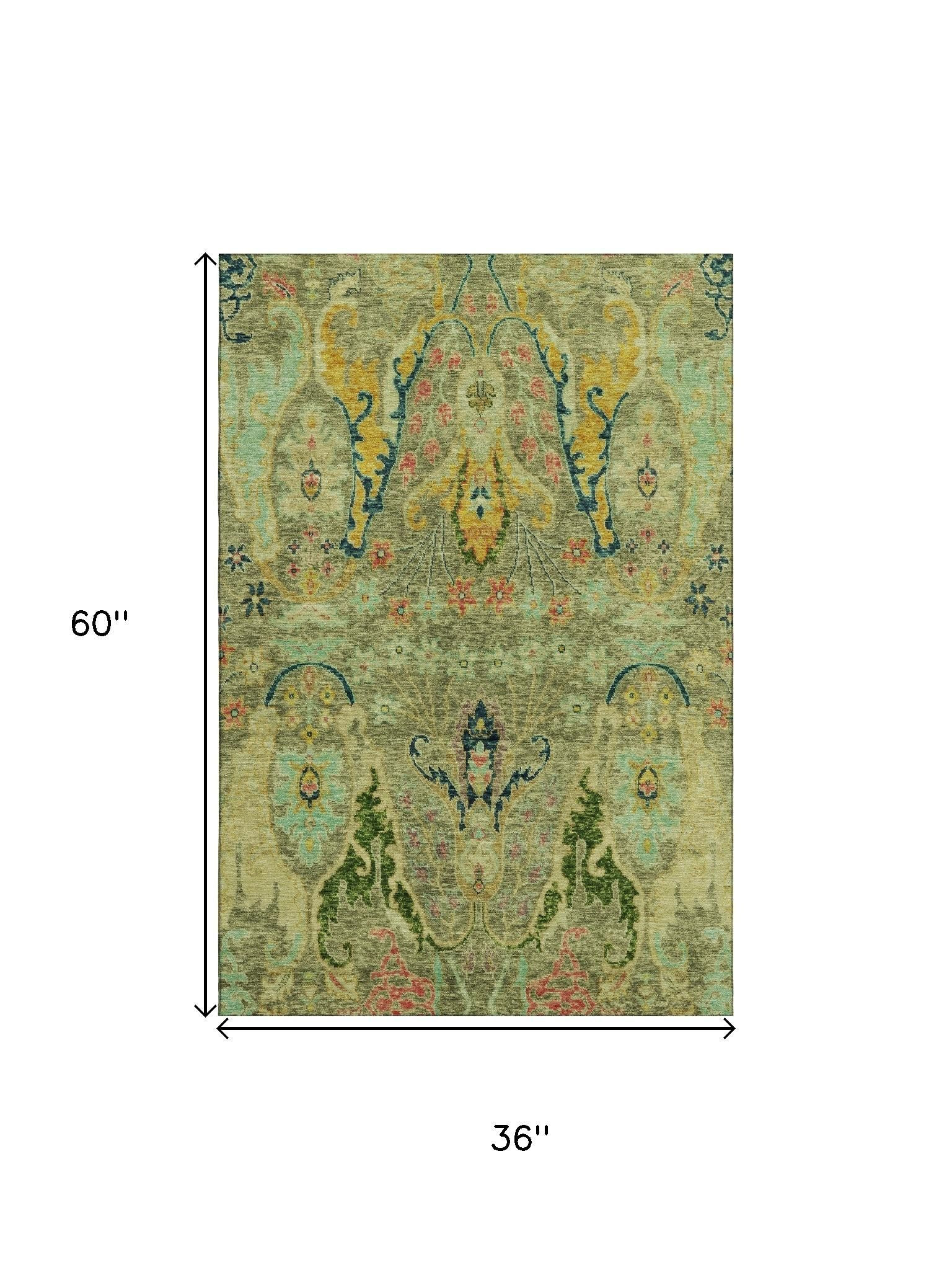 Set an inviting tone in your space with this 3-foot x 5-foot green blue and gold floral washable area rug with uv protection. Ideal for spaces with kids and pets, this rug is stain resistant to help repel dirt and spilled liquids. Built to last, this rug crafted from polyester fibers is known for its durability and long lasting appeal. Rugs are a great way to showcase your style, hide imperfections, warm your home and reduce noise. This smaller sized, transitional styled rug is just what you need for your walkway, bedside, in front of door, cabinet, refrigerator, or chair. 36.00-inch h x 60.00-inch w x 0.39-inch d.