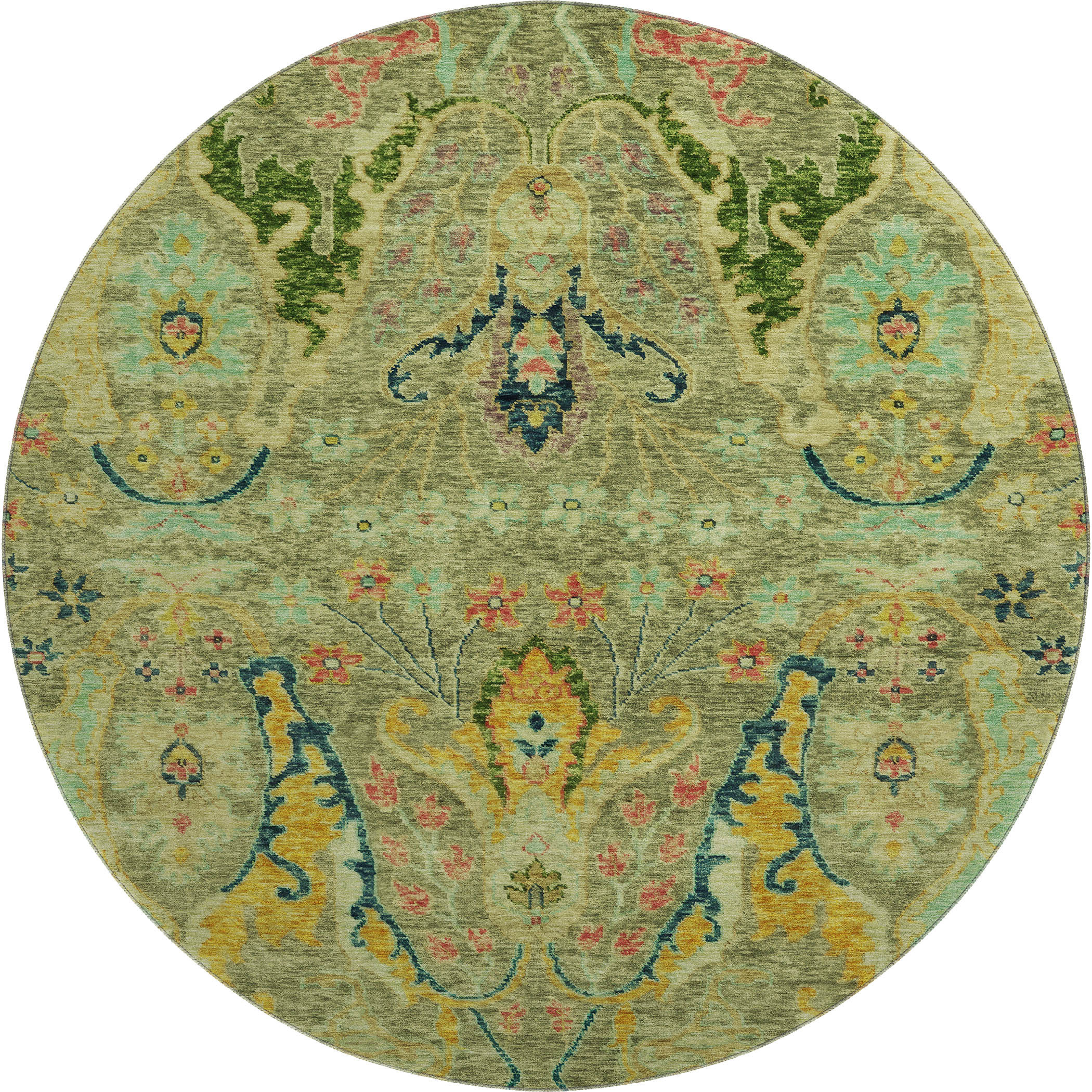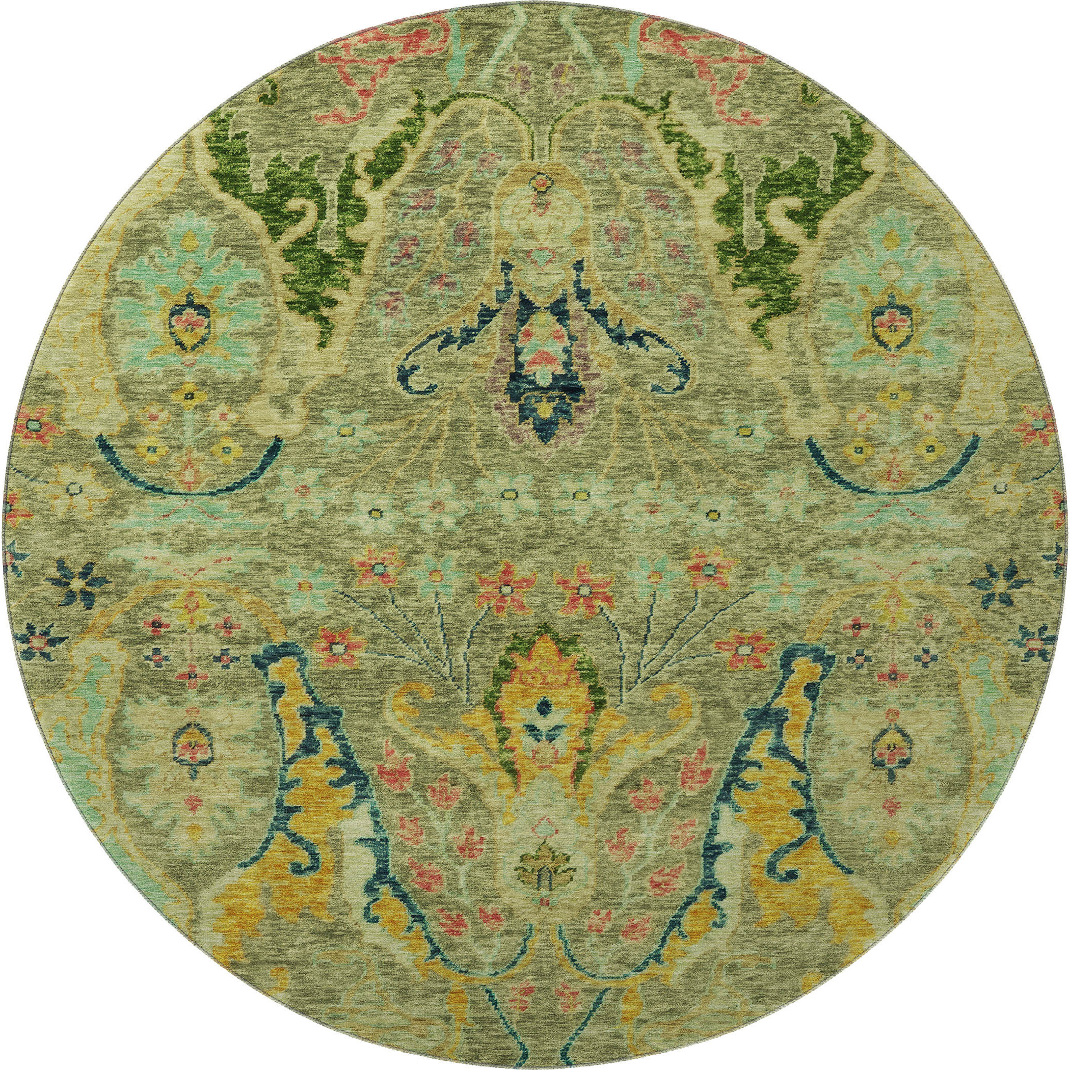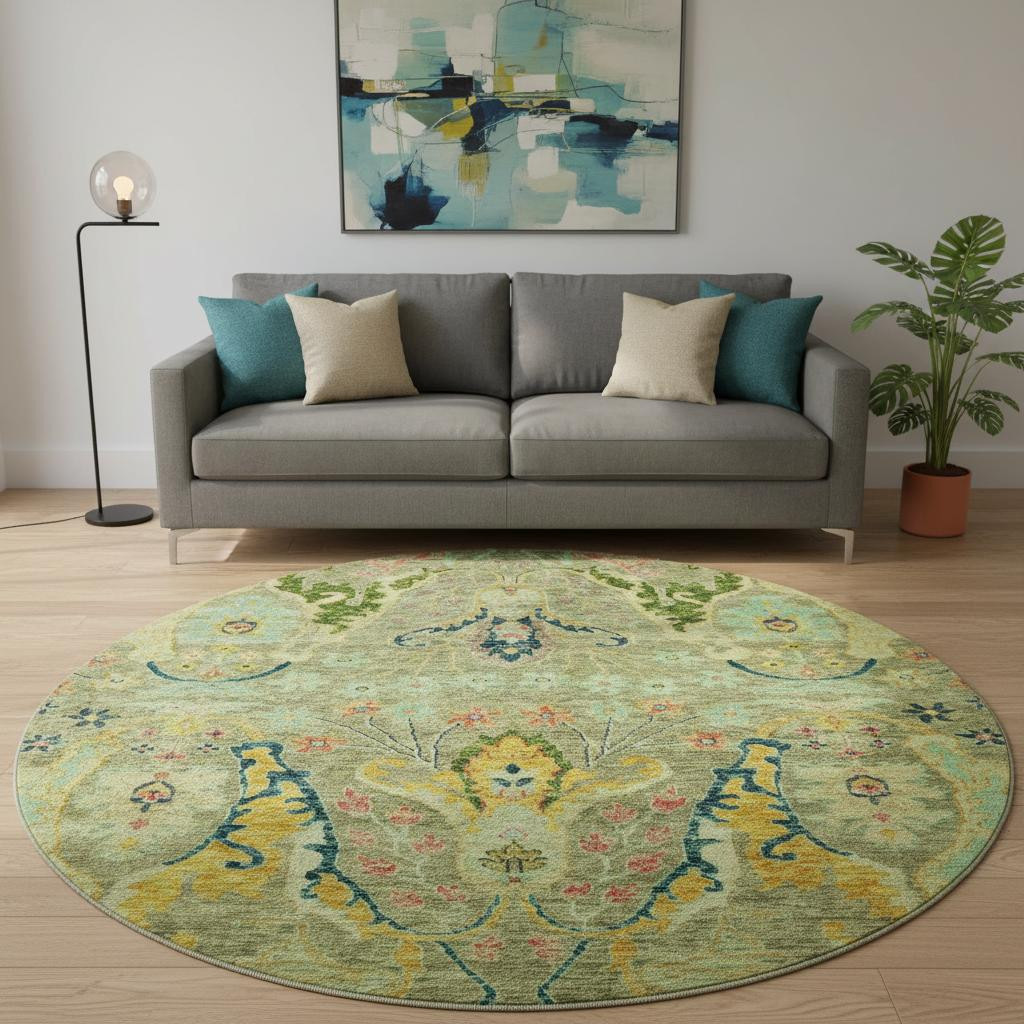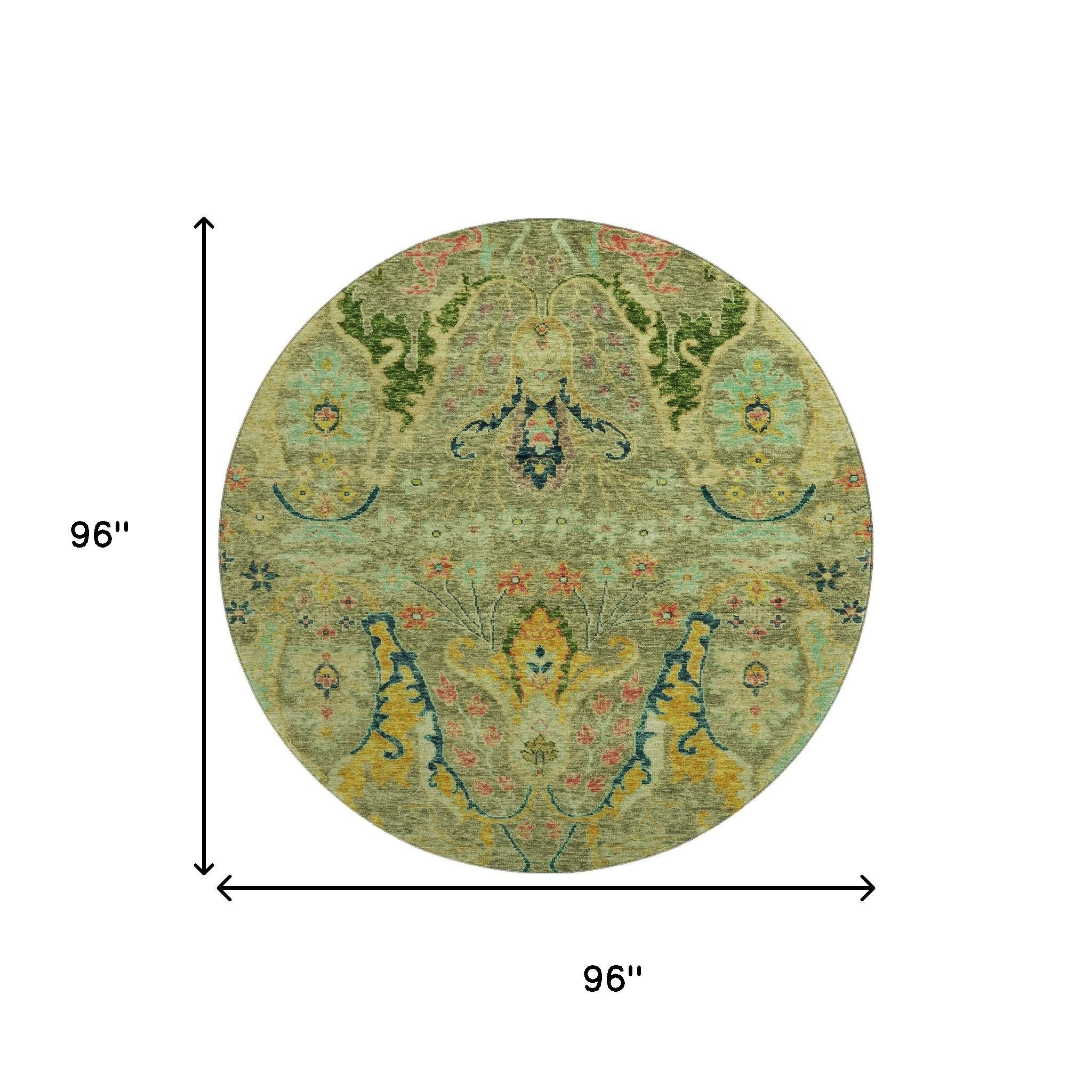 This 8-foot green blue and gold floral washable round rug with uv protection, is a great way to add warmth to a room. Ideal for spaces with kids and pets, this rug is stain resistant to help repel dirt and spilled liquids. Built to last, this rug crafted from polyester fibers is known for its durability and long lasting appeal. Rugs are a great way to showcase your style, hide imperfections, warm your home and reduce noise. This larger sized, transitional styled rug is ready to create a focal point or statement piece in your room. 96.00-inch h x 96.00-inch w x 0.39-inch d.