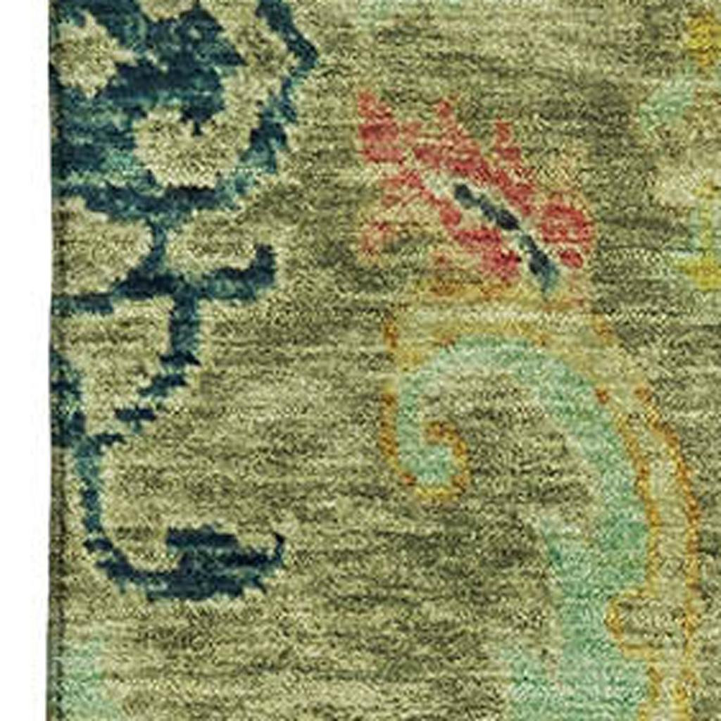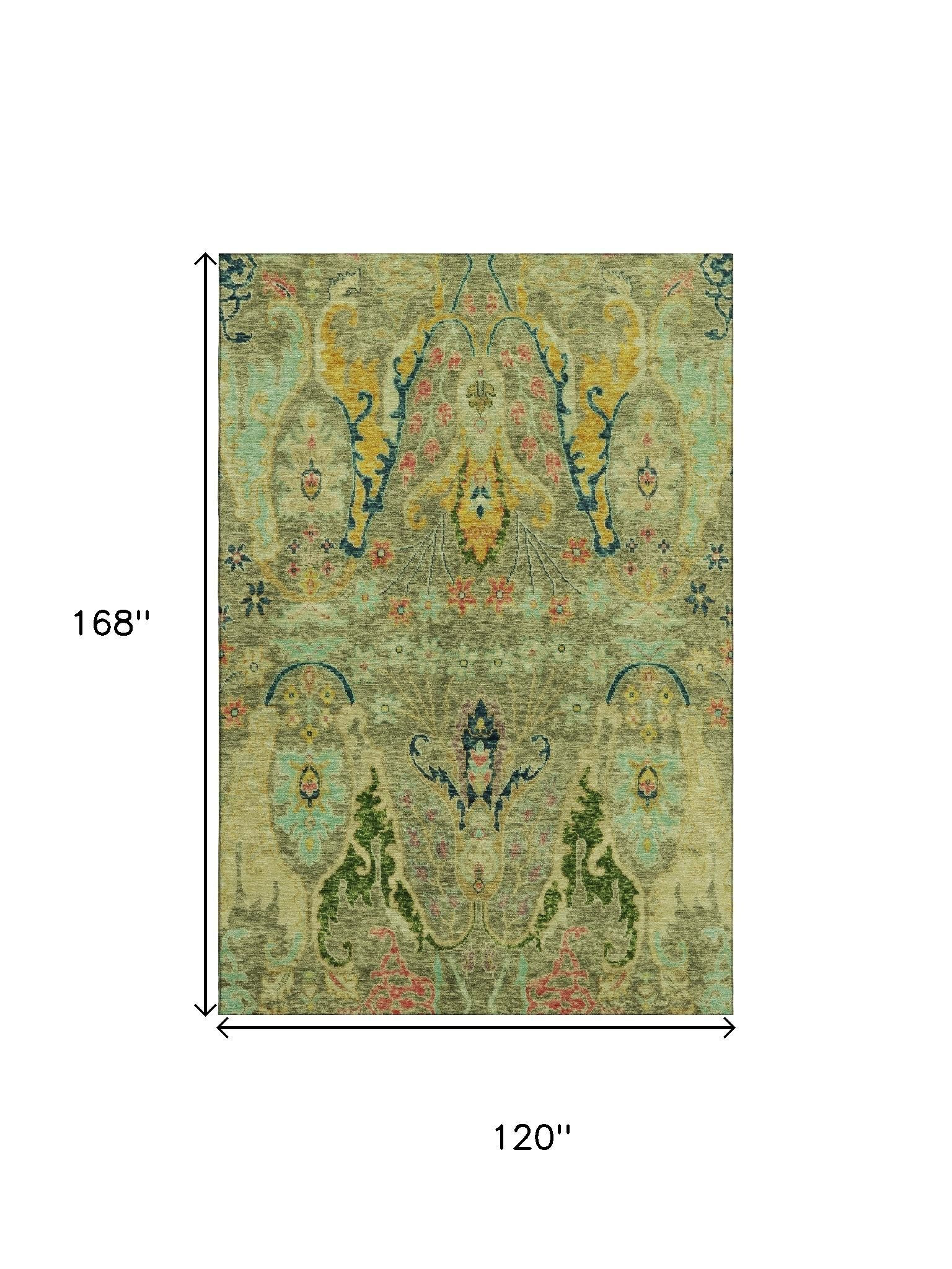 Set an inviting tone in your space with this 10-foot x 14-foot green blue and gold floral washable area rug with uv protection. Ideal for spaces with kids and pets, this rug is stain resistant to help repel dirt and spilled liquids. Built to last, this rug crafted from polyester fibers is known for its durability and long lasting appeal. Rugs are a great way to showcase your style, hide imperfections, warm your home and reduce noise. This larger sized, transitional styled rug is ready to create a focal point or statement piece in your room. 120.00-inch h x 168.00-inch w x 0.39-inch d.