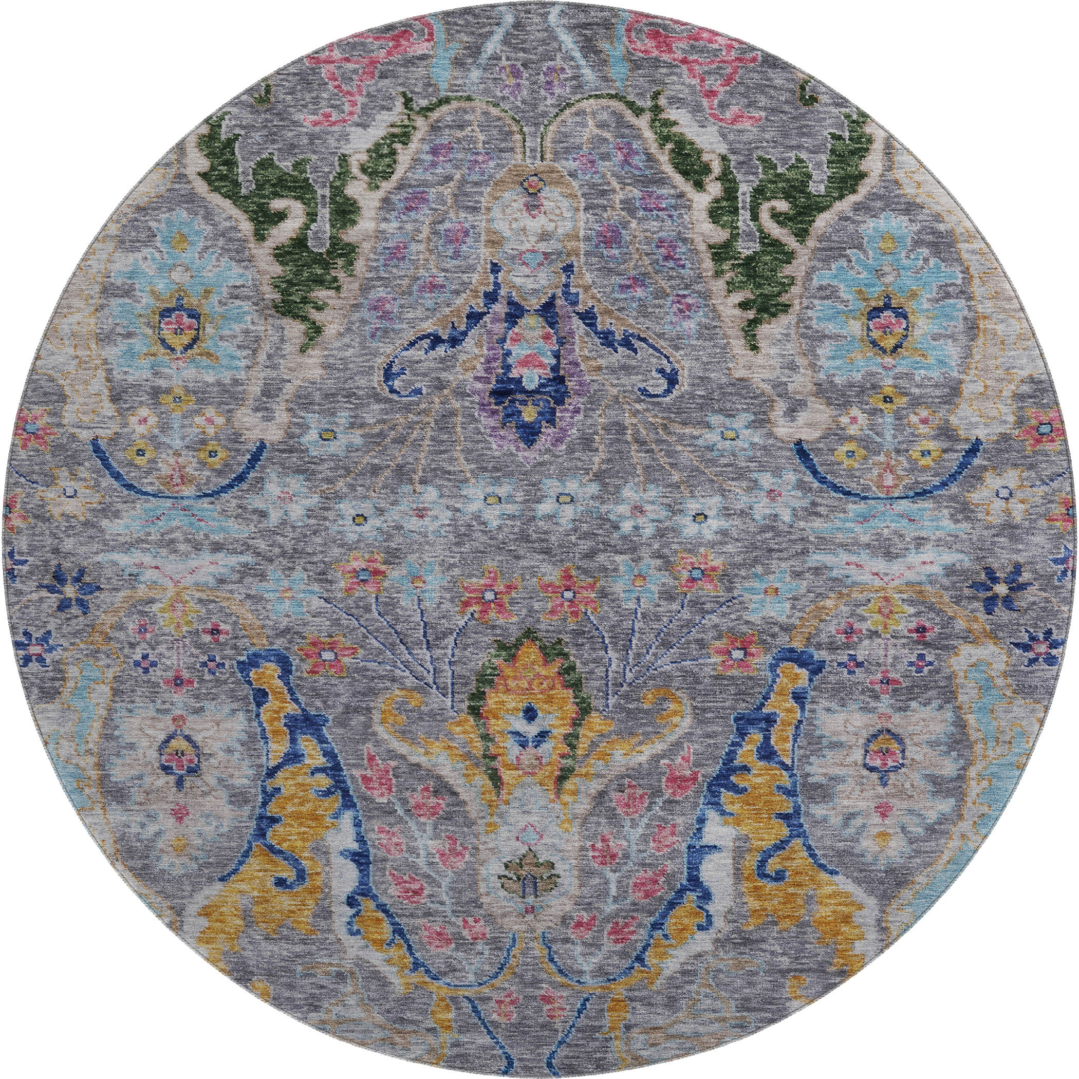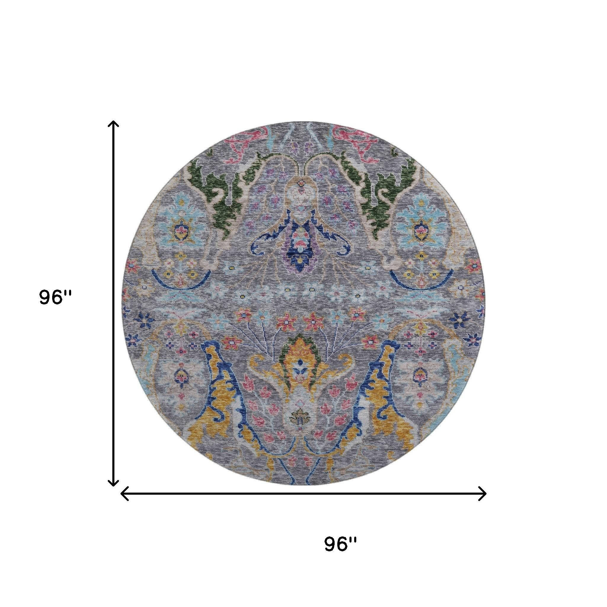 Add some artistry to your room with this 8-foot gray blue and gold floral washable round rug with uv protection. Ideal for spaces with kids and pets, this rug is stain resistant to help repel dirt and spilled liquids. Built to last, this rug crafted from polyester fibers is known for its durability and long lasting appeal. Rugs are a great way to showcase your style, hide imperfections, warm your home and reduce noise. This larger sized, transitional styled rug is ready to create a focal point or statement piece in your room. 96.00-inch h x 96.00-inch w x 0.39-inch d.