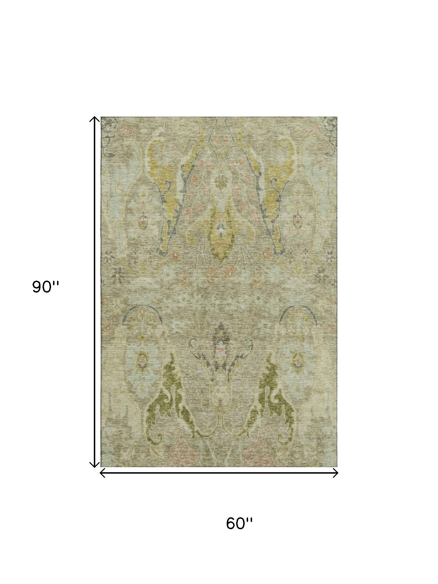 This 5-foot x 8-foot khaki gold and beige floral washable area rug with uv protection, is a great way to add warmth to a room. Ideal for spaces with kids and pets, this rug is stain resistant to help repel dirt and spilled liquids. Built to last, this rug crafted from polyester fibers is known for its durability and long lasting appeal. Rugs are a great way to showcase your style, hide imperfections, warm your home and reduce noise. This larger sized, transitional styled rug is ready to create a focal point or statement piece in your room. 60.00-inch h x 90.00-inch w x 0.39-inch d.