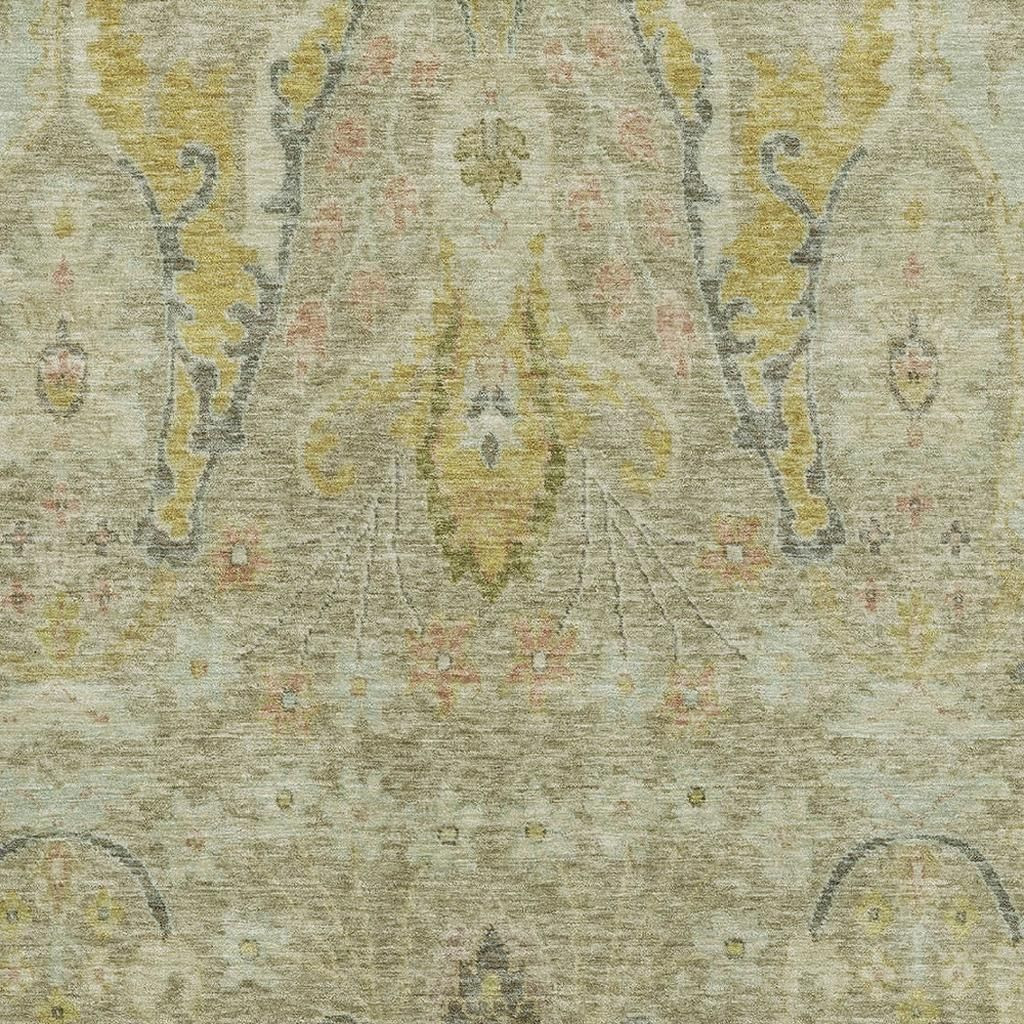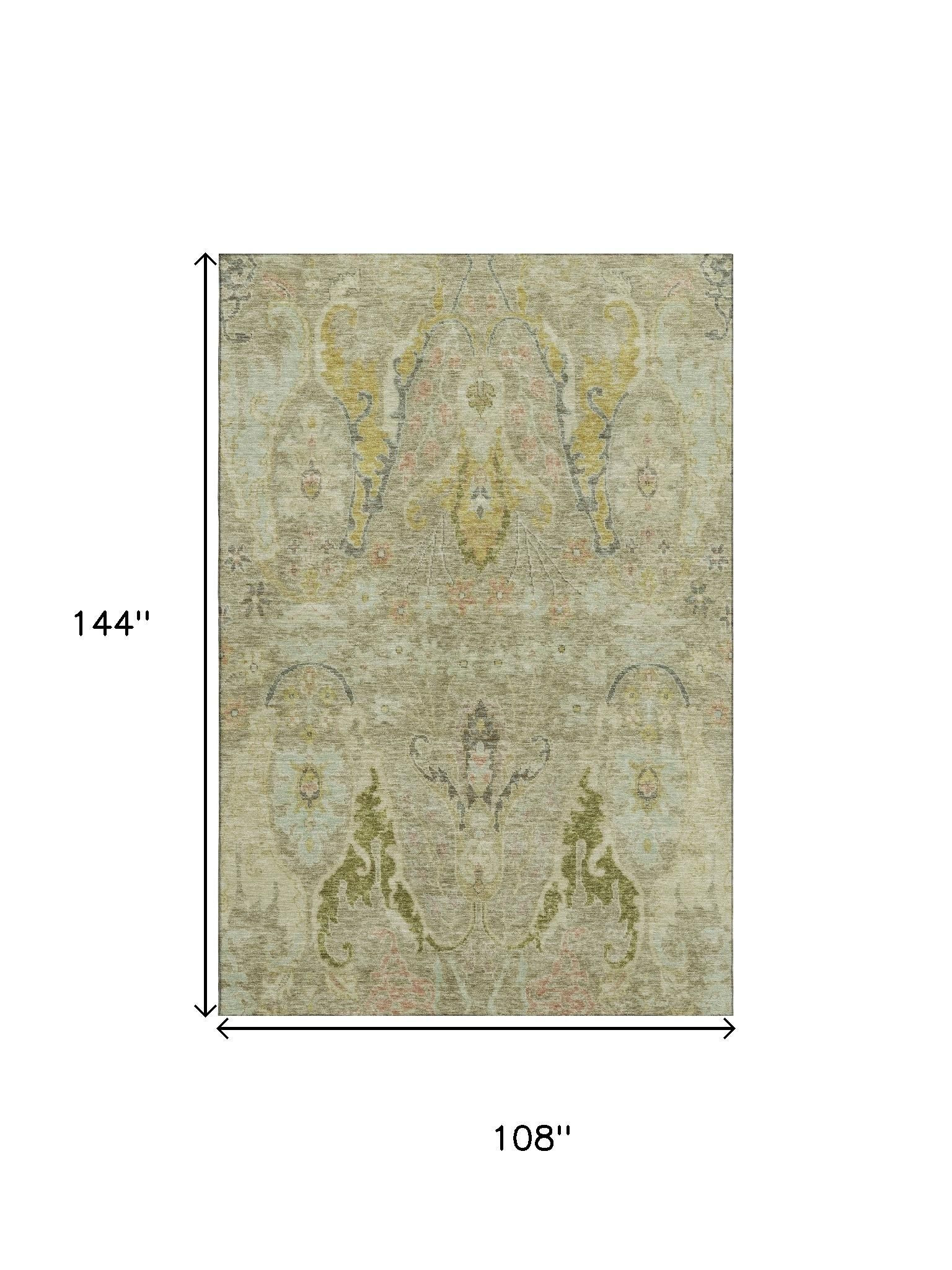 Set an inviting tone in your space with this 9-foot x 12-foot khaki gold and beige floral washable area rug with uv protection. Ideal for spaces with kids and pets, this rug is stain resistant to help repel dirt and spilled liquids. Built to last, this rug crafted from polyester fibers is known for its durability and long lasting appeal. Rugs are a great way to showcase your style, hide imperfections, warm your home and reduce noise. This larger sized, transitional styled rug is ready to create a focal point or statement piece in your room. 108.00-inch h x 144.00-inch w x 0.39-inch d.